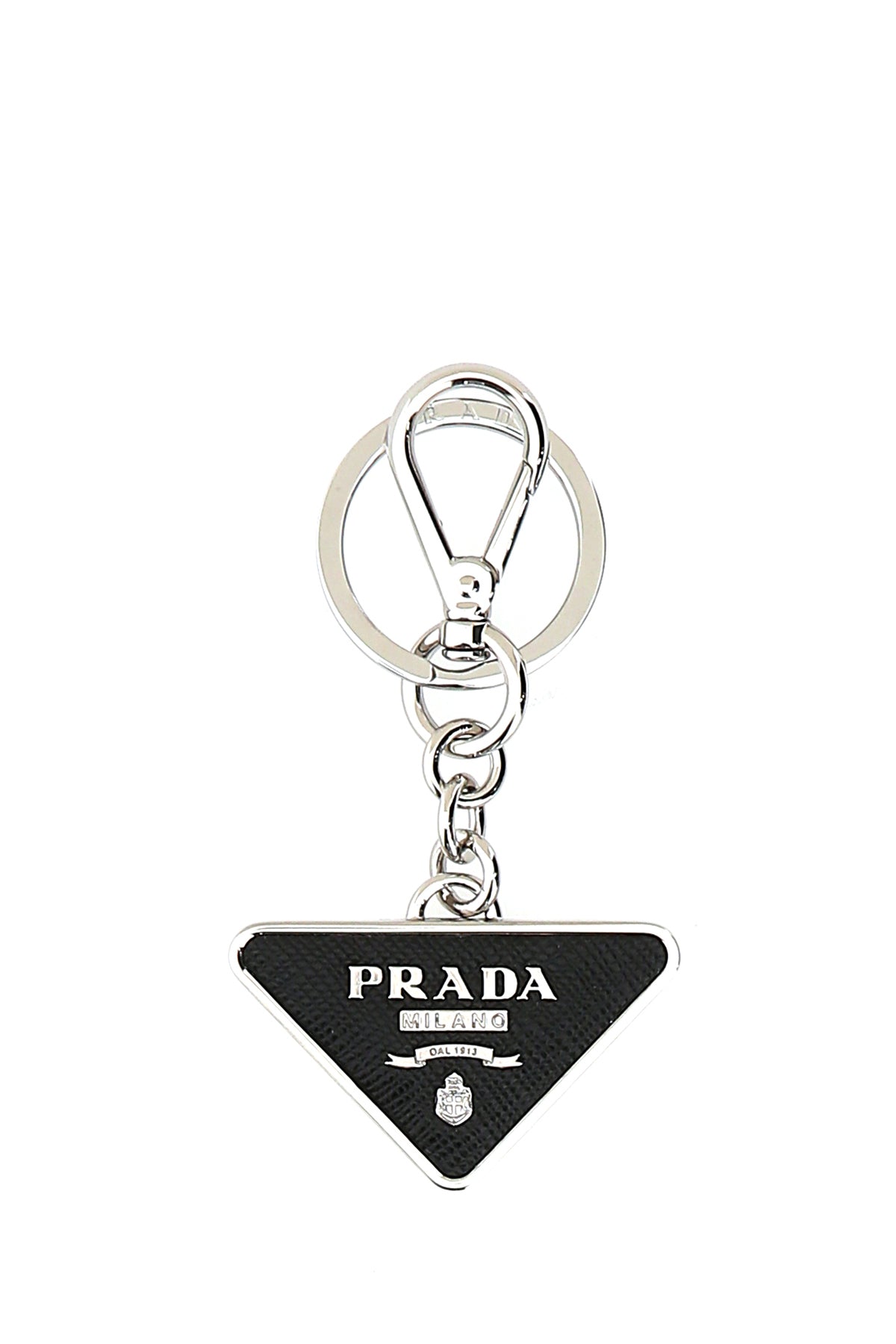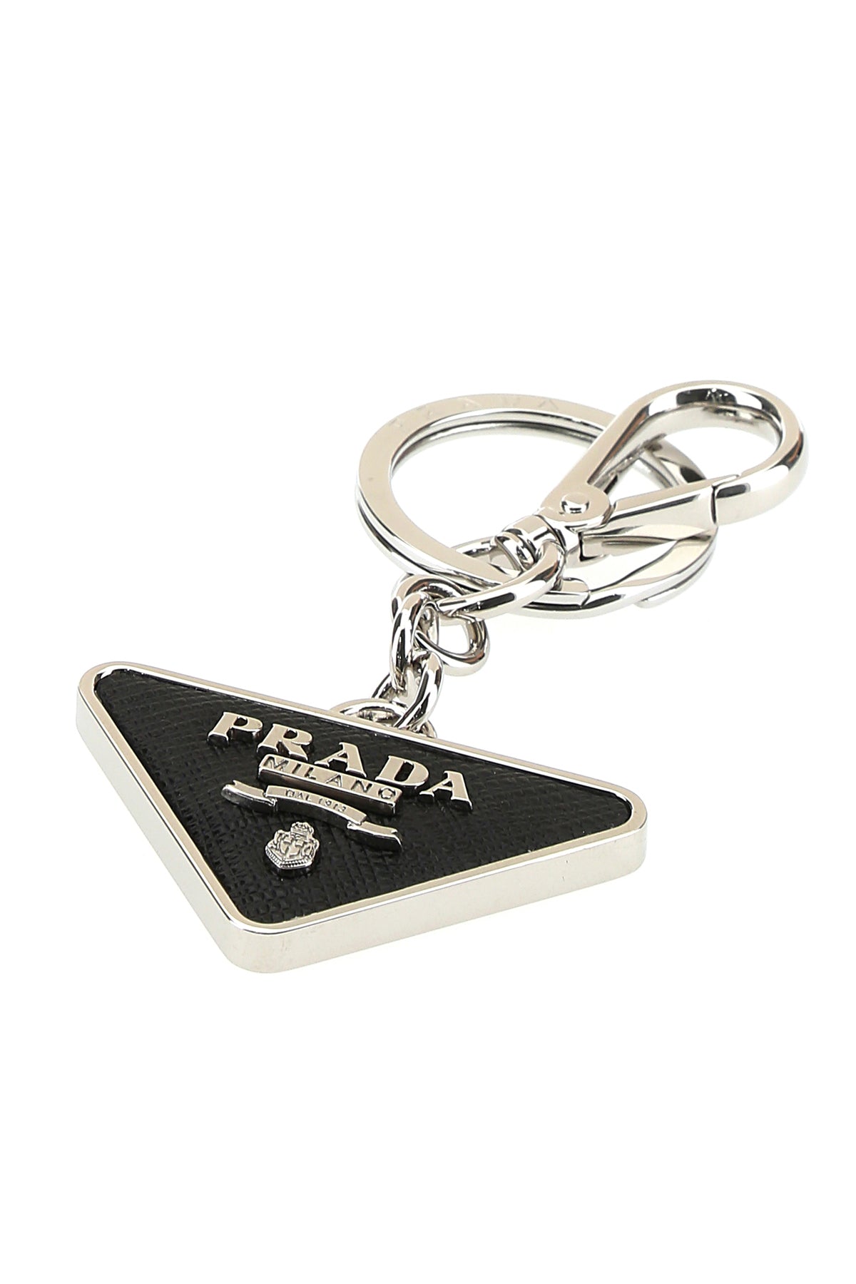 Iconic triangle-shaped keychain realized in Saffiano leather and metal characterized by embossed logo at the back enriched by metal lettering logo at the front.
