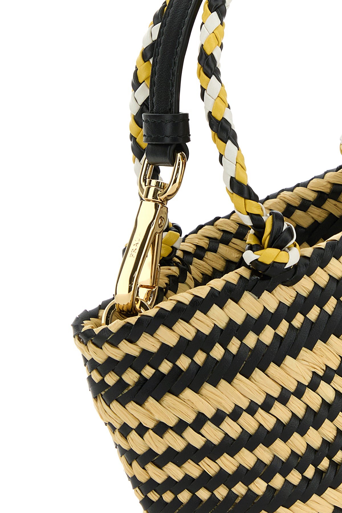 Handbag realized in raffia enriched by iconic logoed metal triangle at the front.