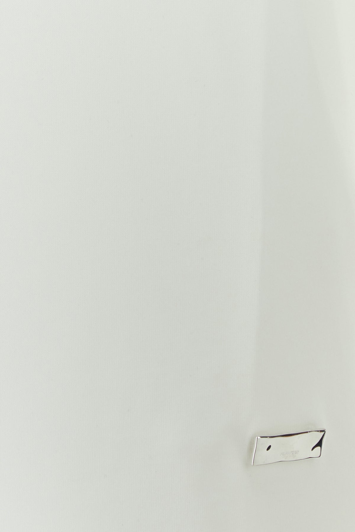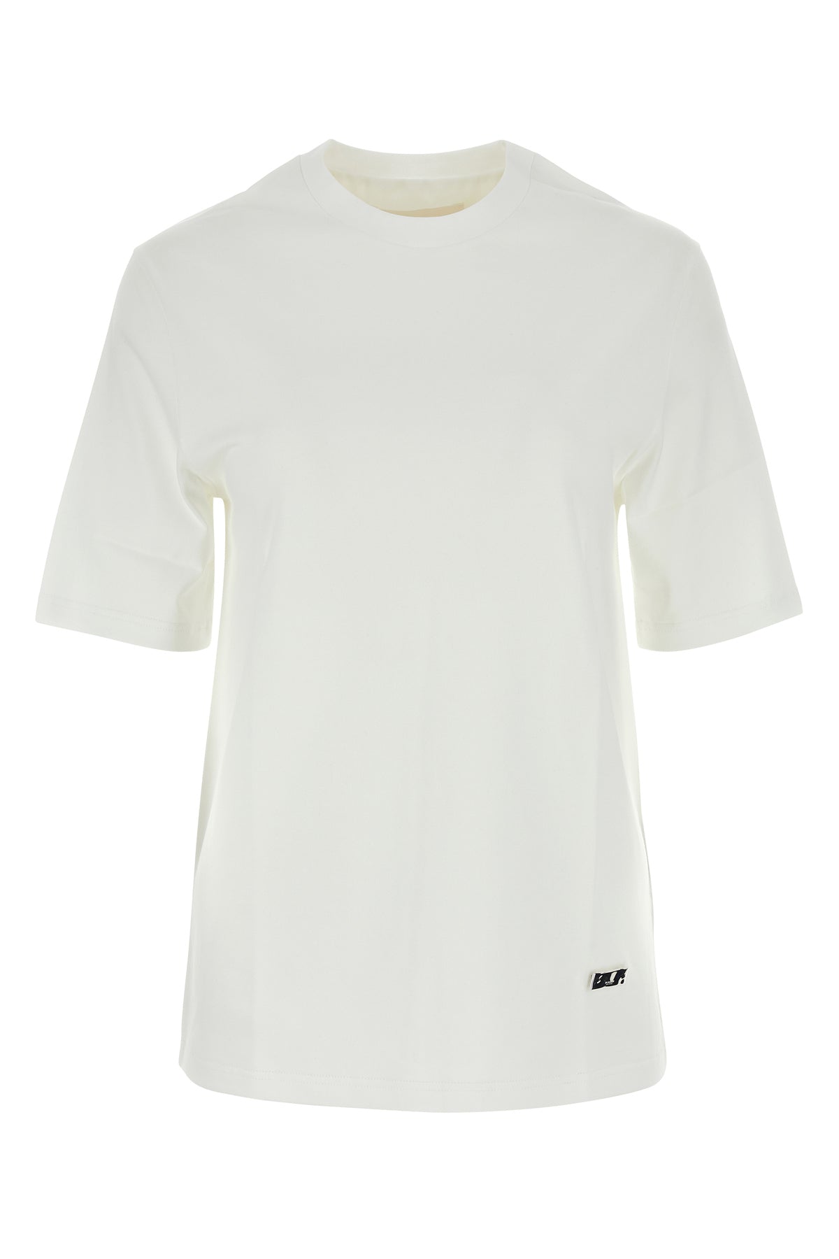 T-shirt realized in pure cotton enriched by metal logoed plate on the hemline.