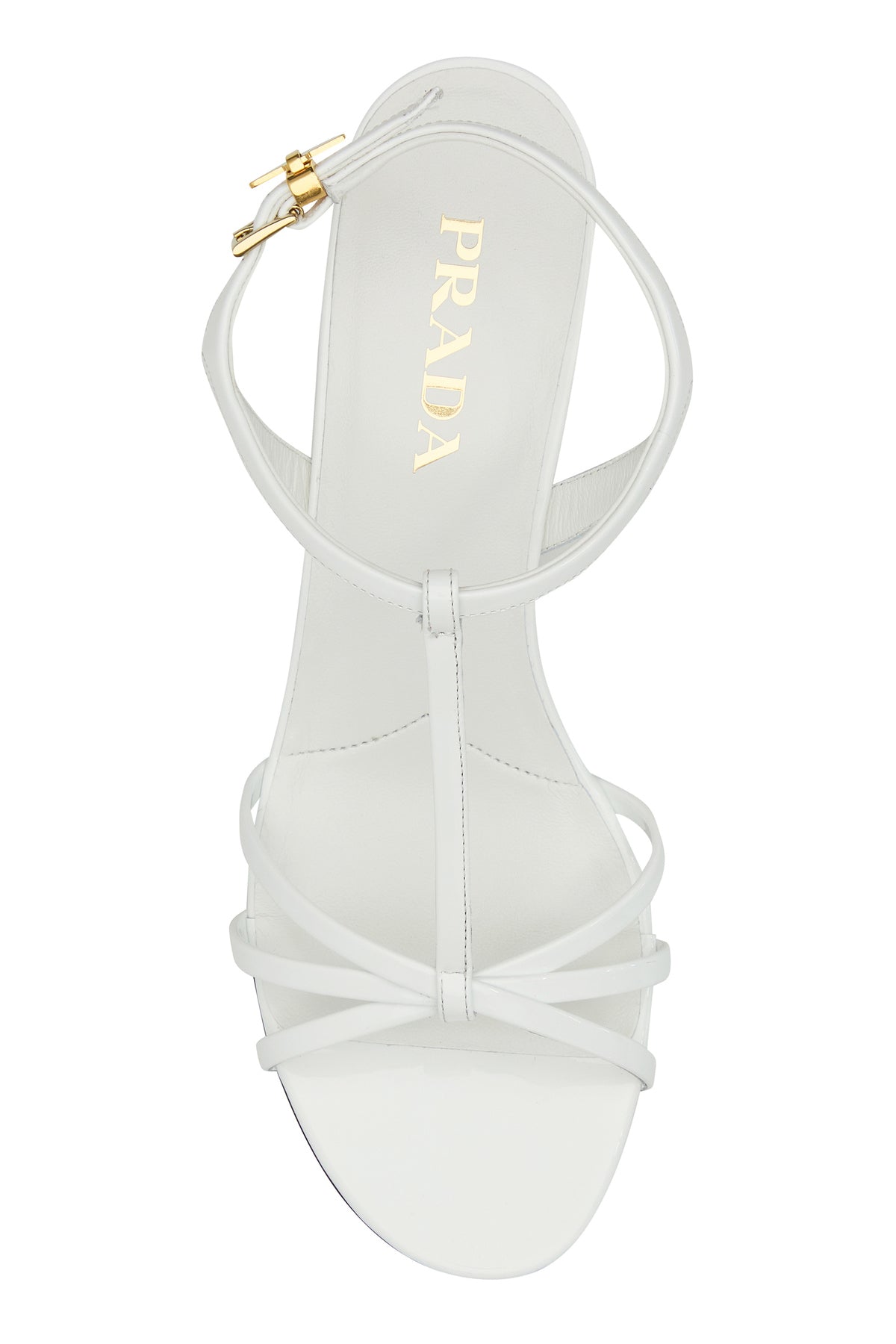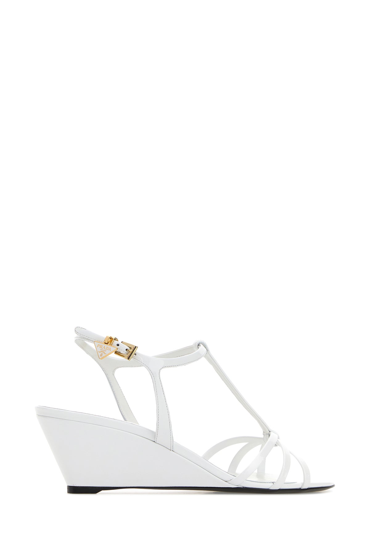 Sandals realized in patent leather enriched by iconic logoed metal triangle on the adjustable ankle strap closure.