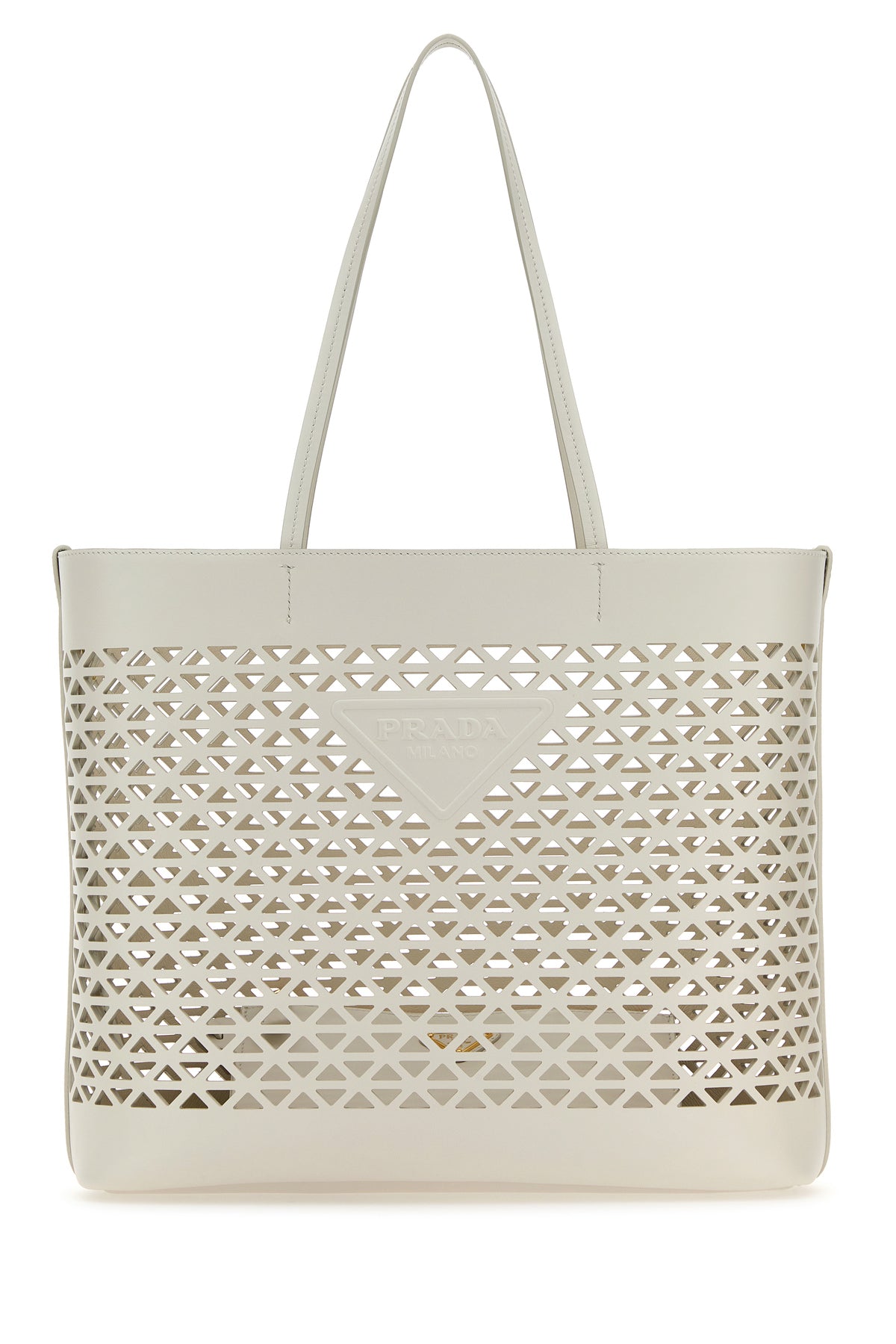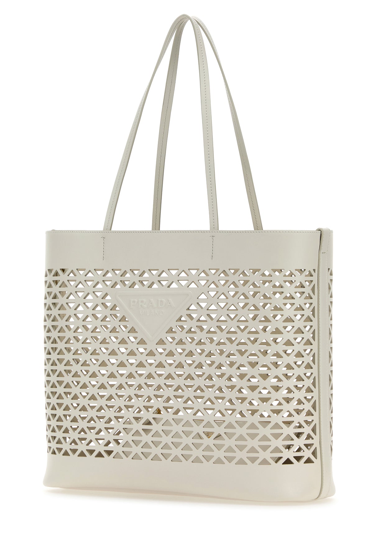 Shopping bag realized in leather characterized by peculiar cut-out details on the entire surface and tonal logo in relief at the front.