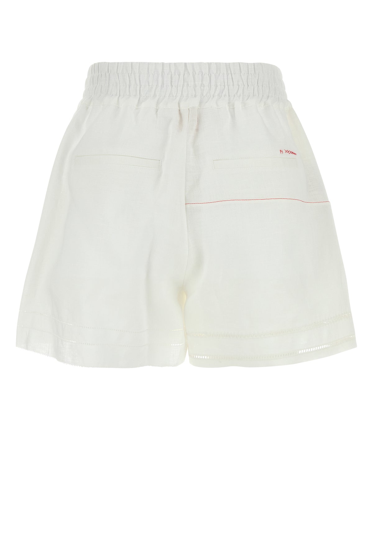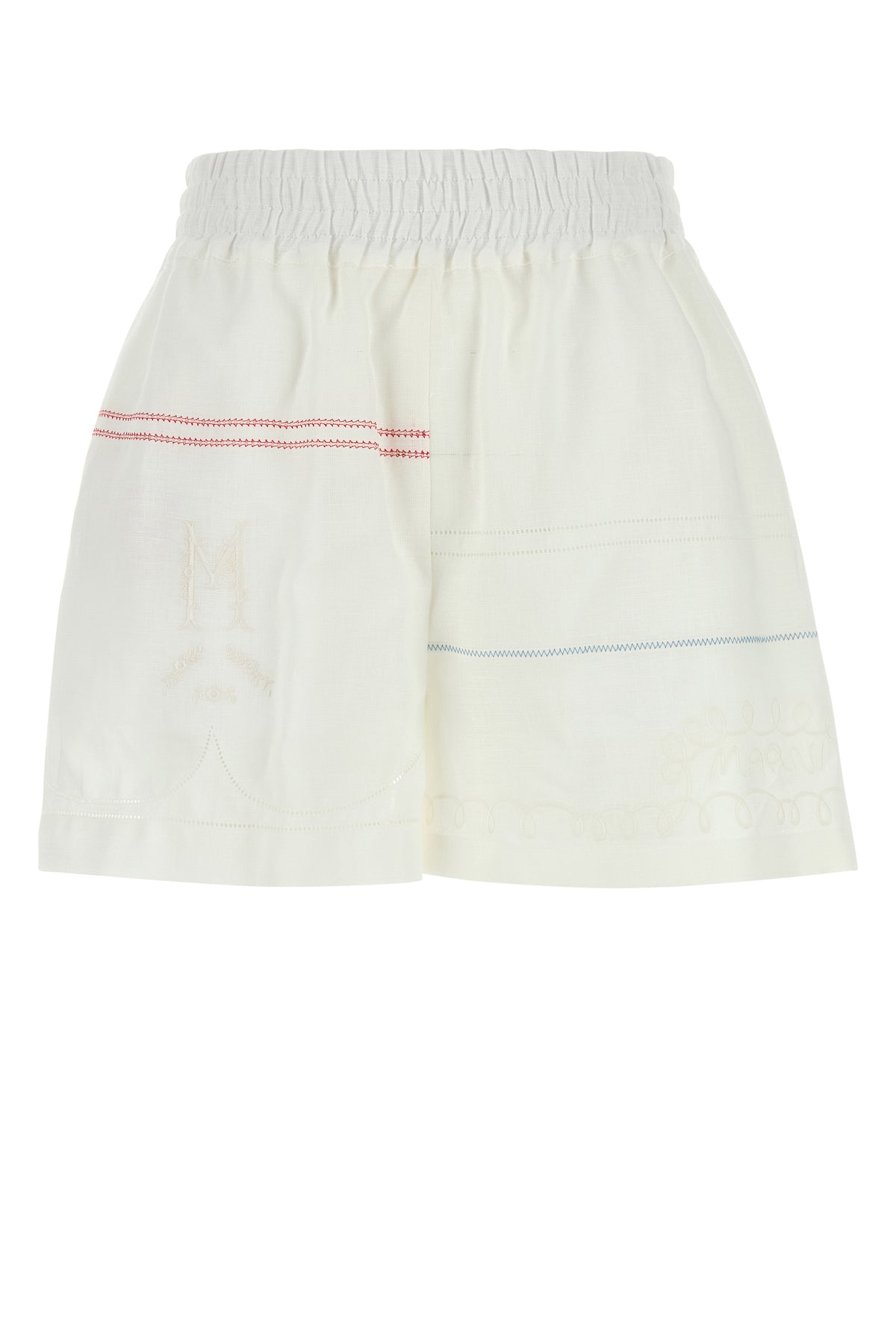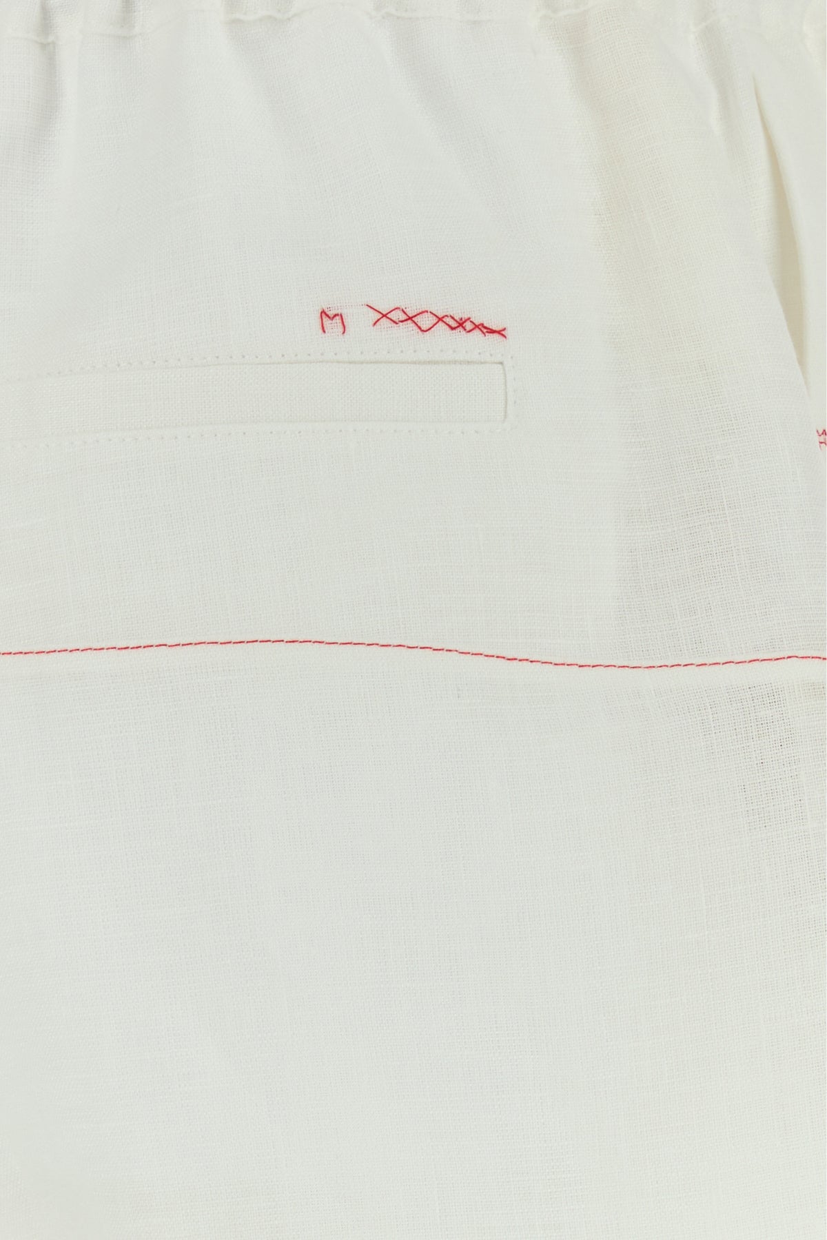 Shorts realized in pure linen characterized by peculiar contrasting embroideries and tonal embroidered logo at the front.