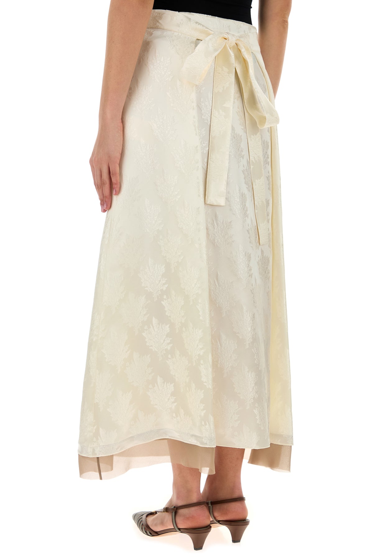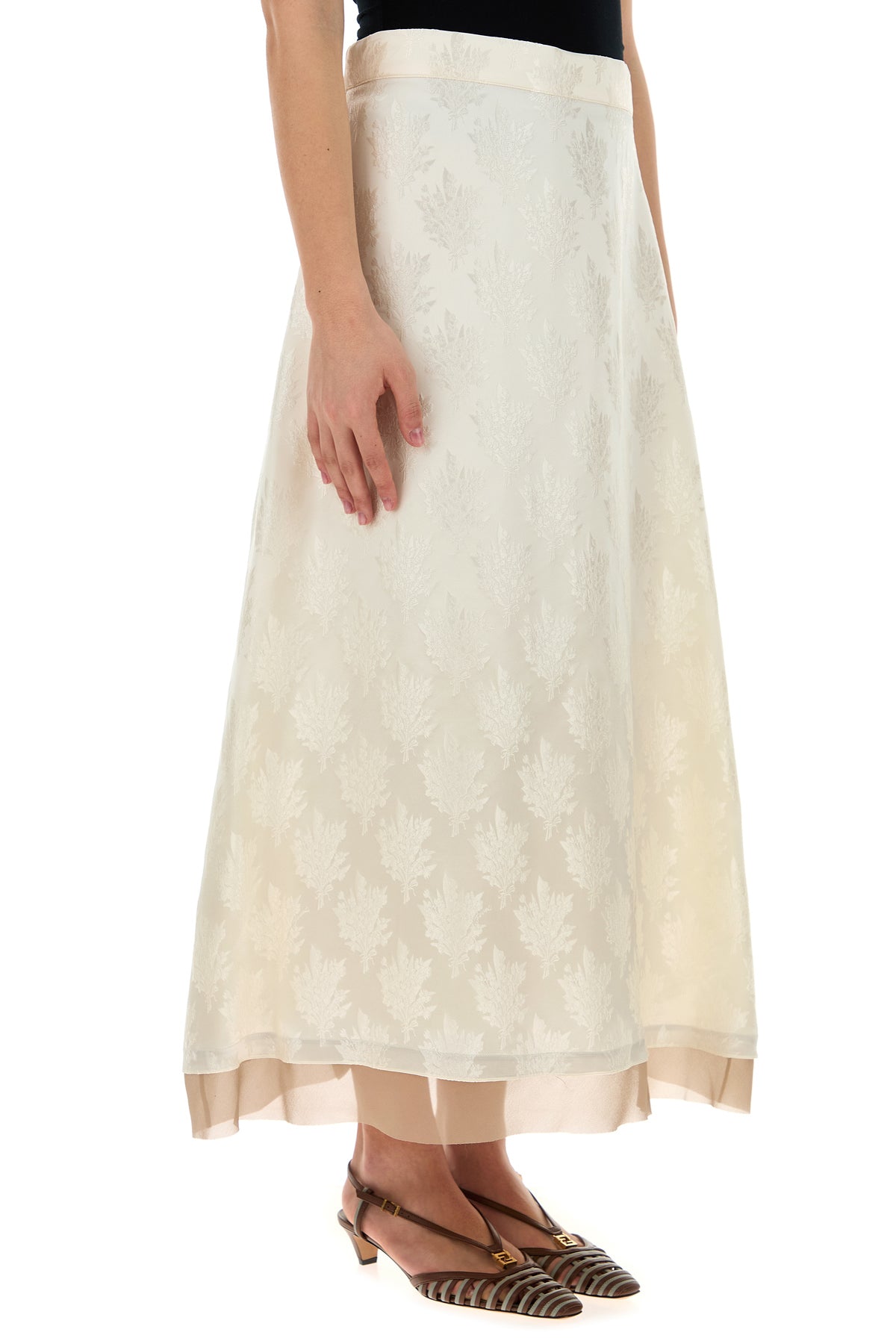 Midi-length skirt realized in silk blend with contrasting crepe insert on the hemline characterized by peculiar tonal embroideries on the entire surface.