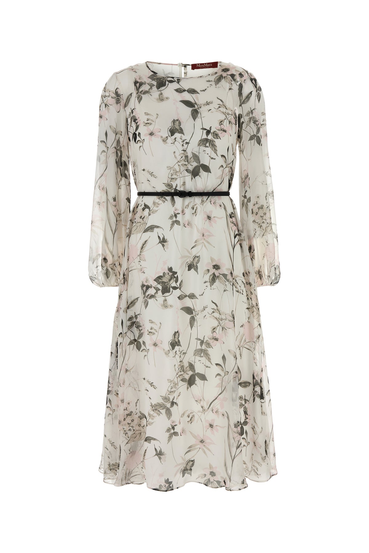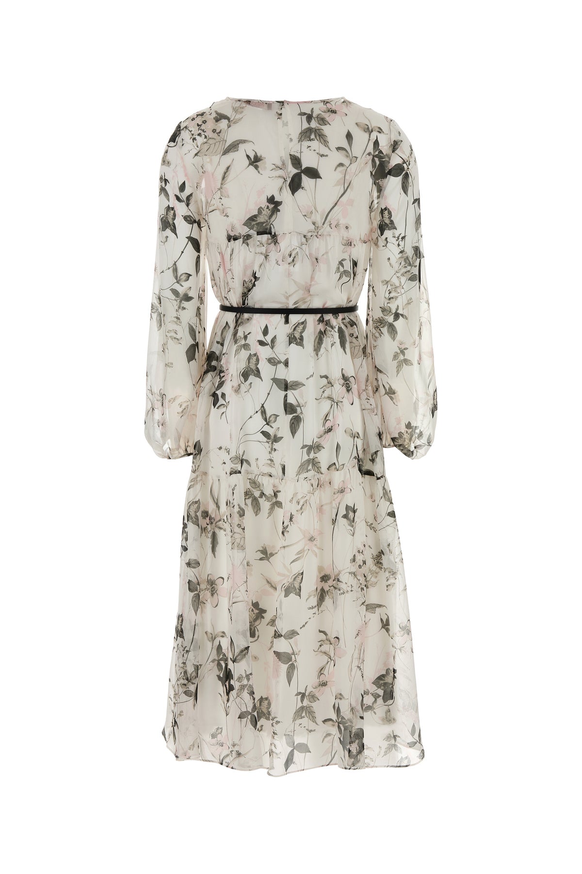 Abito midi realizzato in pura seta caratterizzato da stampa floreale su tutta la superficie arricchito da cintura amovibile in pelle.