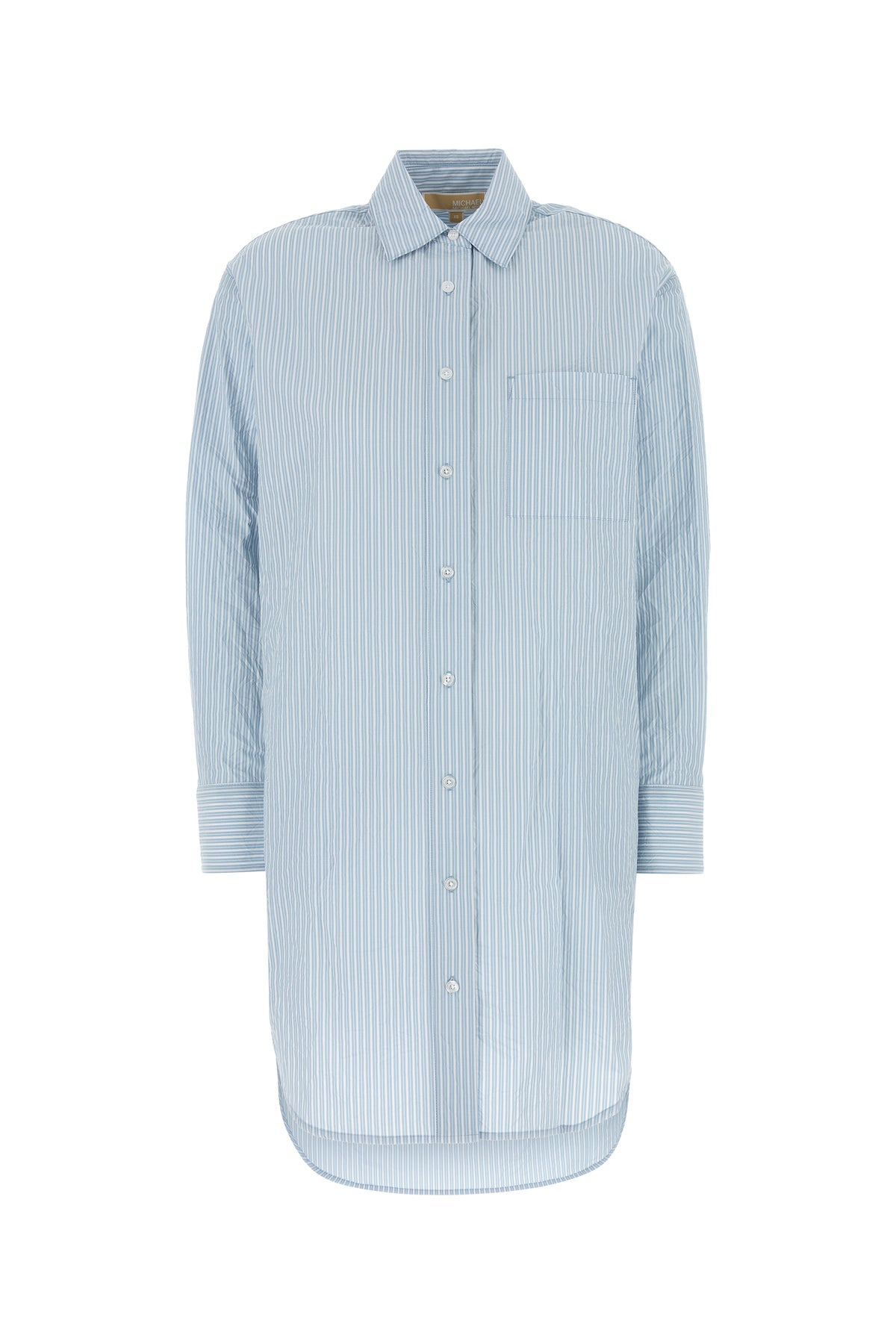 Abito chemisier realizzato in chambray ad effetto stropicciato caratterizzato da ricamo a righe su tutta la superficie.