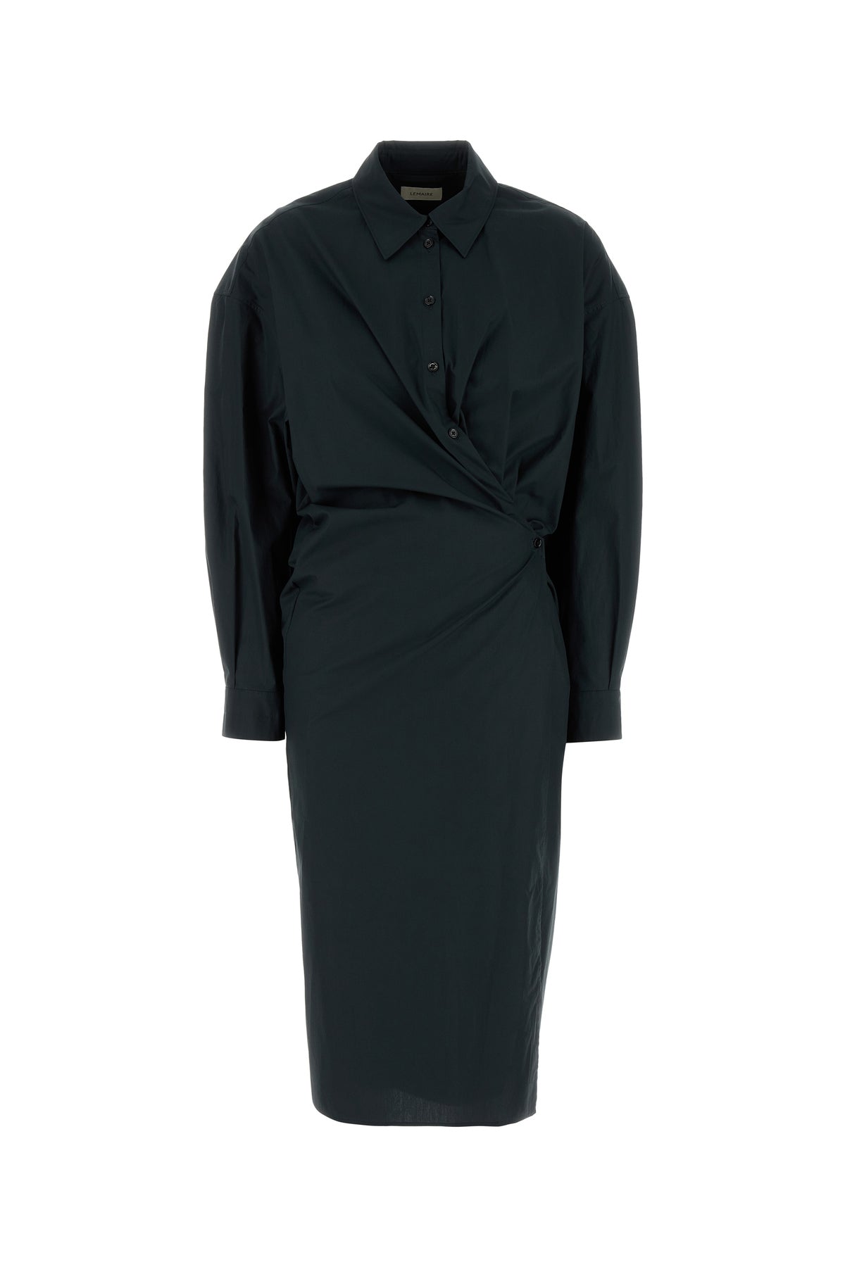 Abito chemisier realizzato in popeline di puro cotone caratterizzato da chiusura a portafoglio mediante bottone.