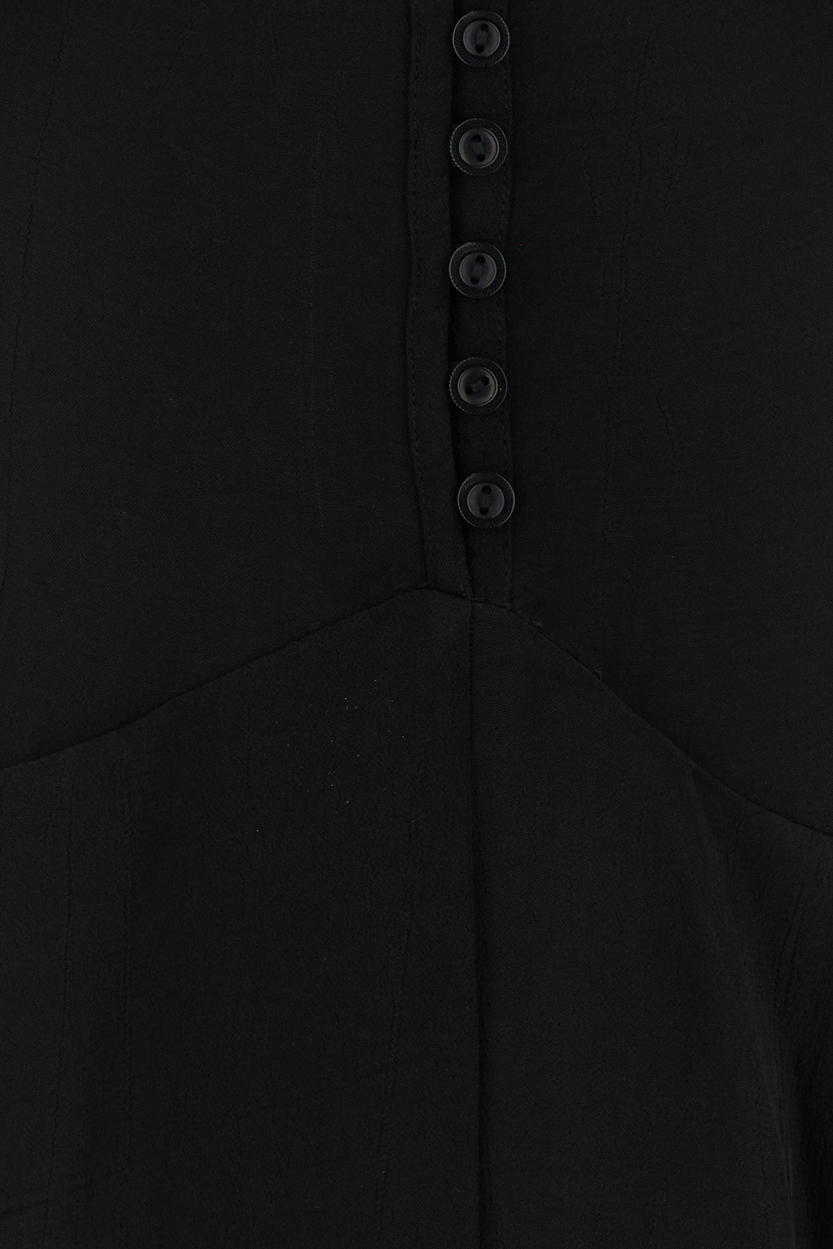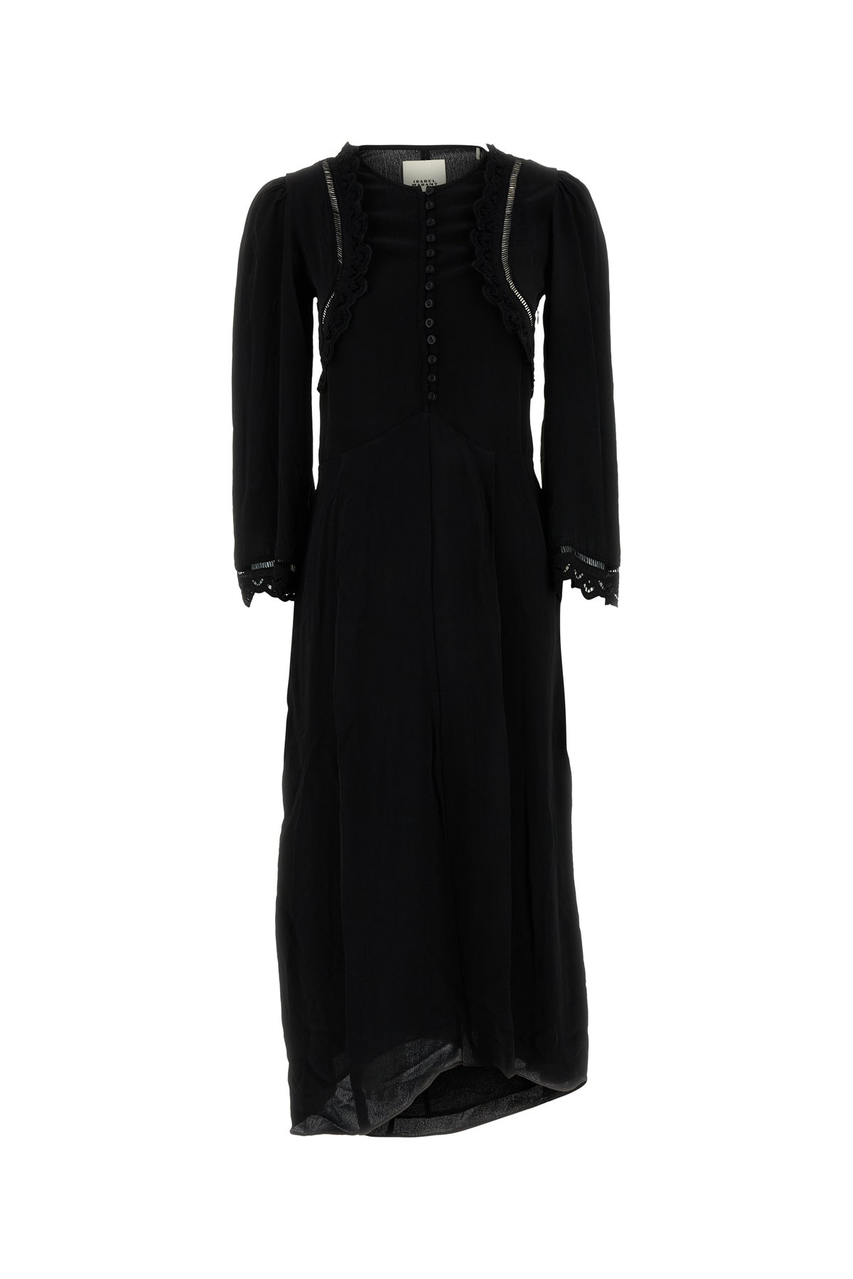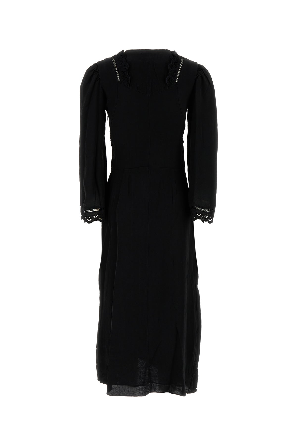 Abito dal taglio lungo realizzato in crepe di viscosa arricchito da inserti in pizzo tonale sulla parte superiore e sui polsini.