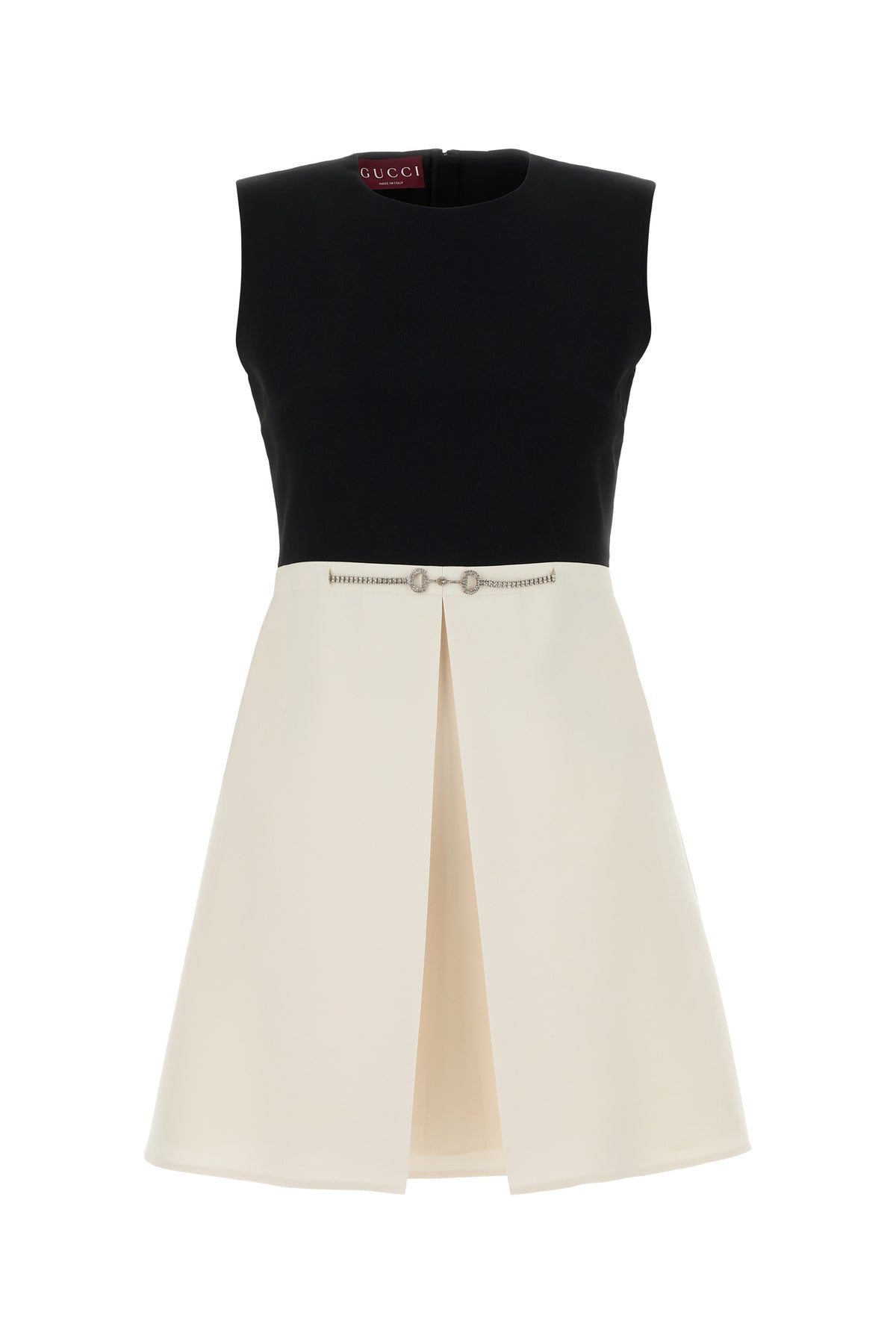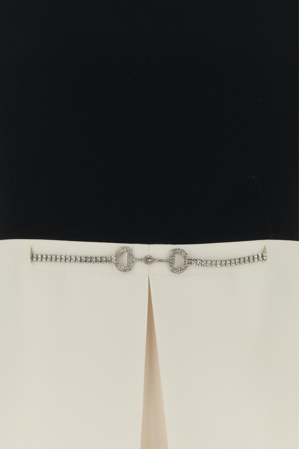 Abito realizzato in cady di seta e lana arricchito da decorazione Morsetto in cristalli in vita.