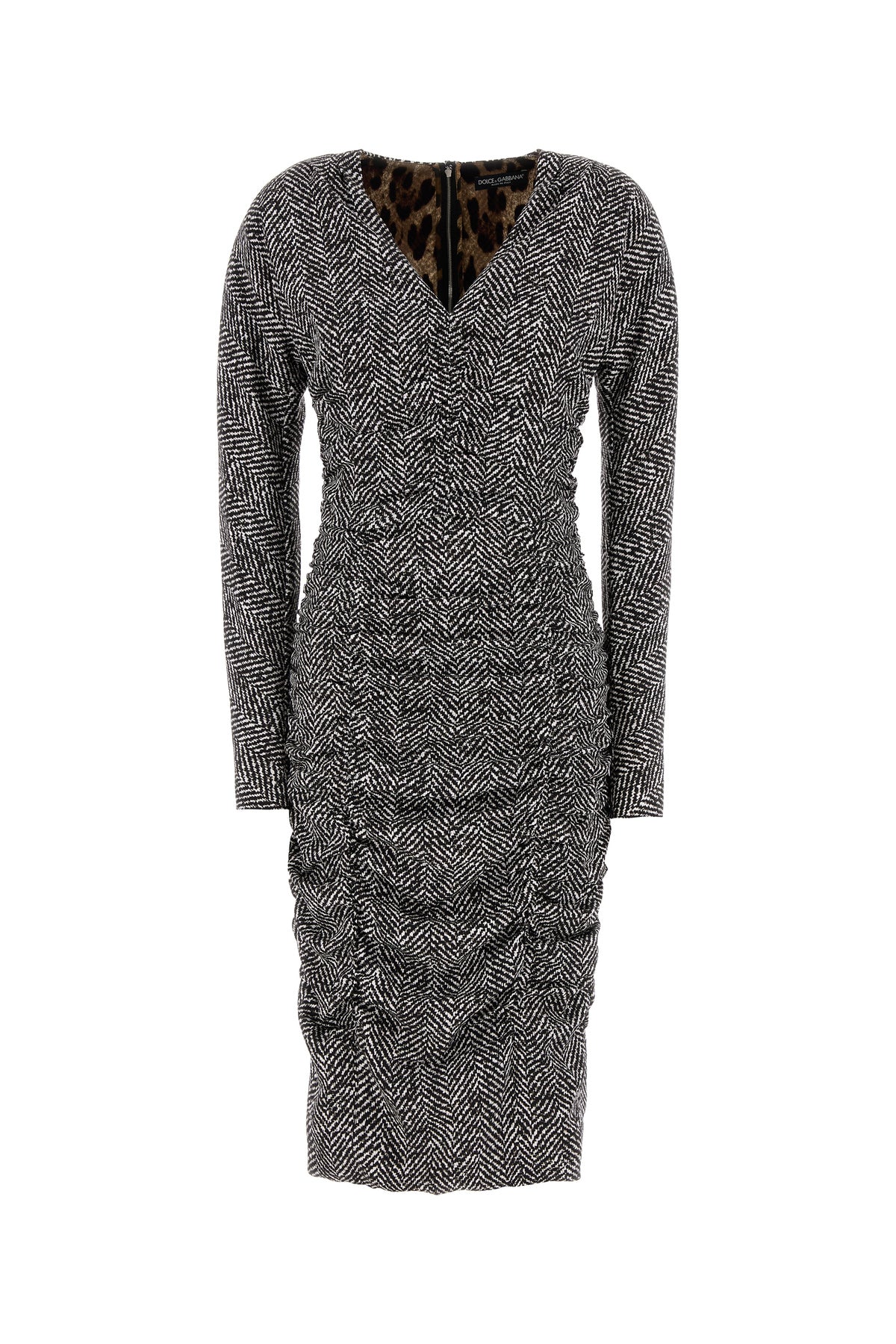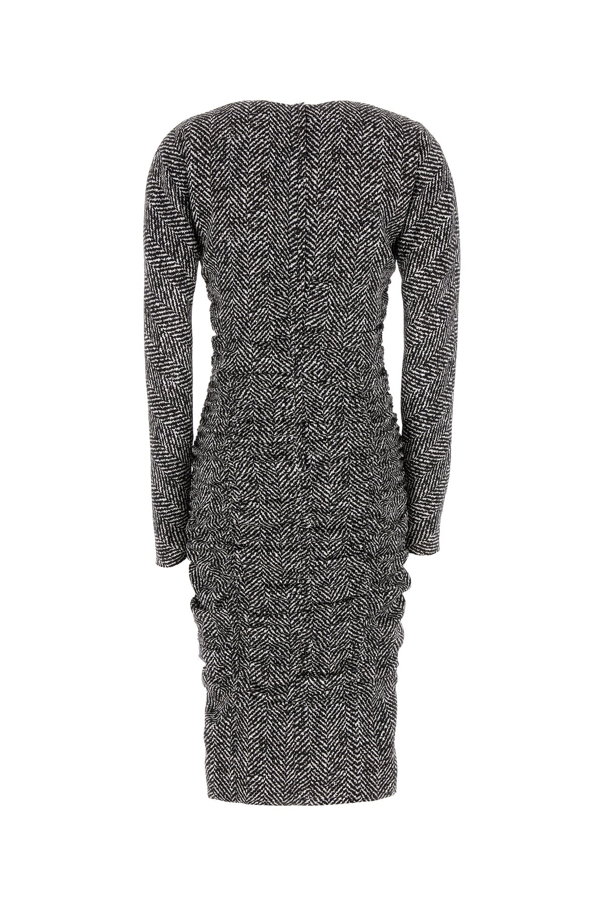 Abito midi realizzato in cady di seta stretch caratterizzato da stampa a motivo chevron su tutta la superficie.