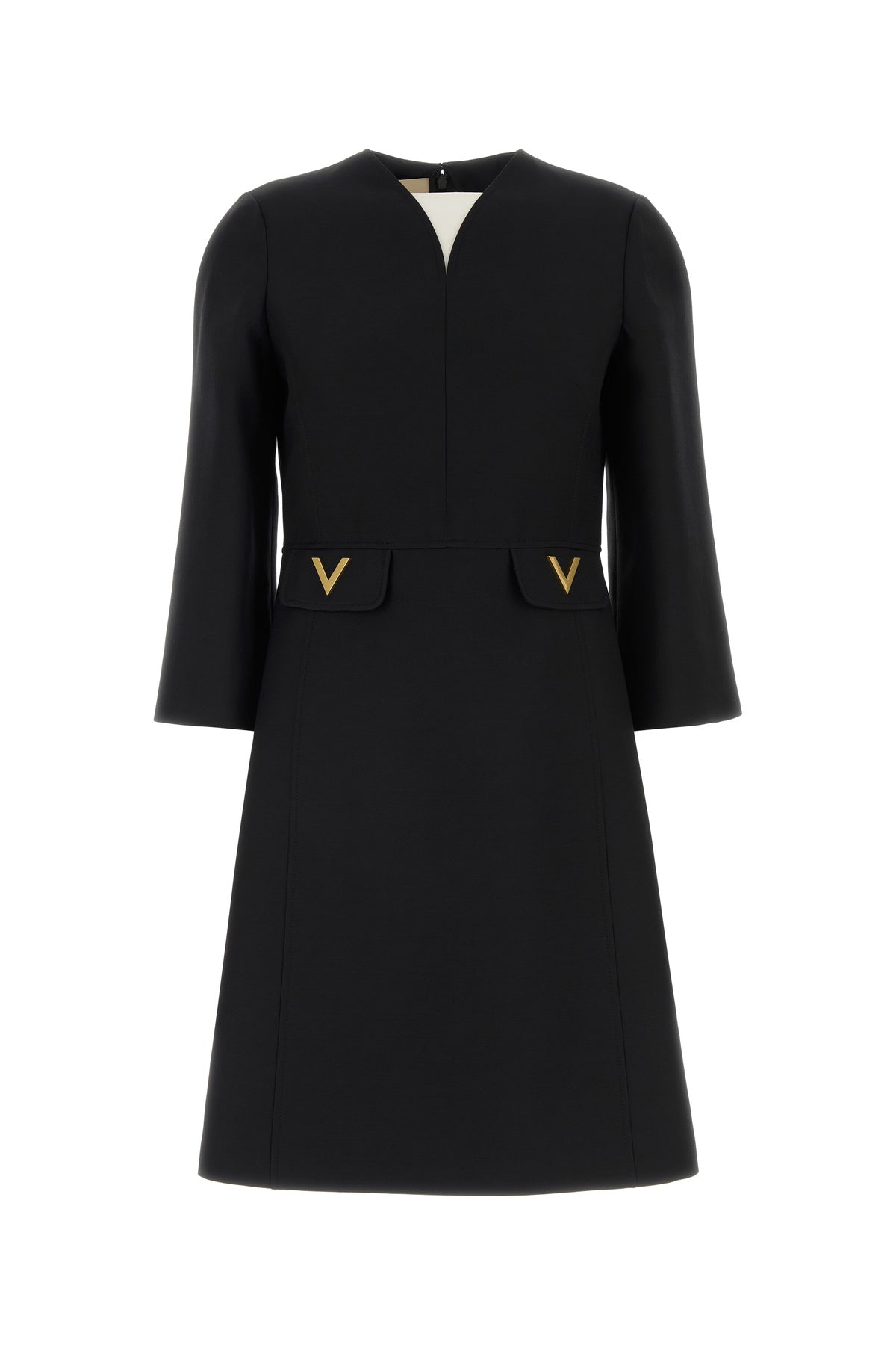 Abito midi realizzato in crepe couture di lana vergine e seta arricchito da dettagli V Gold sulla parte frontale.