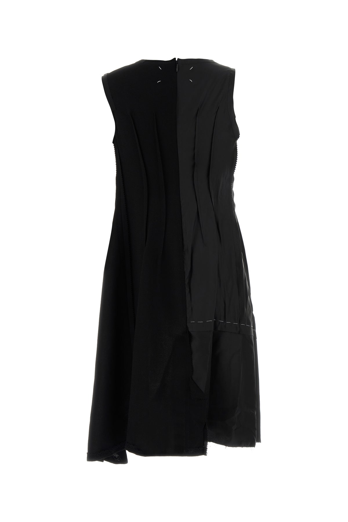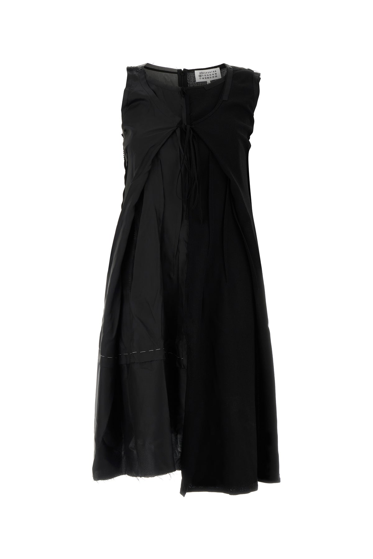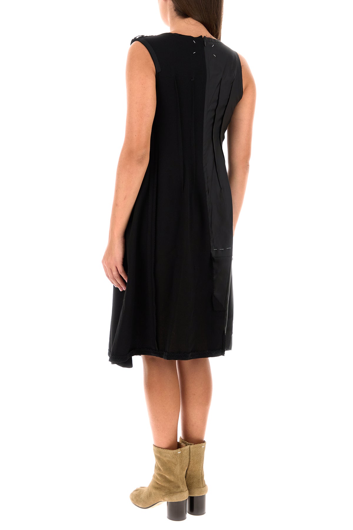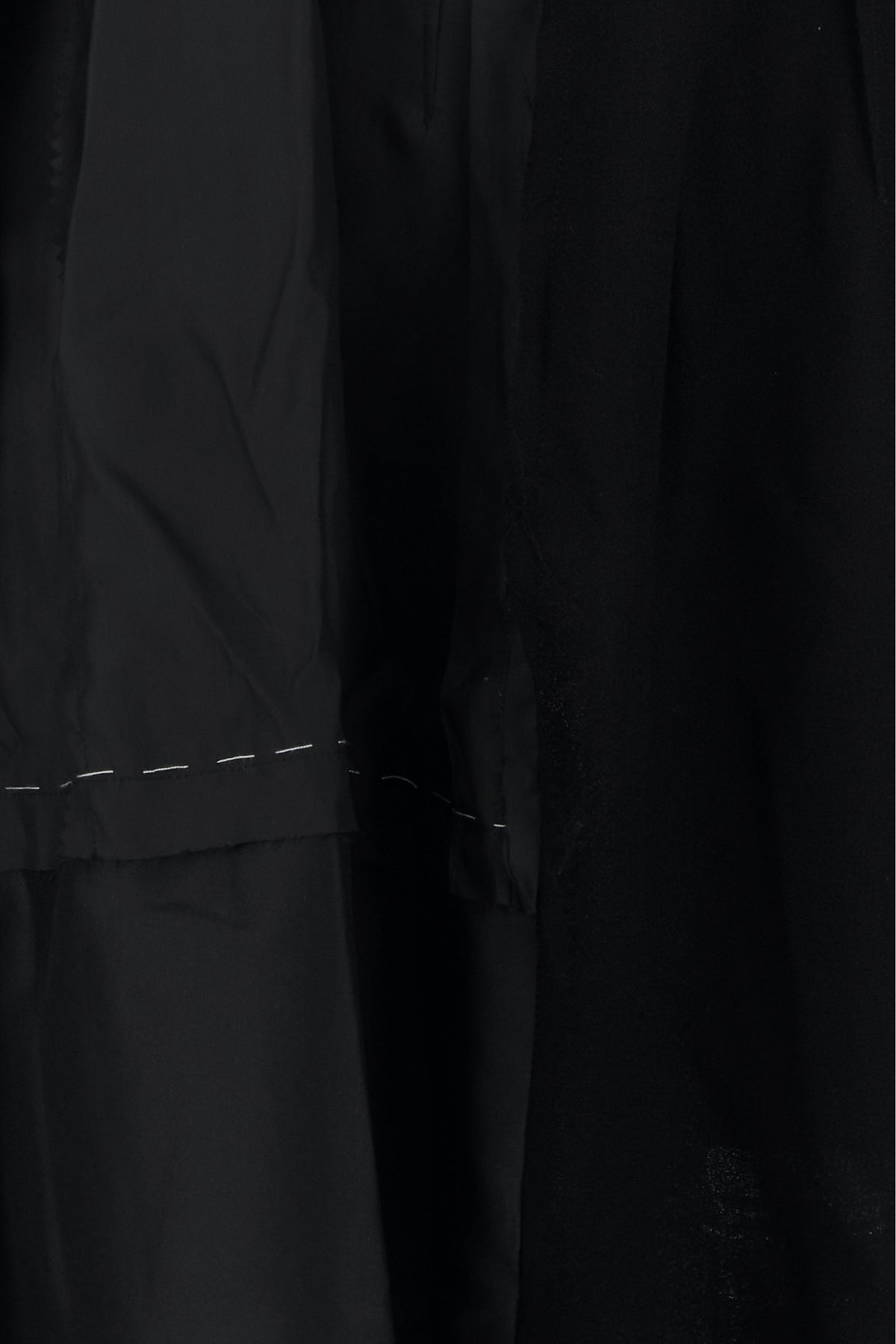 Abito asimmetrico realizzato in pura lana con inserti in seta arricchito da laccetti da annodare sulla parte frontale e iconiche cuciture a contrasto sul retro.