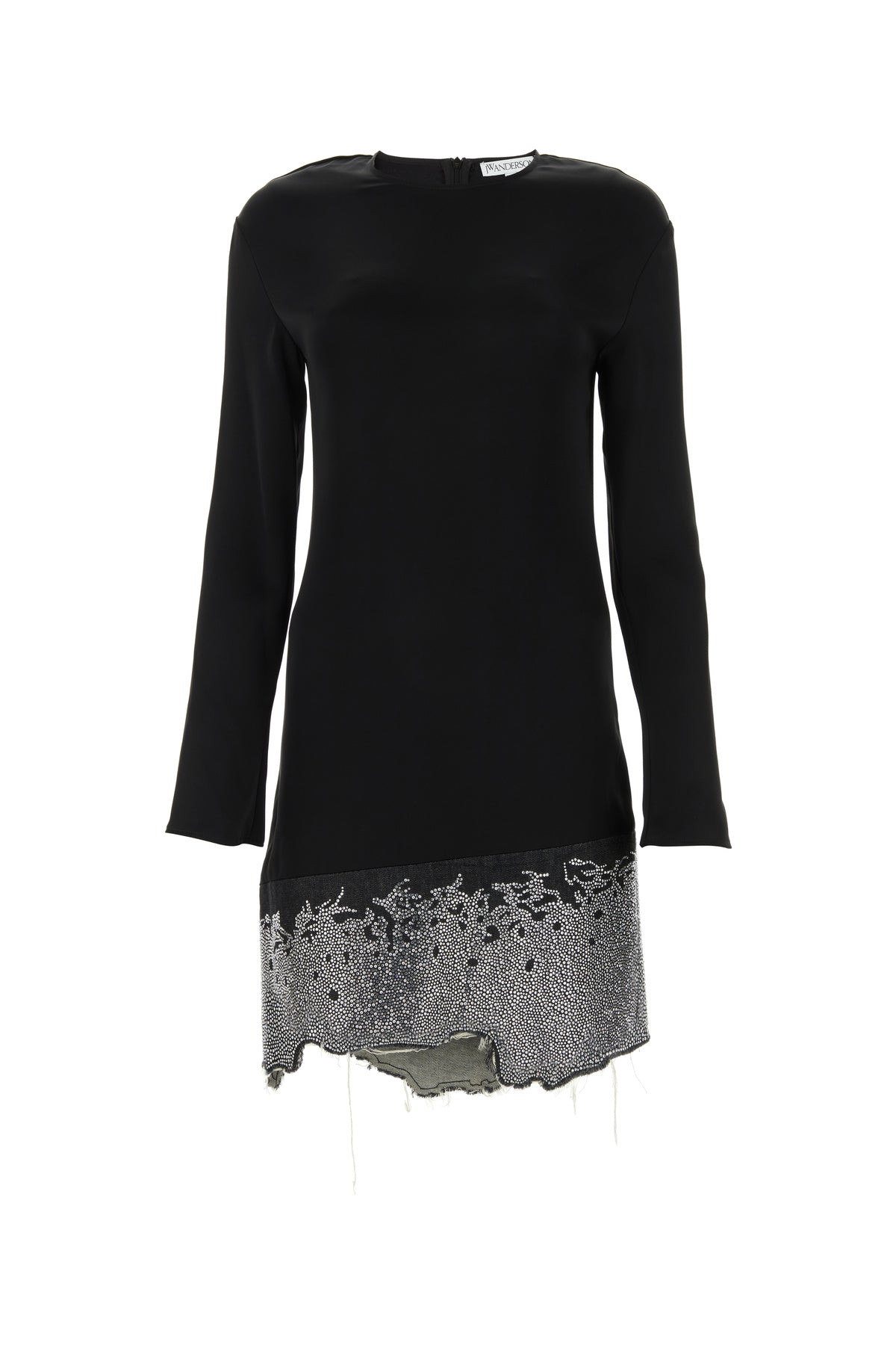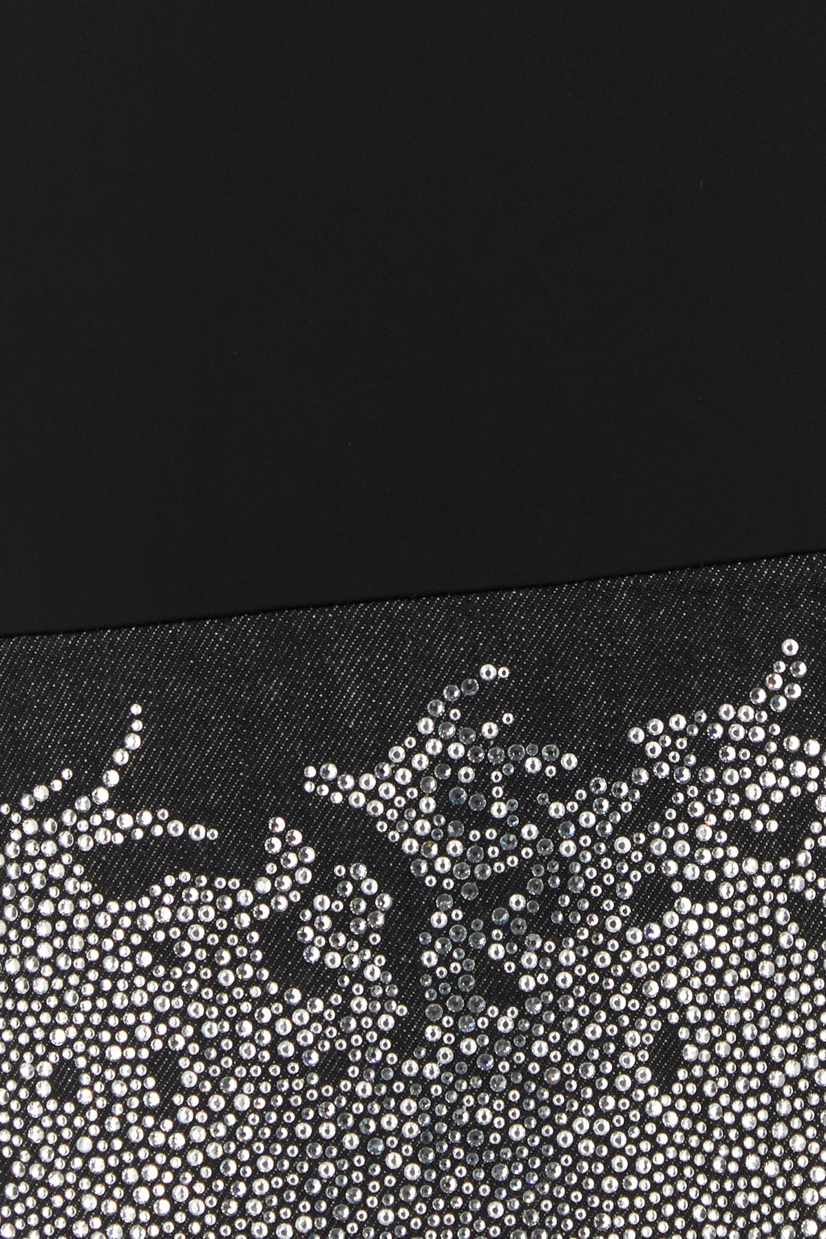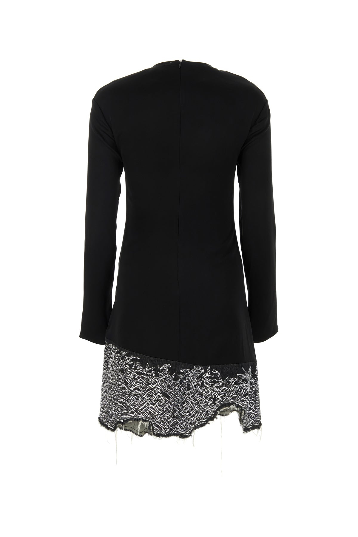 Abito realizzato in misto triacetato con inserto in denim di puro cotone sul fondo arricchito da cristalli sul fondo.