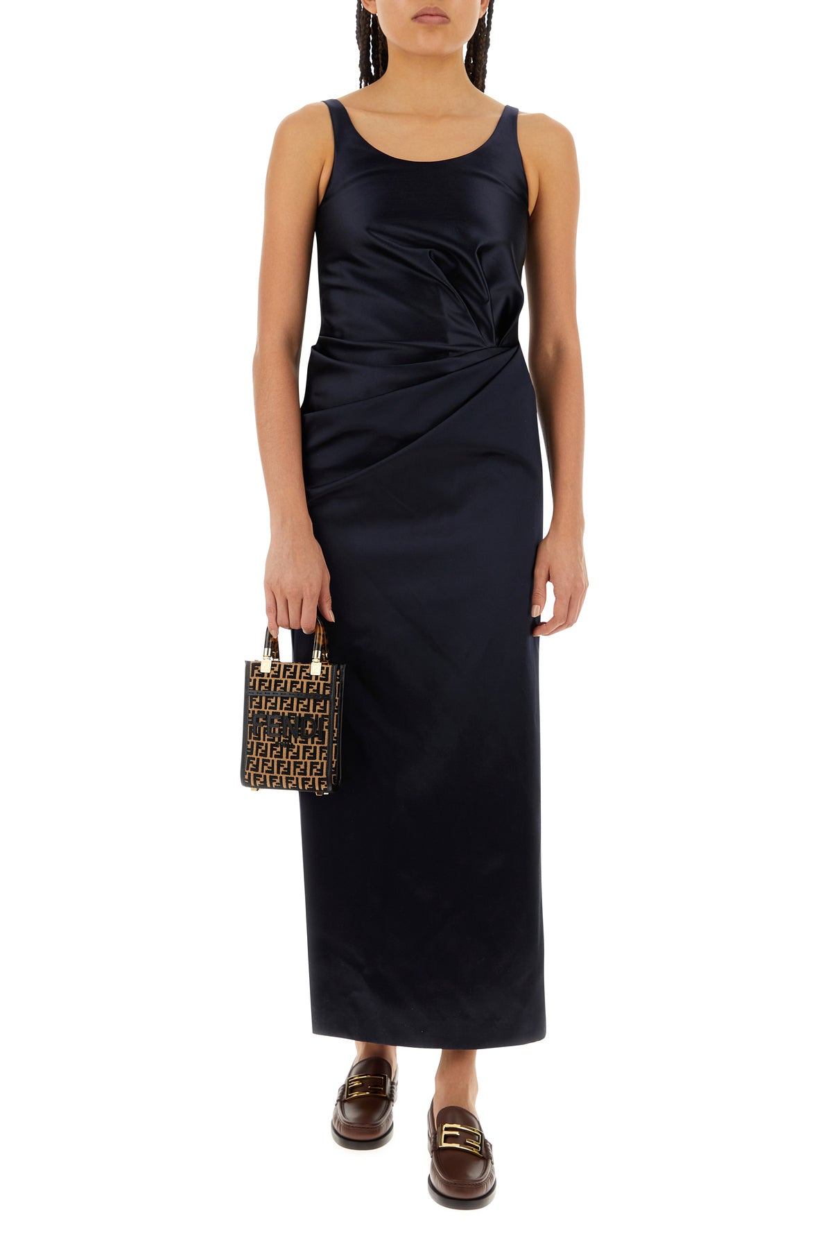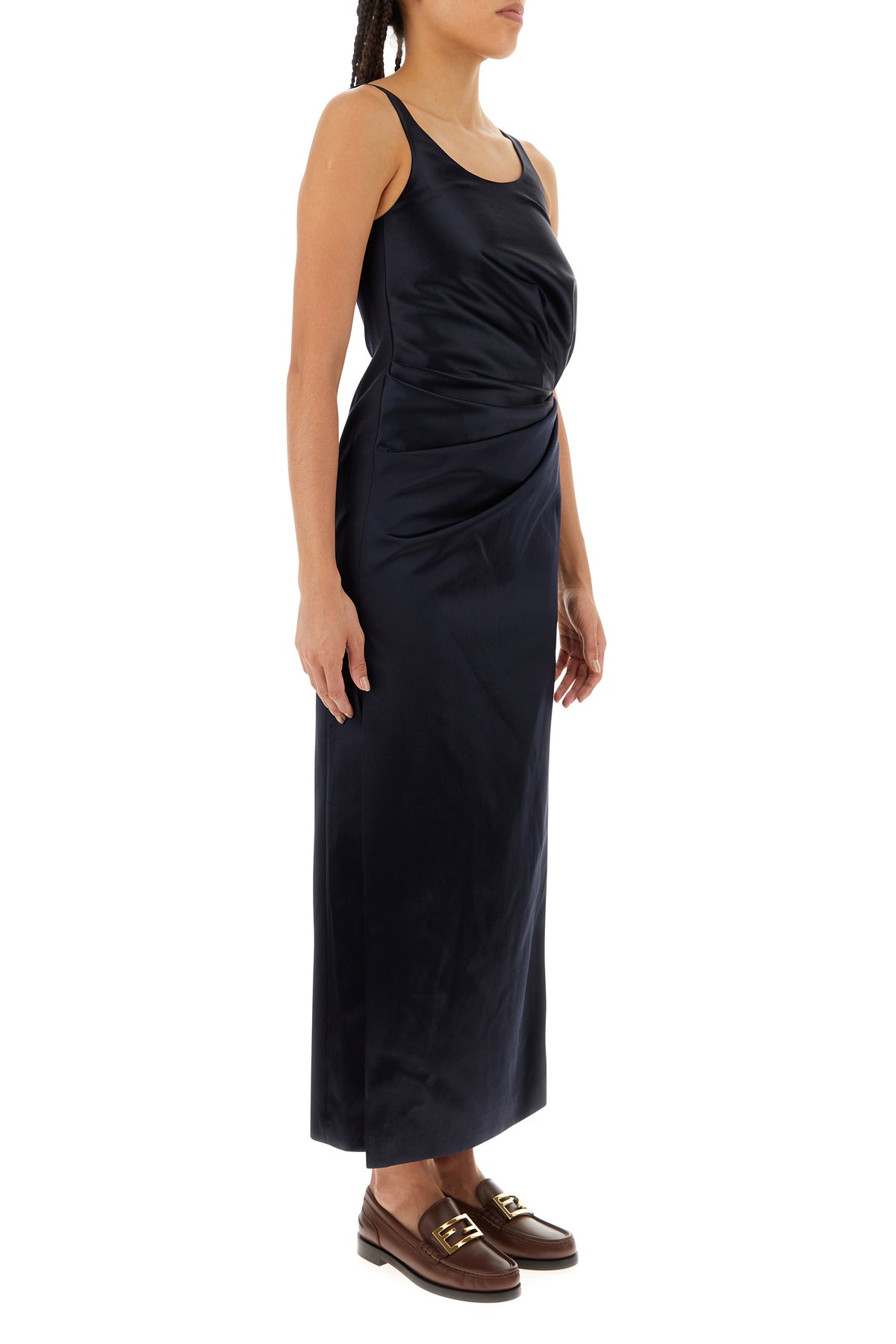 Abito realizzato in raso caratterizzato da particolari arricciature sulla parte frontale.