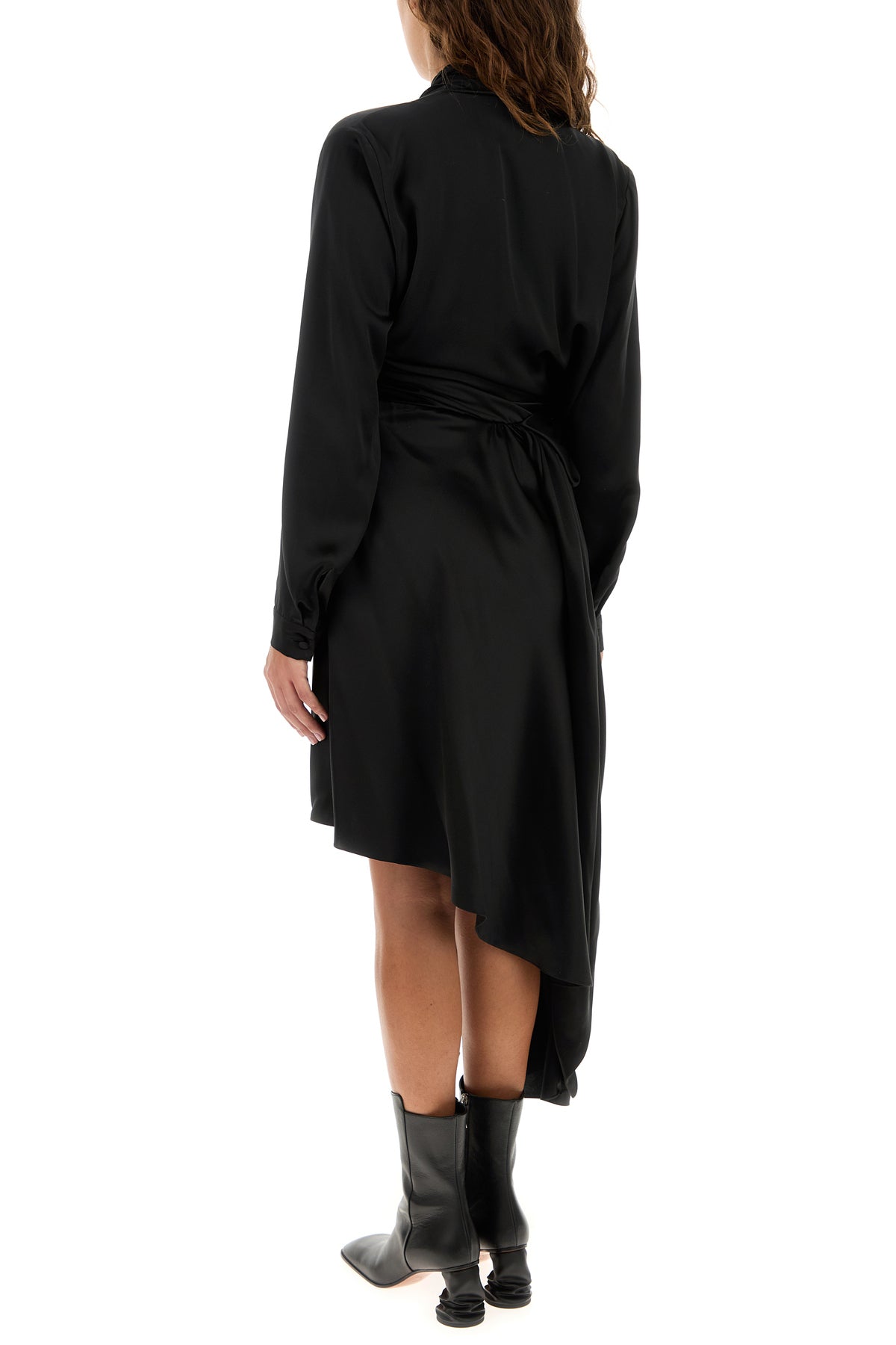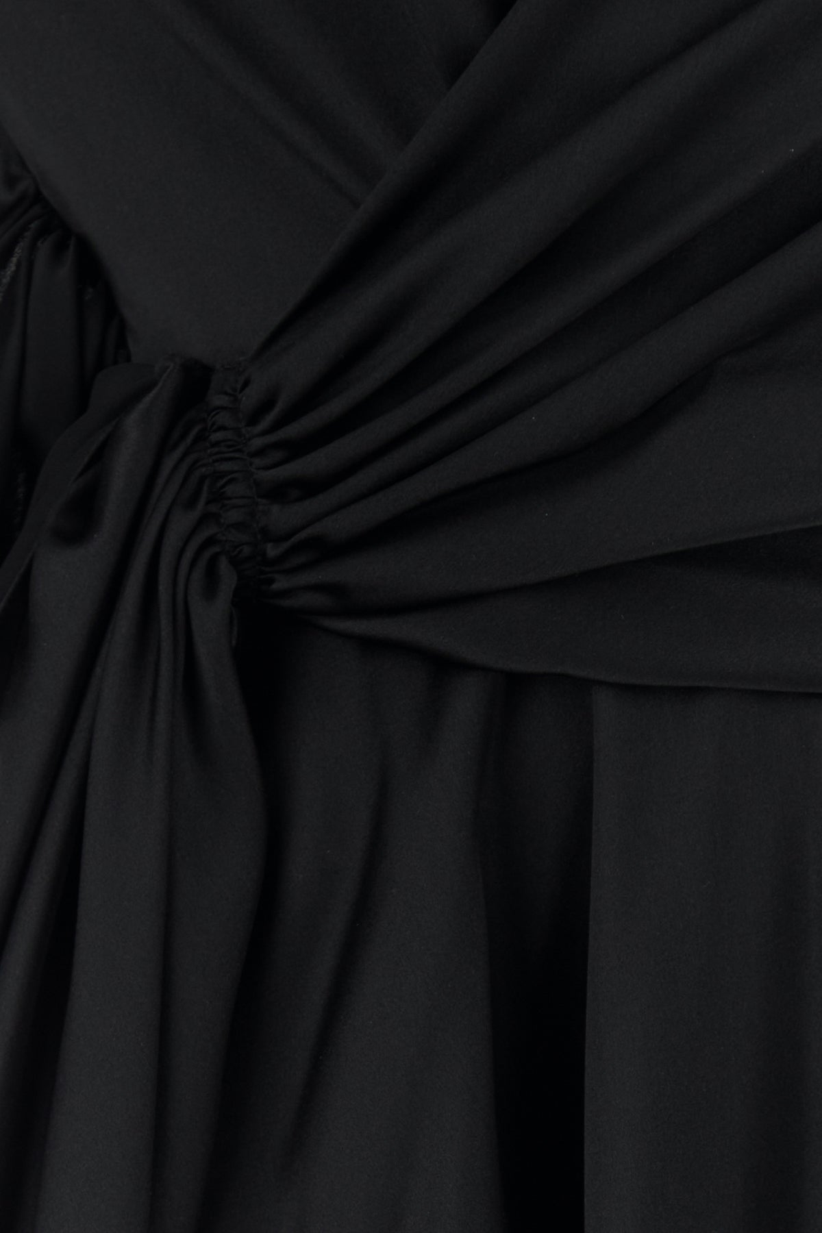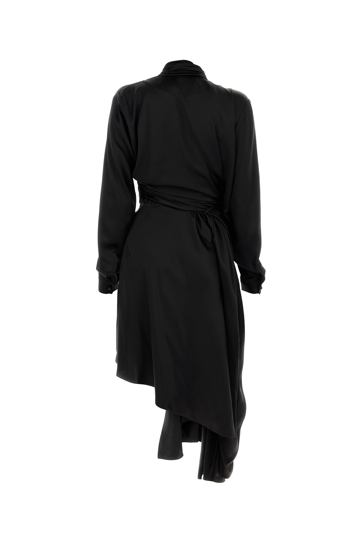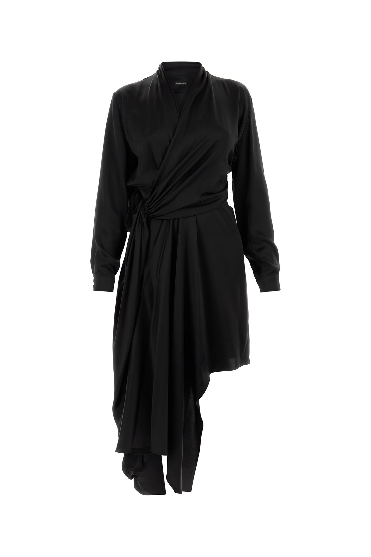 Abito realizzato in raso di pura seta caratterizzato da particolare drappeggio sulla parte frontale.
