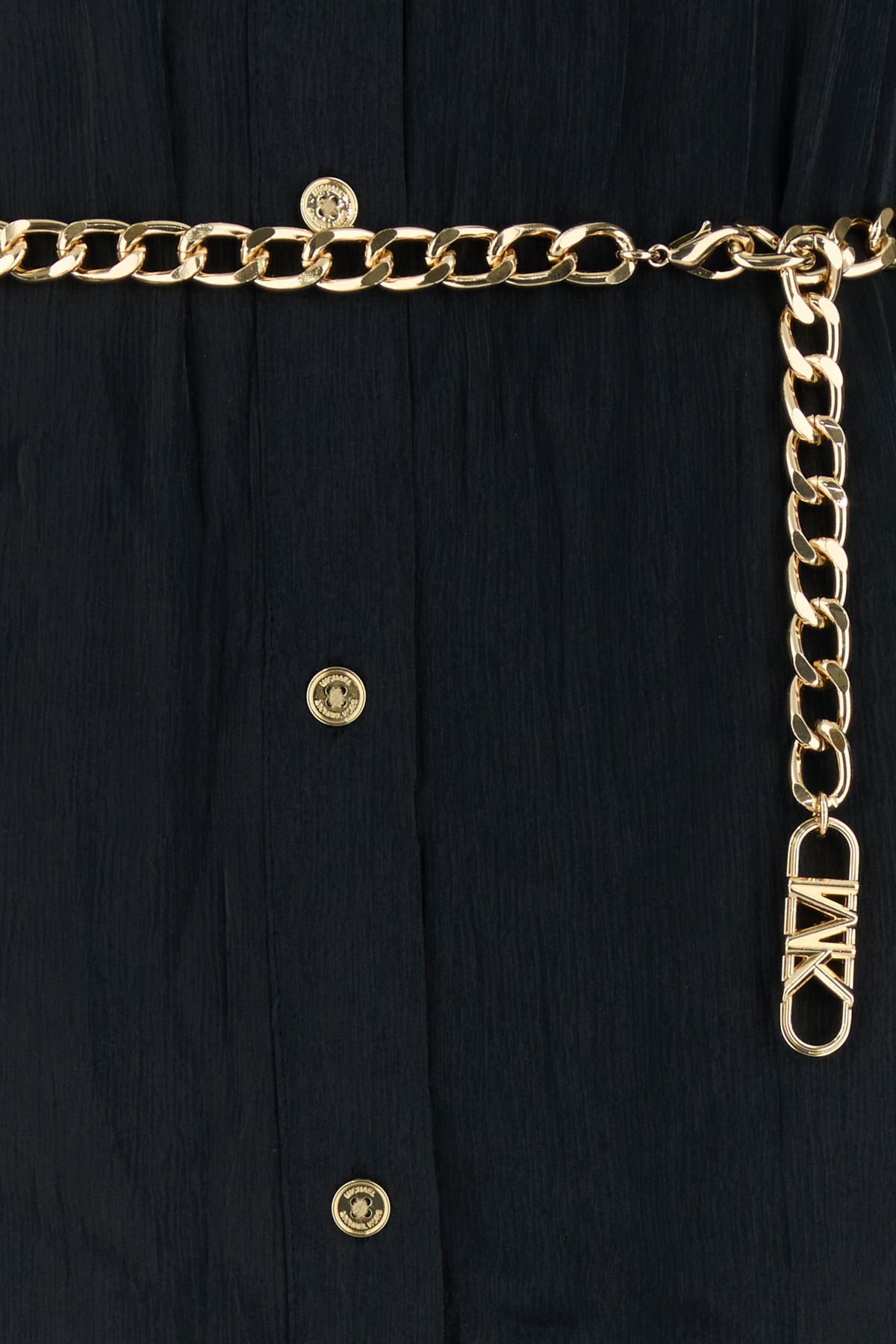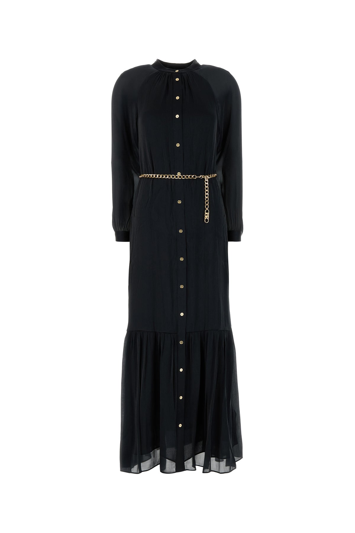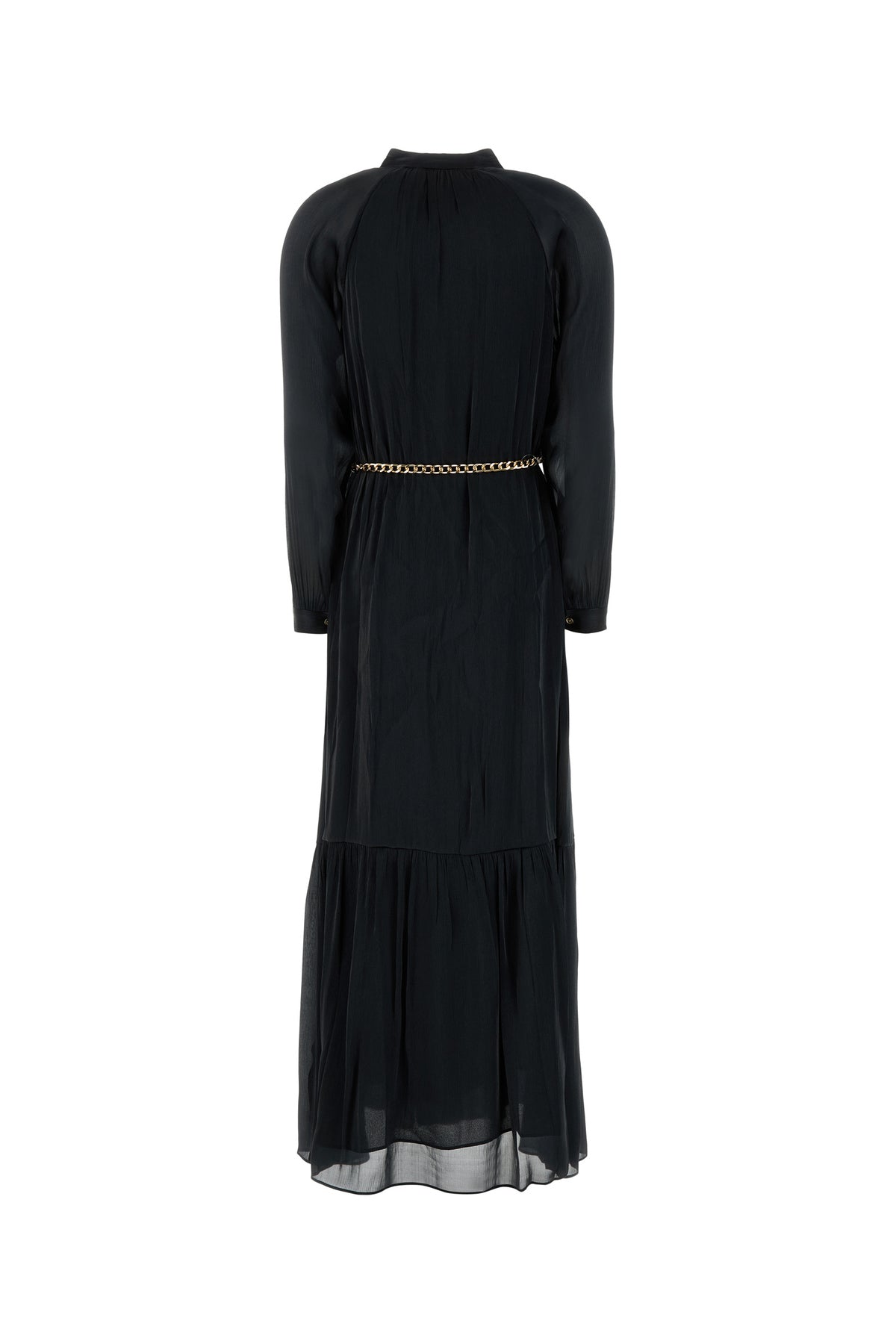 Abito dal taglio lungo lungo realizzato in raso arricchito da cintura in catena metallica in vita.