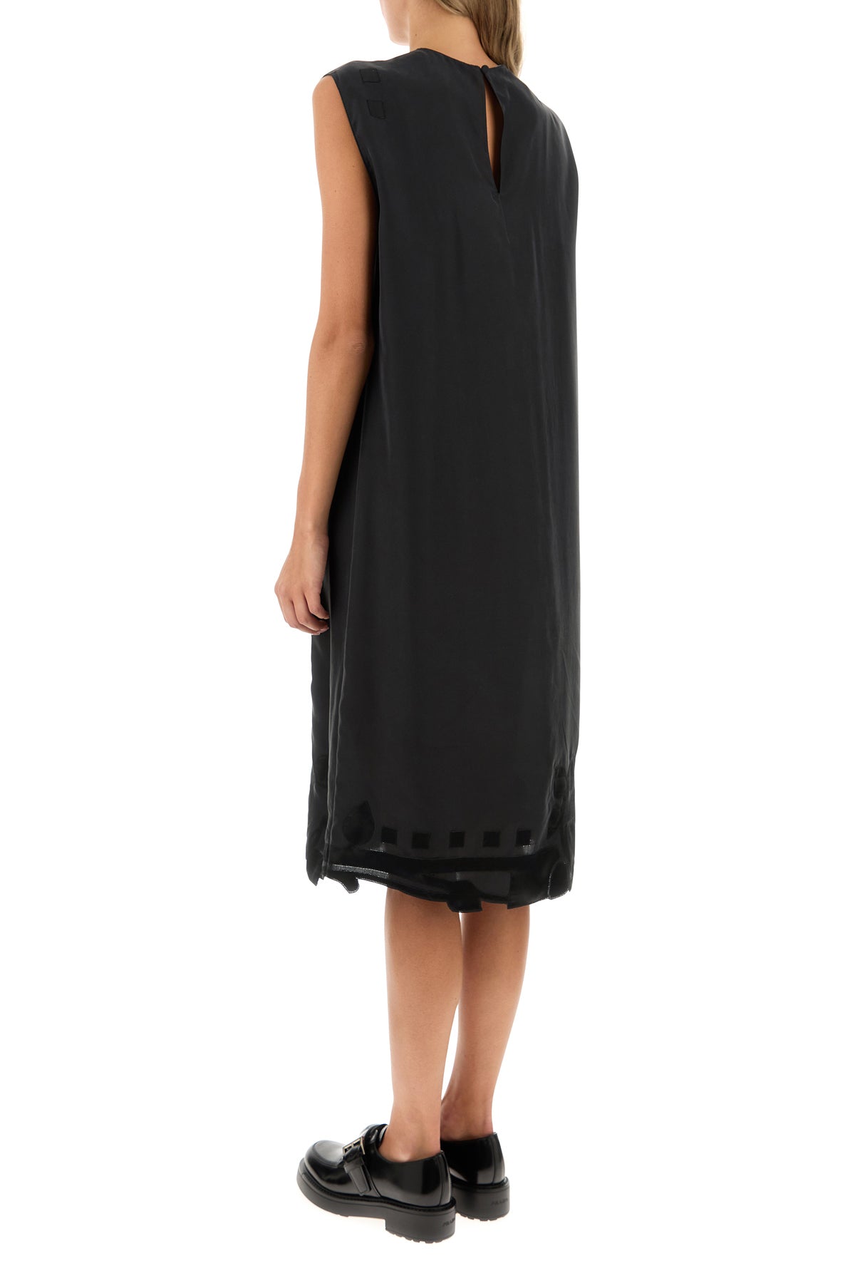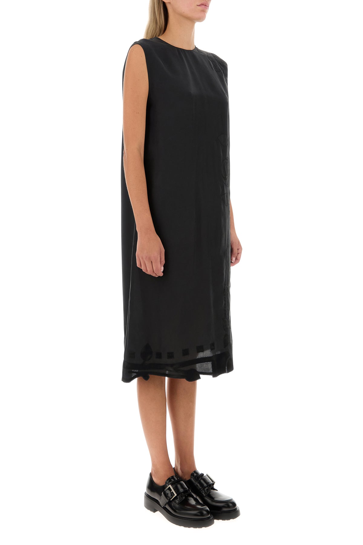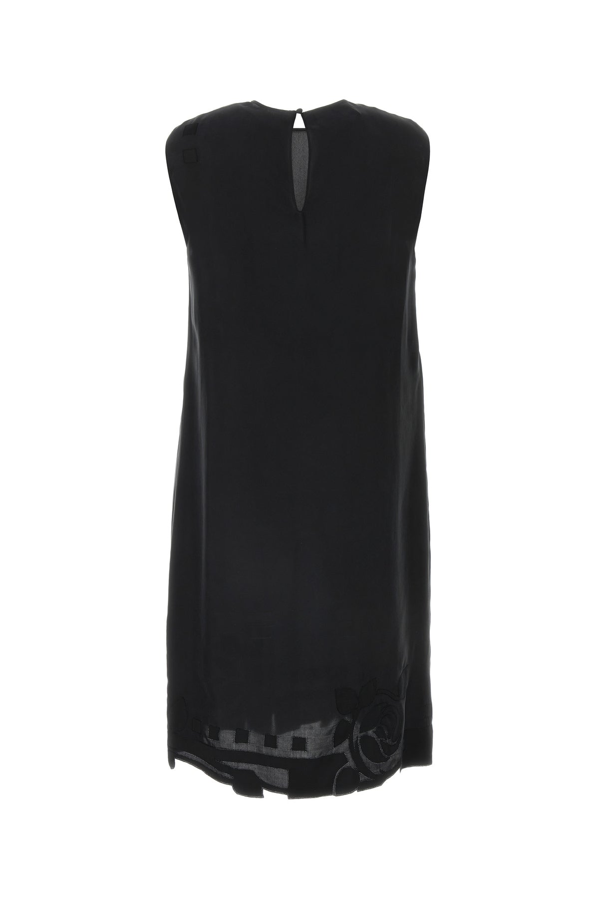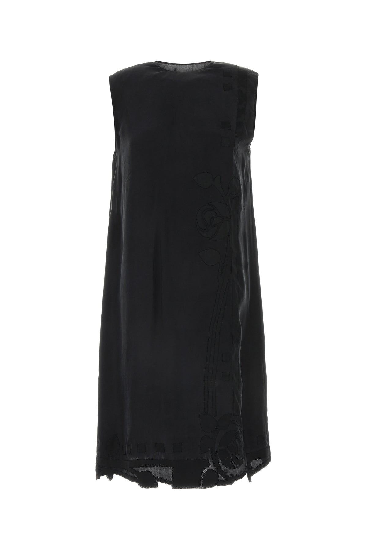 Abito realizzato in pura seta caratterizzato da ricamo floreale tonale sulla parte frontale e sul fondo.