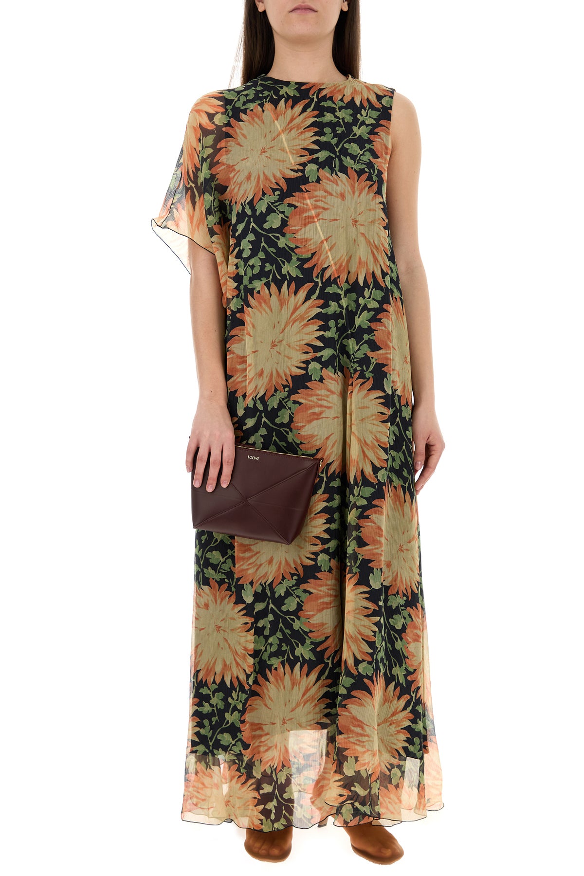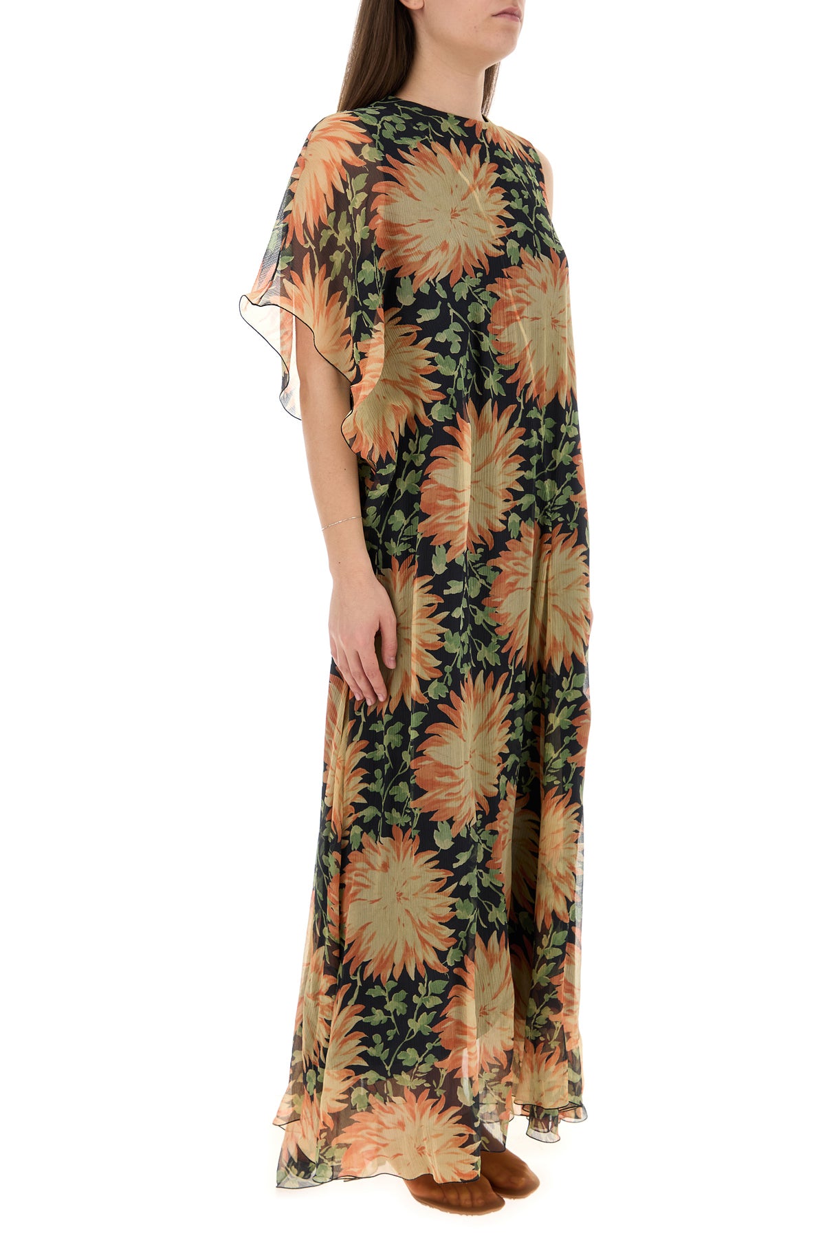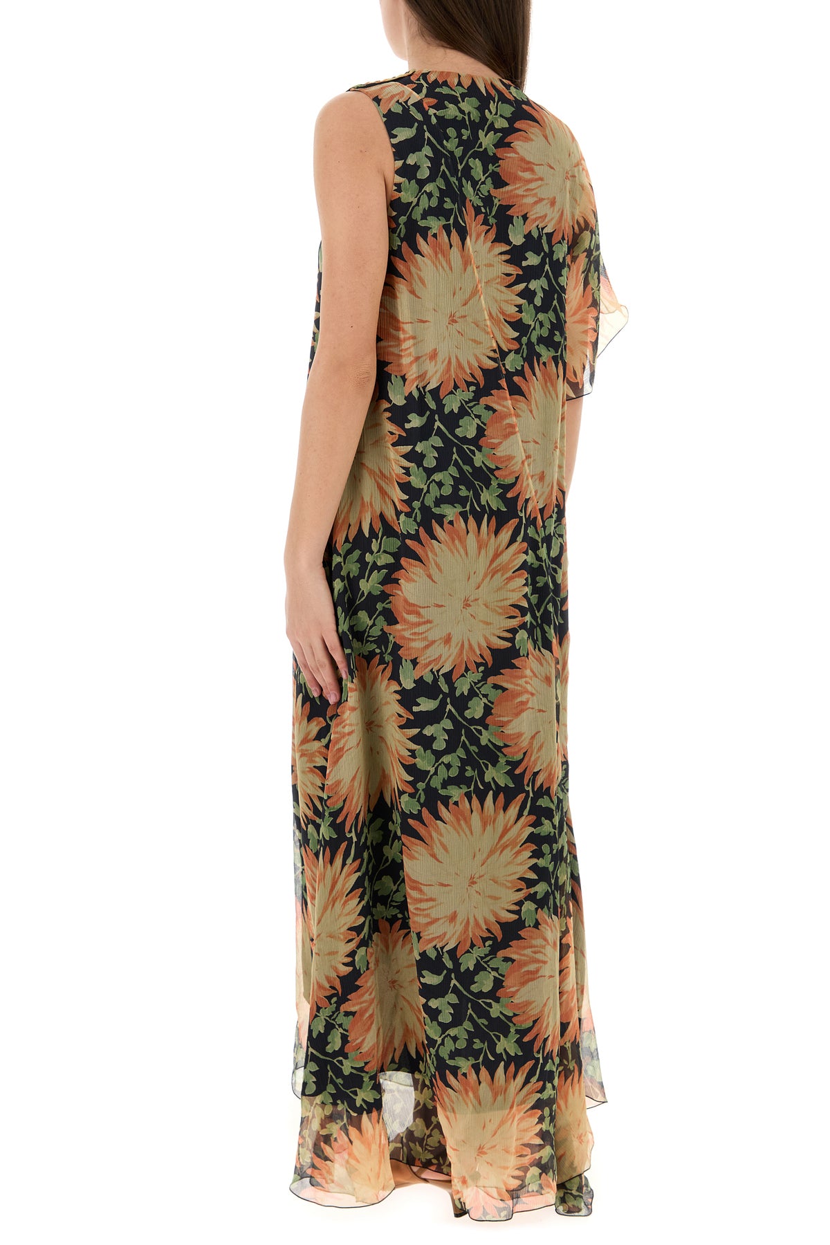 Abito dal taglio lungo realizzato in pura seta caratterizzato da stampa Dahlia su tutta la superficie.