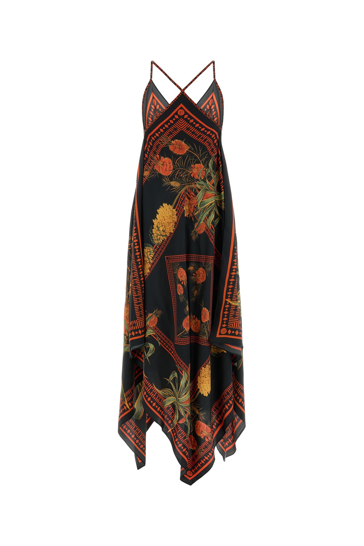 Abito dal taglio lungo realizzato in twill di viscosa caratterizzata da stampa Foulard su tutta la superficie.