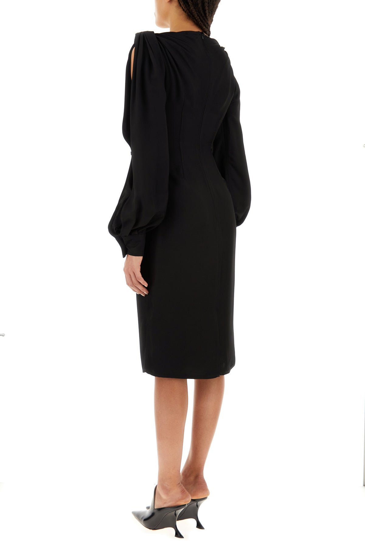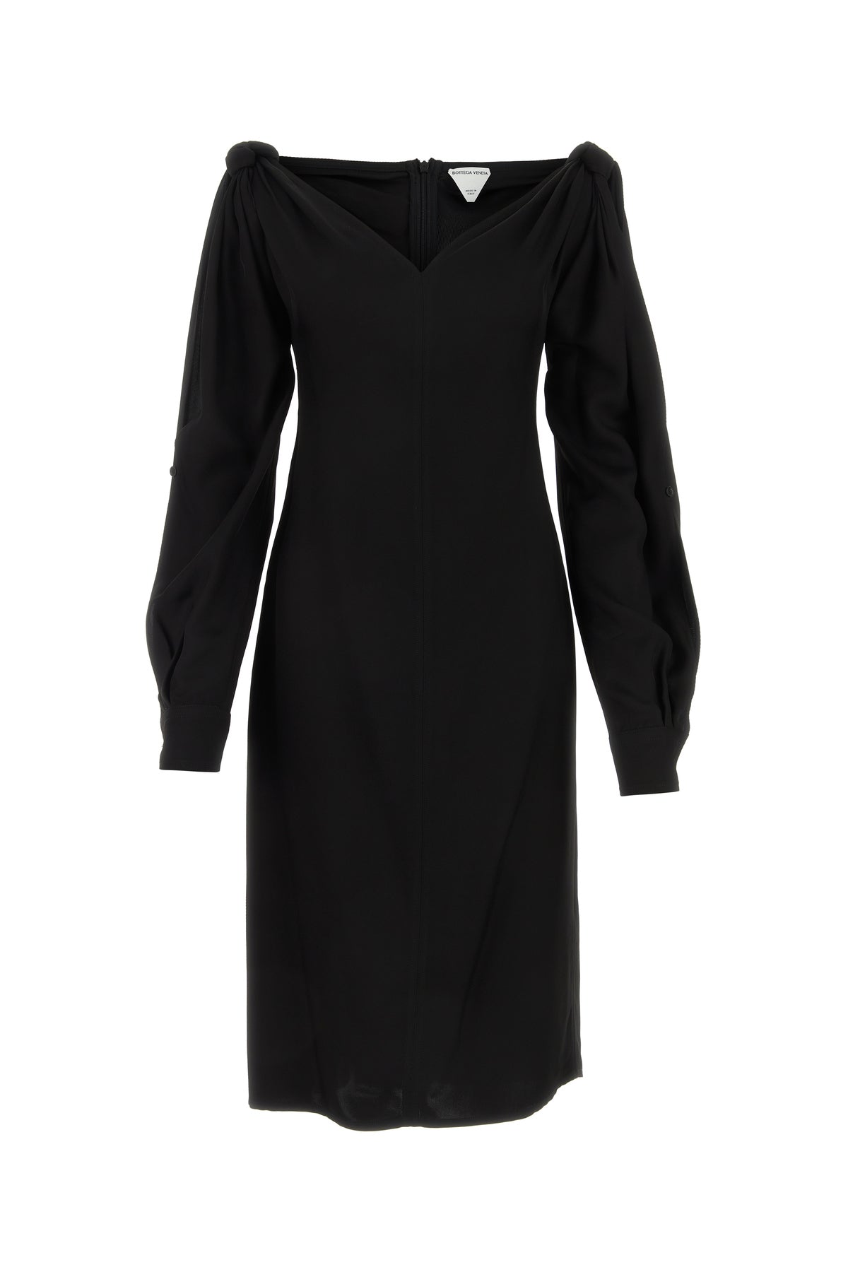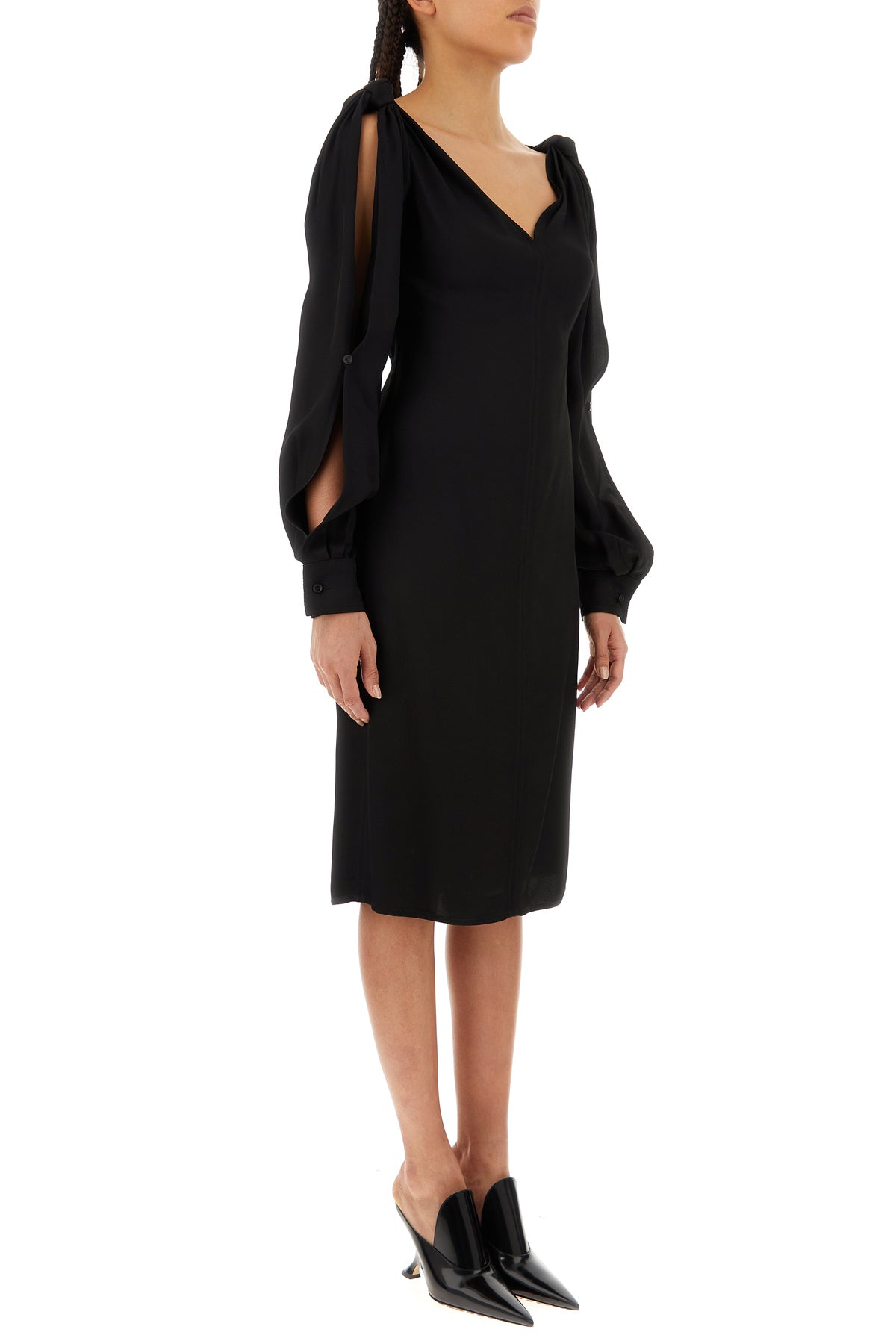 Abito midi realizzato in viscosa caratterizzato da aperture con bottoni sulle maniche arricchito da nodi decorativi sulle spalle.