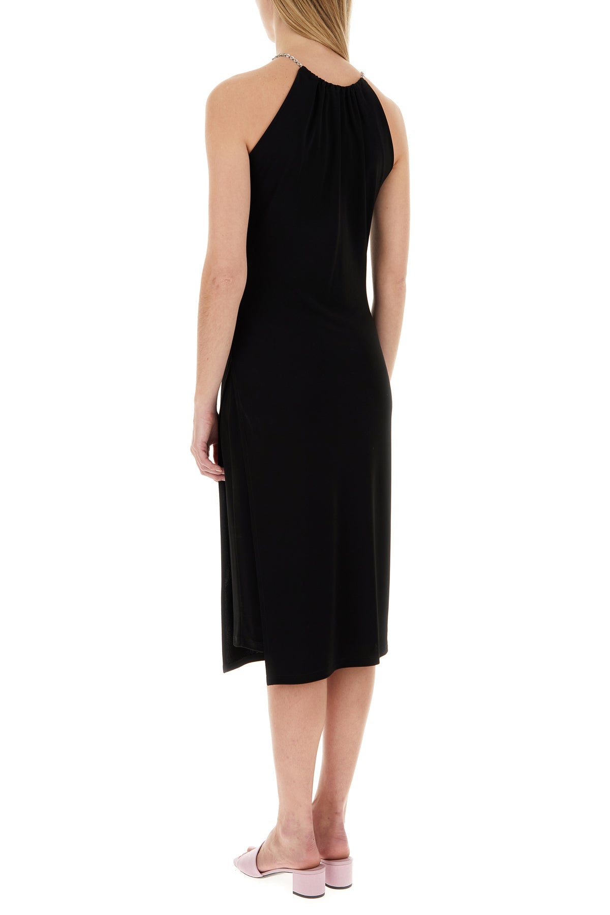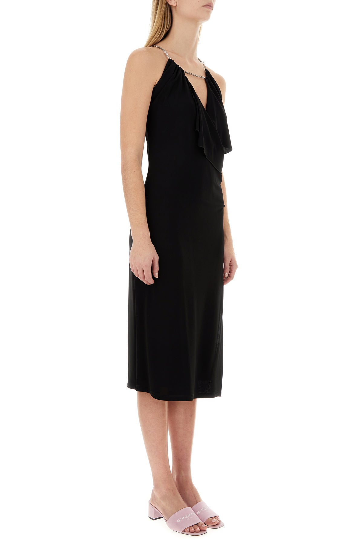 Abito midi realizzato in viscosa caratterizzato da spalline in catena metallica e catena metallica sulla parte frontale.