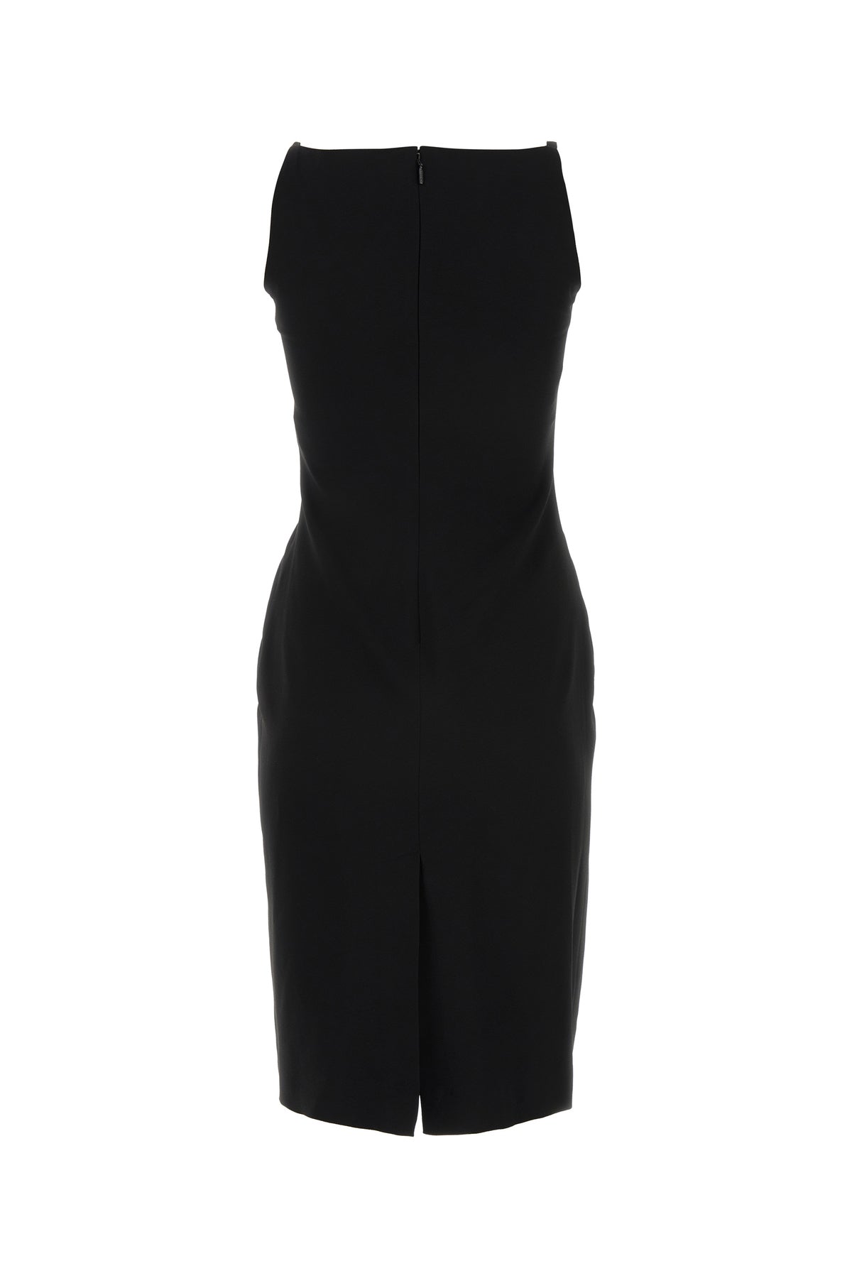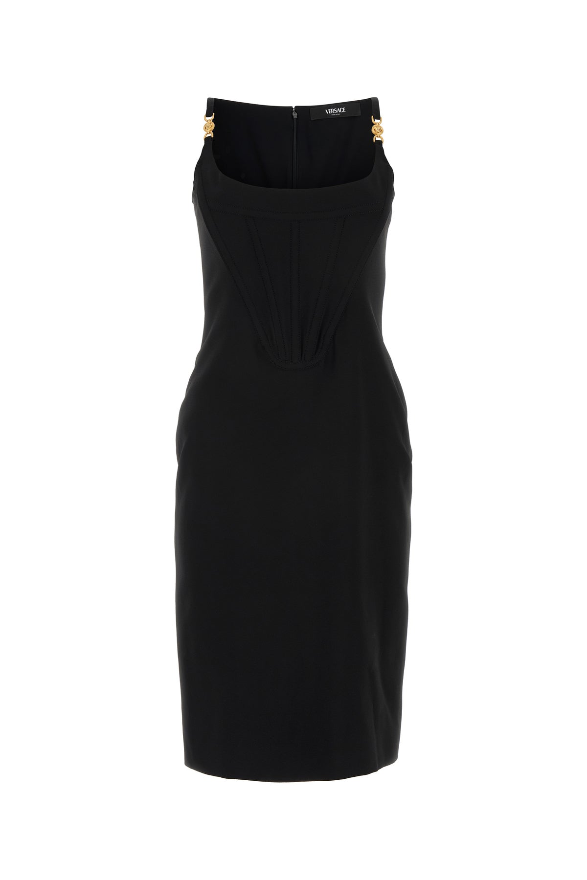 Abito midi realizzato in viscosa stretch caratterizzato da corpetto arricchito da dettagli iconica Testa di Medusa in metallo sulle spalline.