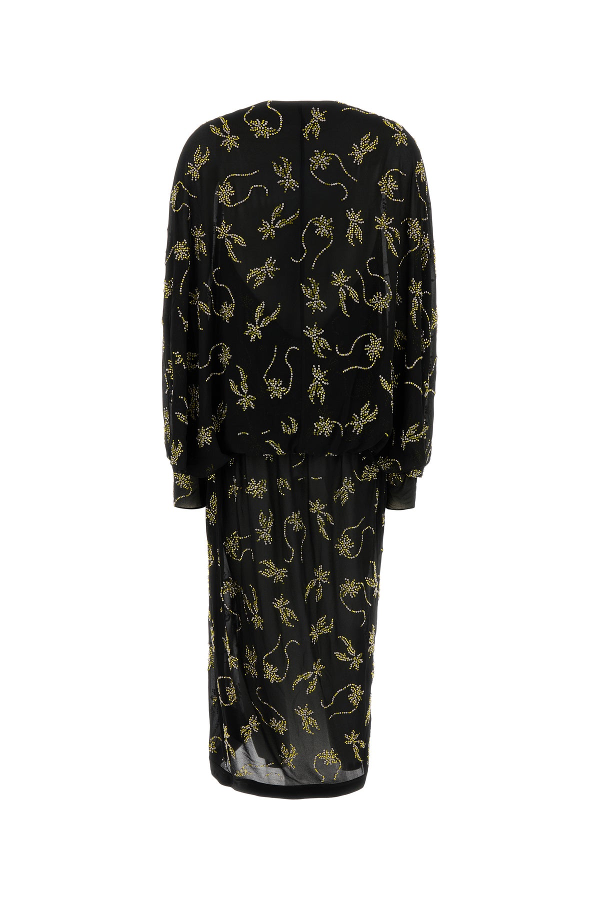Abito midi realizzato in chiffon arricchito da decorazioni gioiello su tutta la superficie.