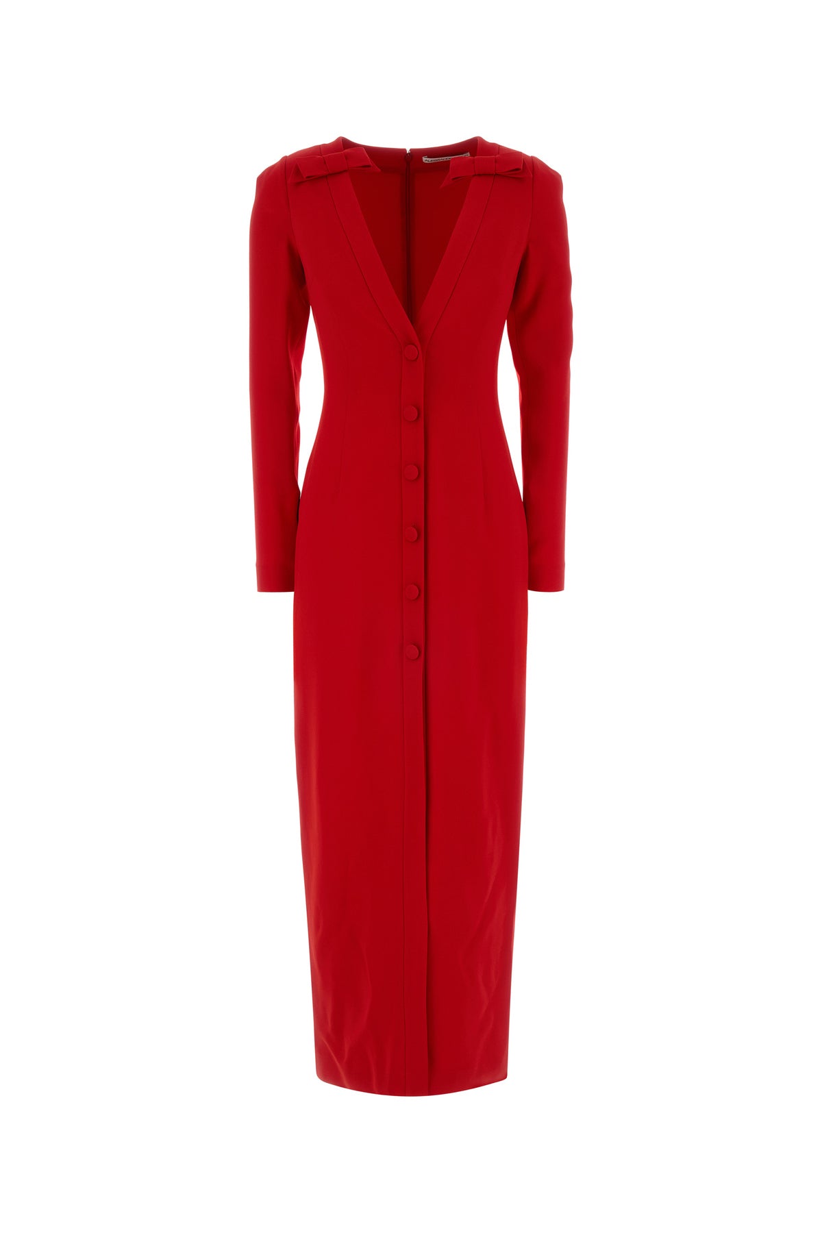 Abito lungo realizzato in cady stretch arricchito da fiocchi decorativi sulla parte superiore.
