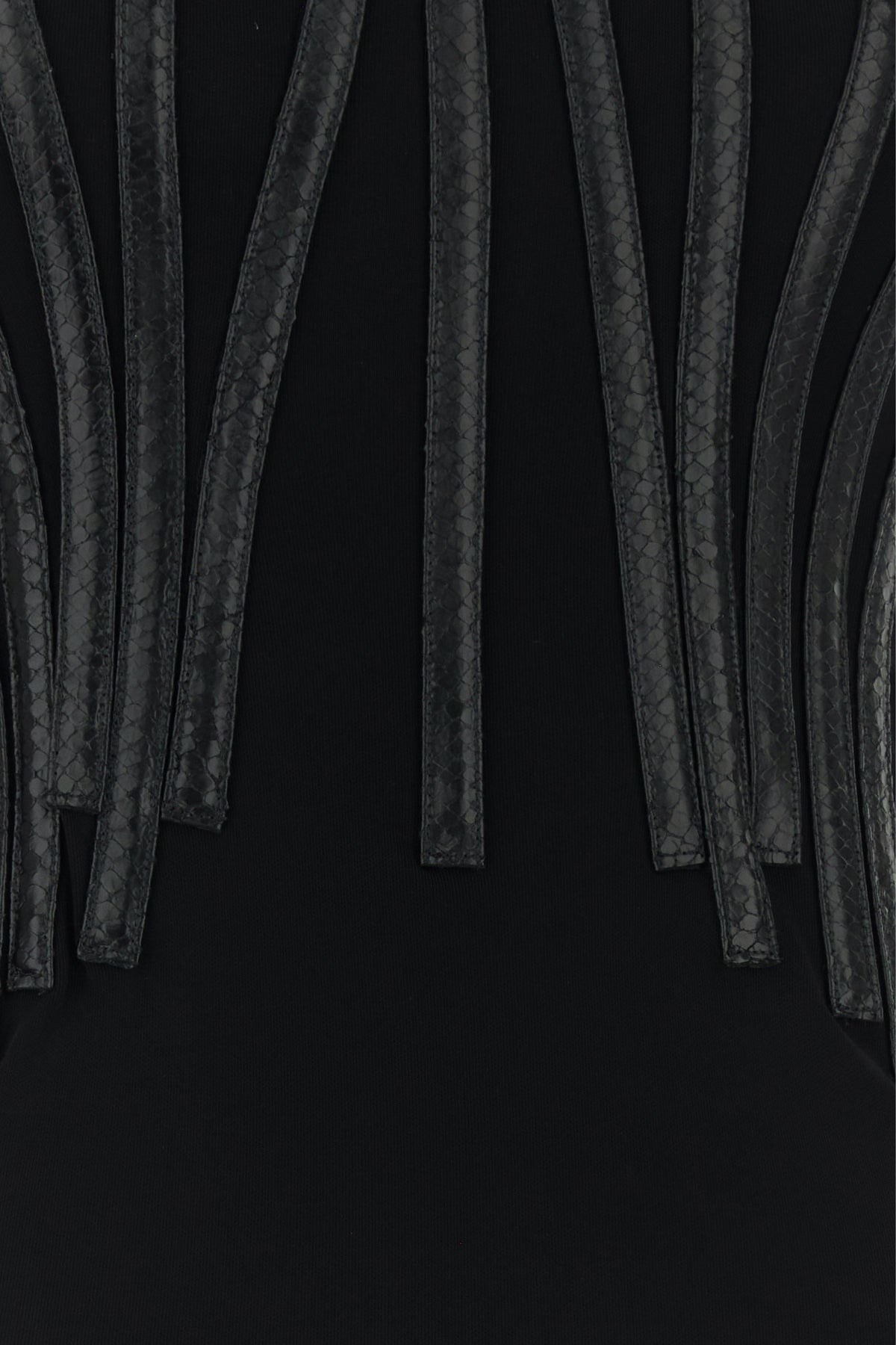 Abito lungo realizzato in crepe di viscosa arricchito da inserti in pelle impressa a motivo coccodrillo sulla parte superiore.