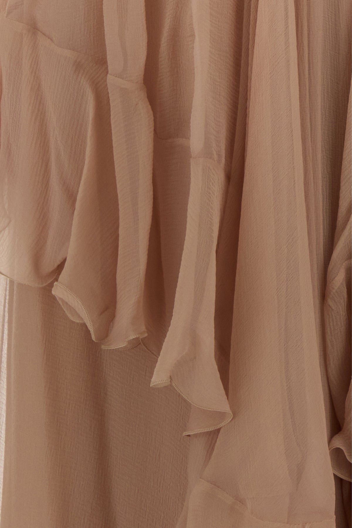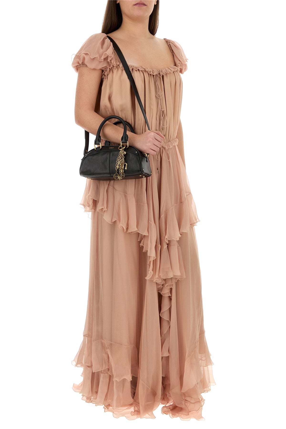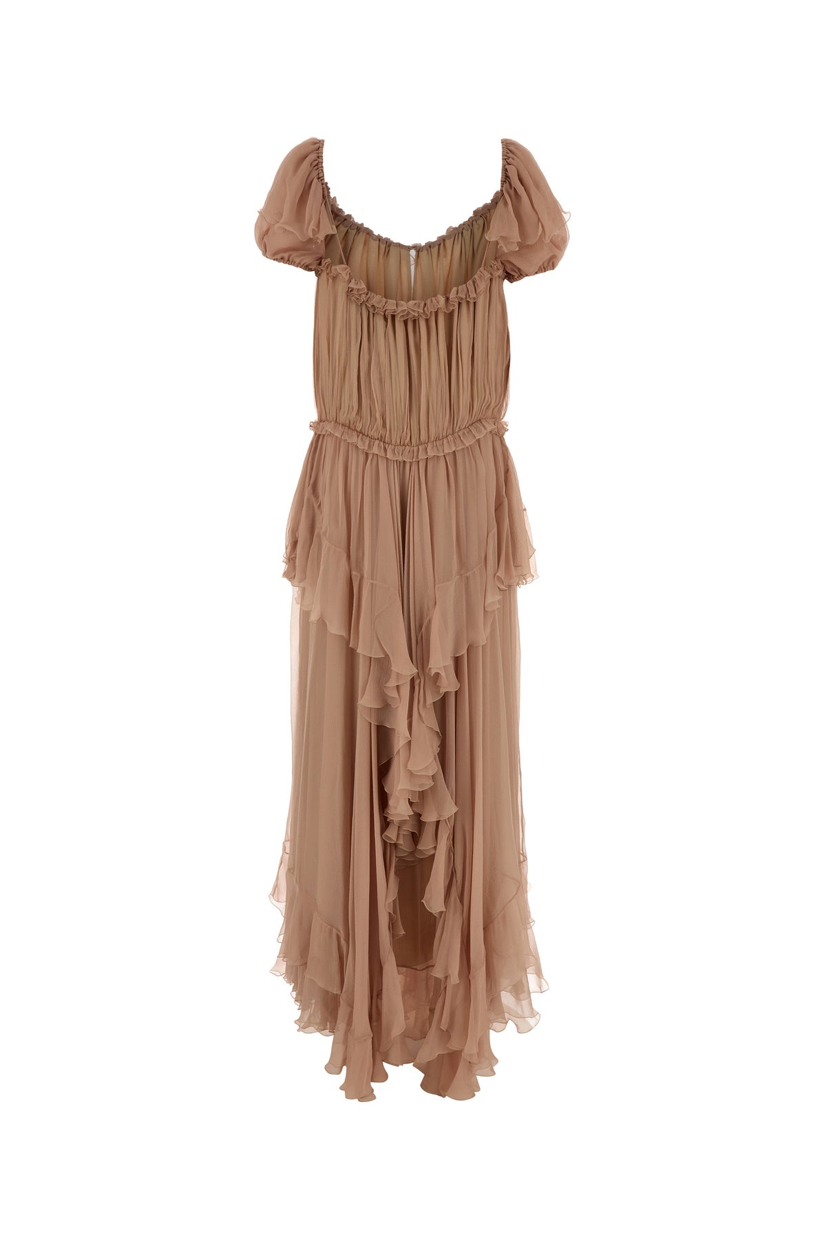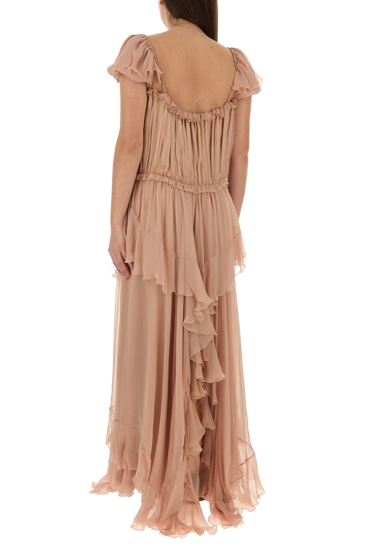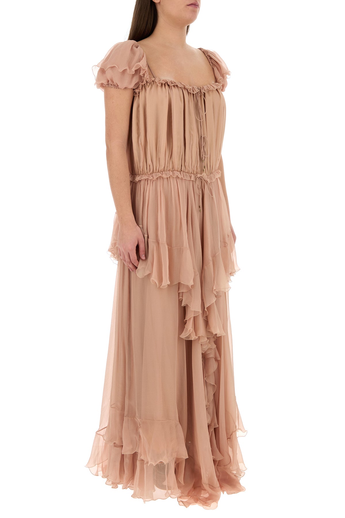 Abito lungo realizzato in mussola di pura seta arricchito da volant e laccetti da annodare sulla parte frontale.