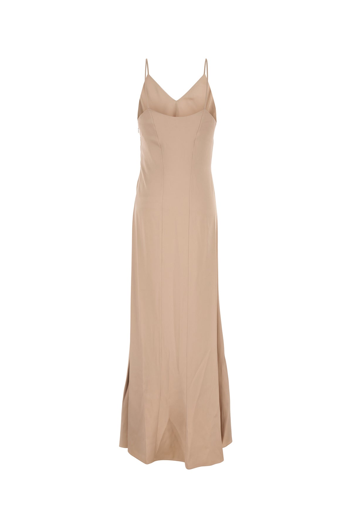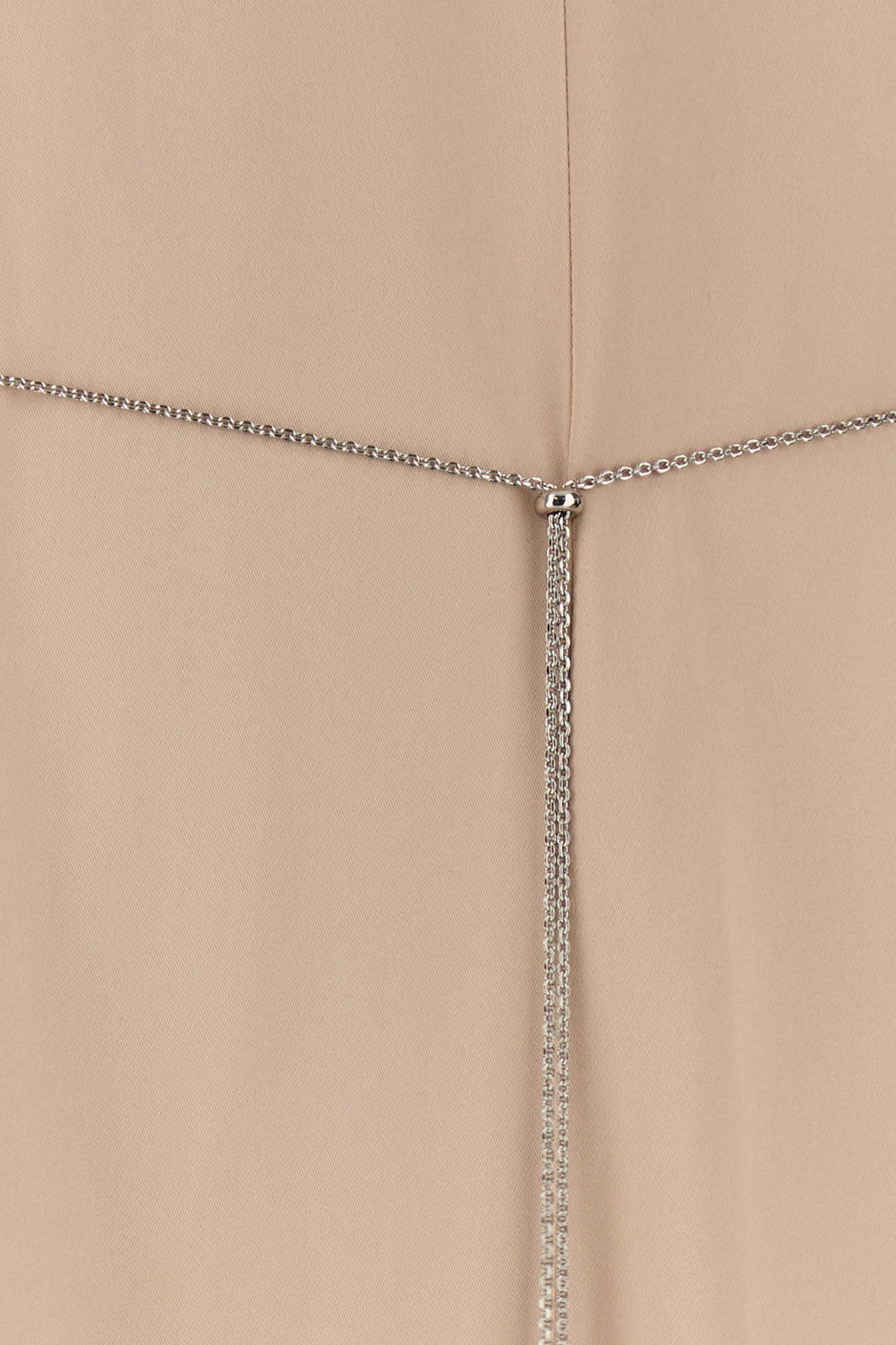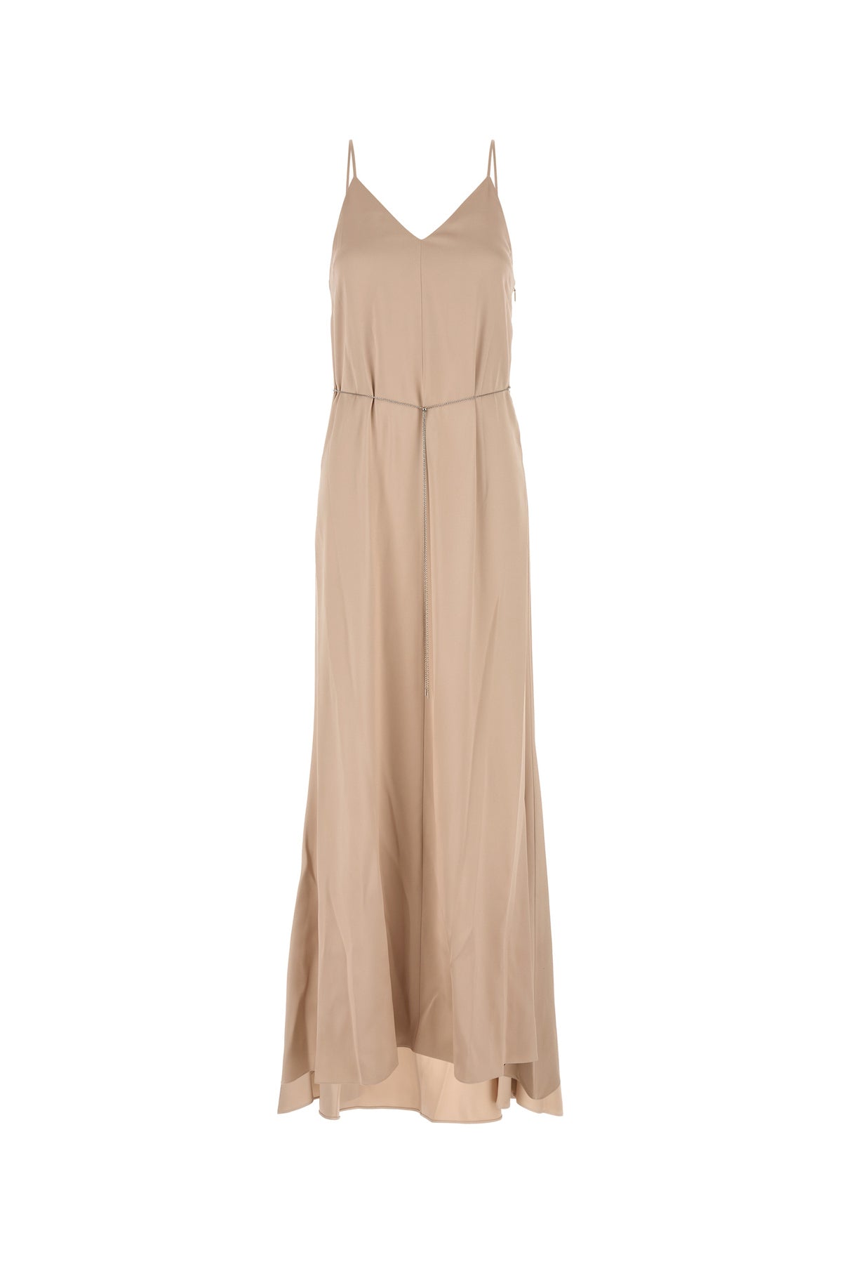 Abito lungo realizzato in raso di pura seta arricchito da cintura in catena metallica amovibile.