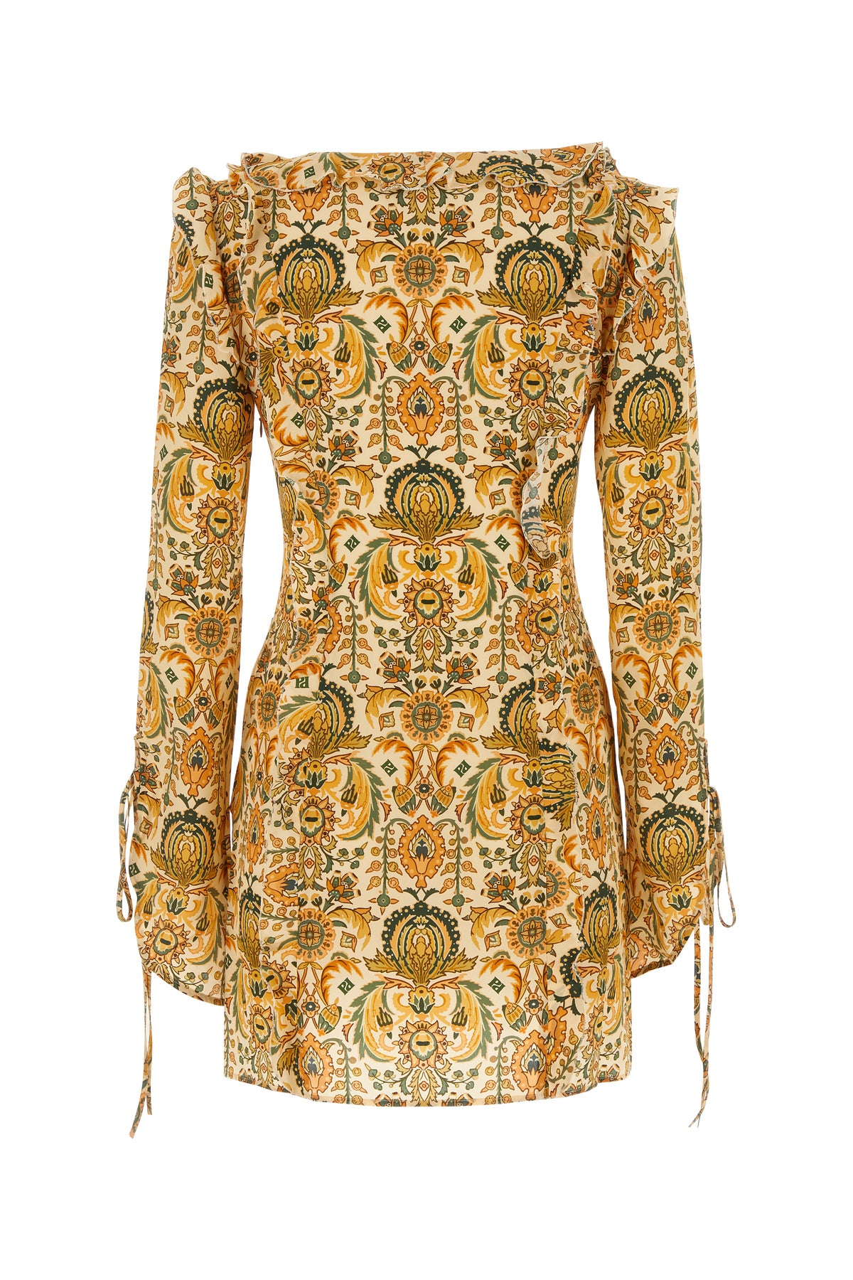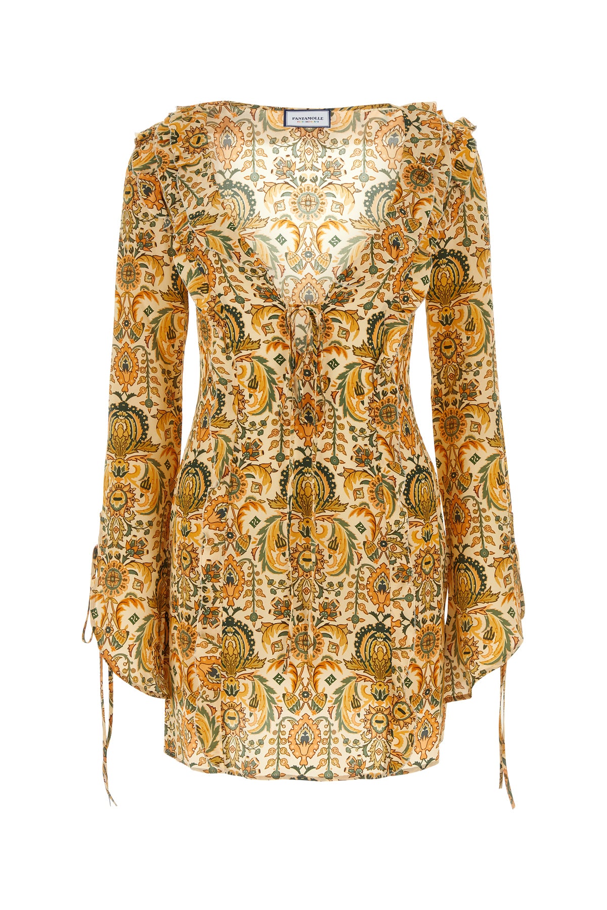 Abito realizzato in pura seta caratterizzato da particolare stampa su tutta la superficie arricchito da rouches sulla parte frontale e sul retro.