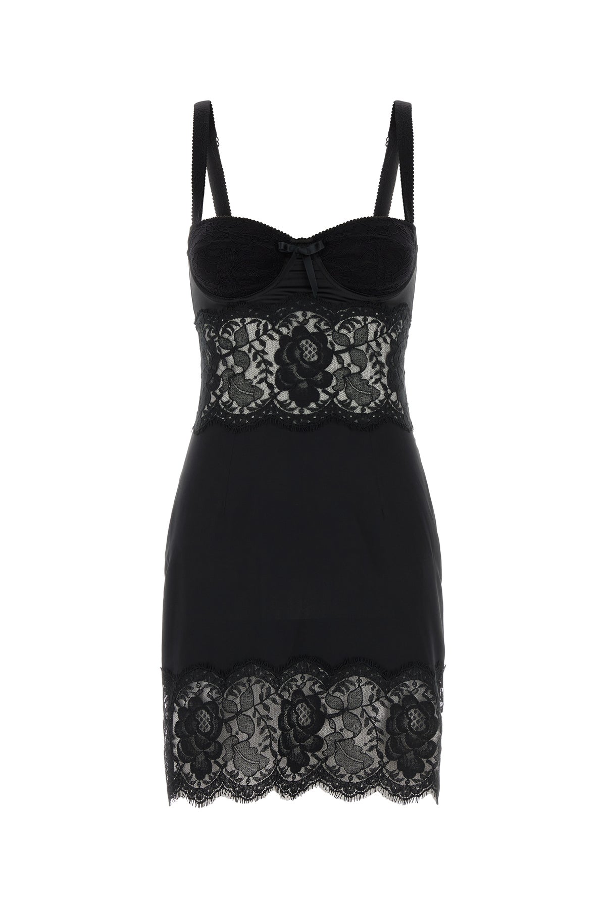 Abito realizzato in pizzo e raso arricchito da fiocco decorativo sulla scollatura a cuore.