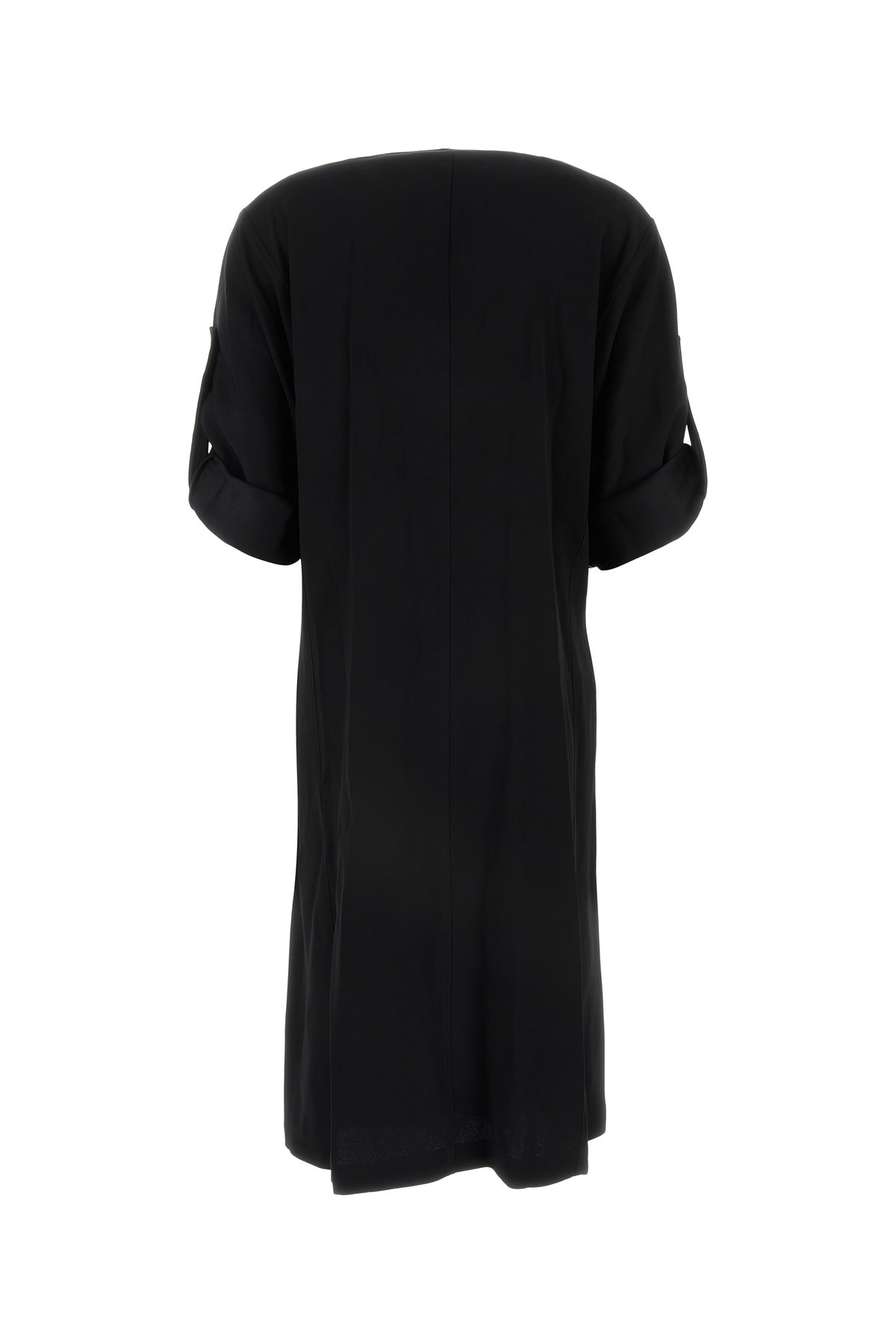 Abito midi realizzato in crepe arricchito da spilla logata metallica sulla parte frontale.
