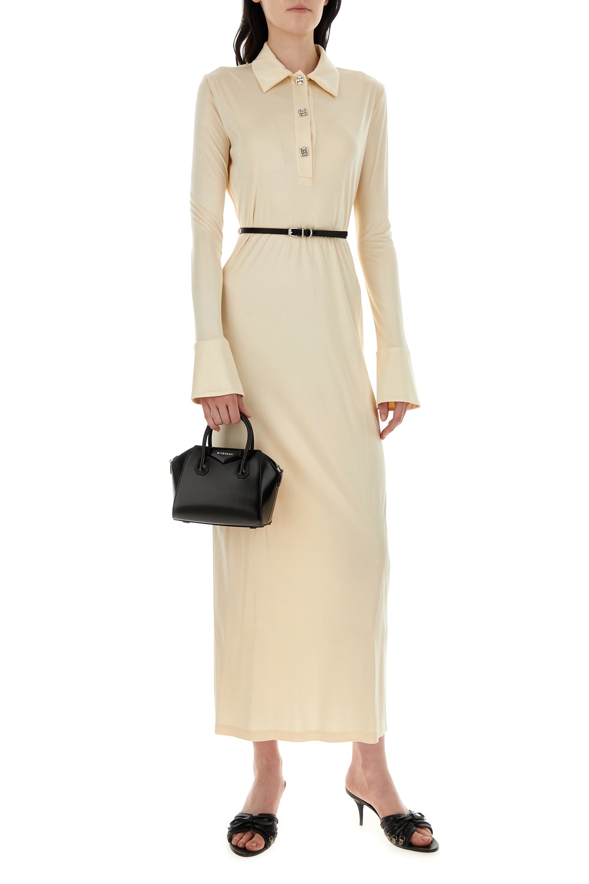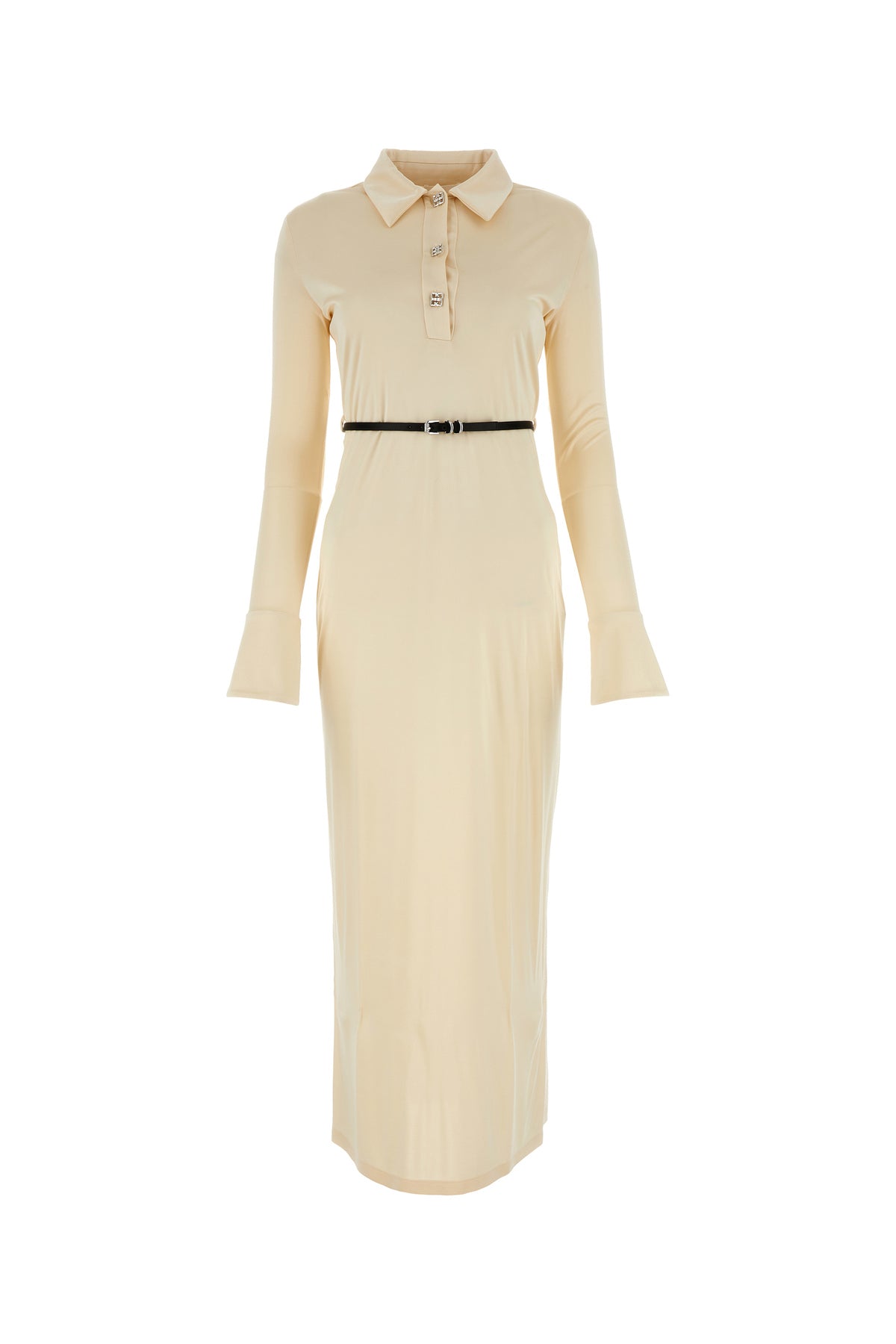 Abito dal taglio lungo realizzato in jersey caratterizzato da chiusura parziale mediante bottoni metallici 4G Liquid sulla parte frontale arricchita da cintura amovibile in pelle.