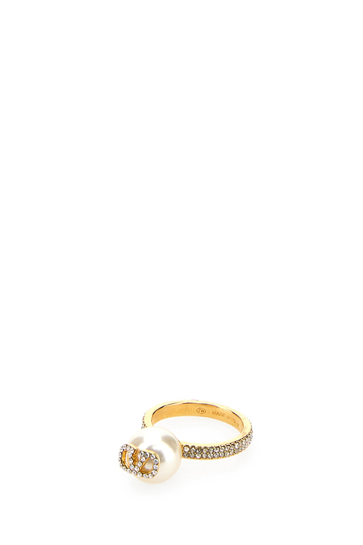 Anello realizzato in metallo placcato color oro interamente ricoperto da cristalli arricchito da perla con dettaglio VLogo gioiello.