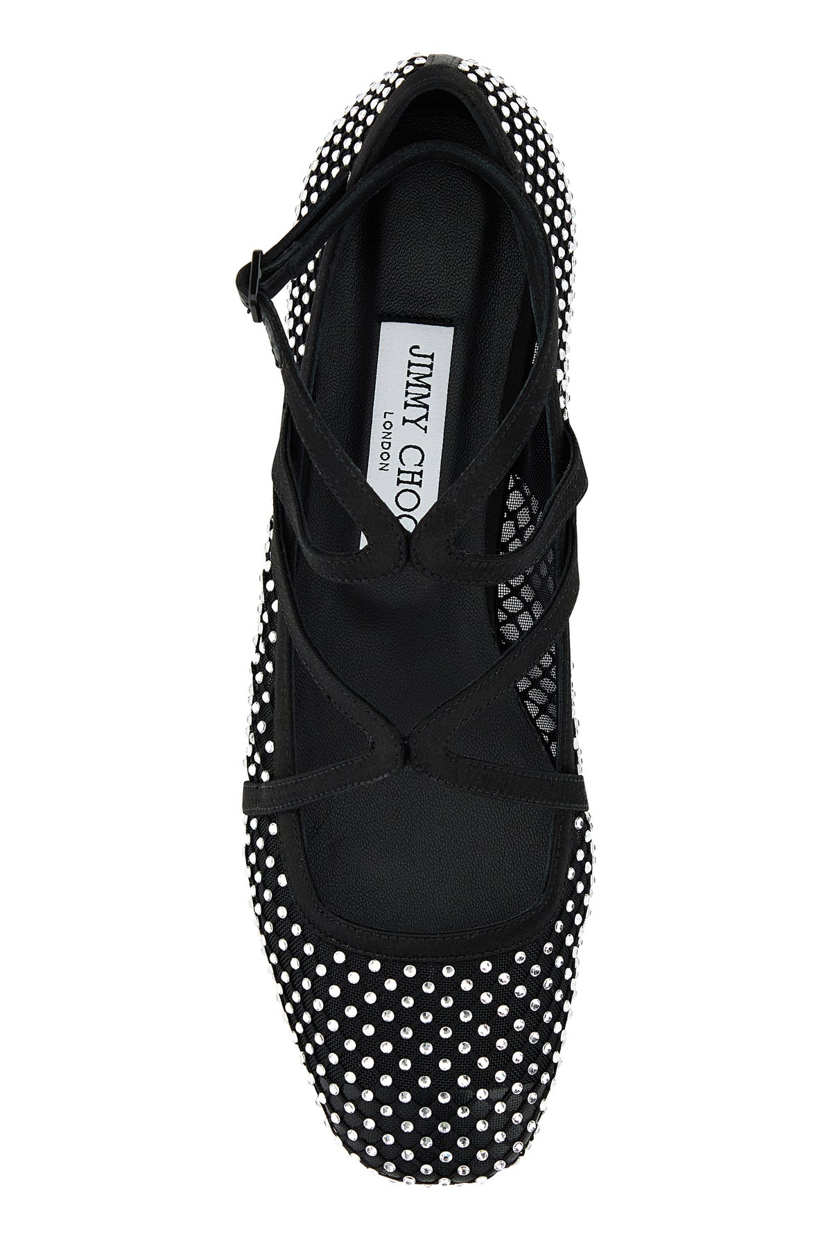 Ballerine realizzate in rete interamente ricoperte da cristalli arricchite da cinturini in raso sul collo del piede.