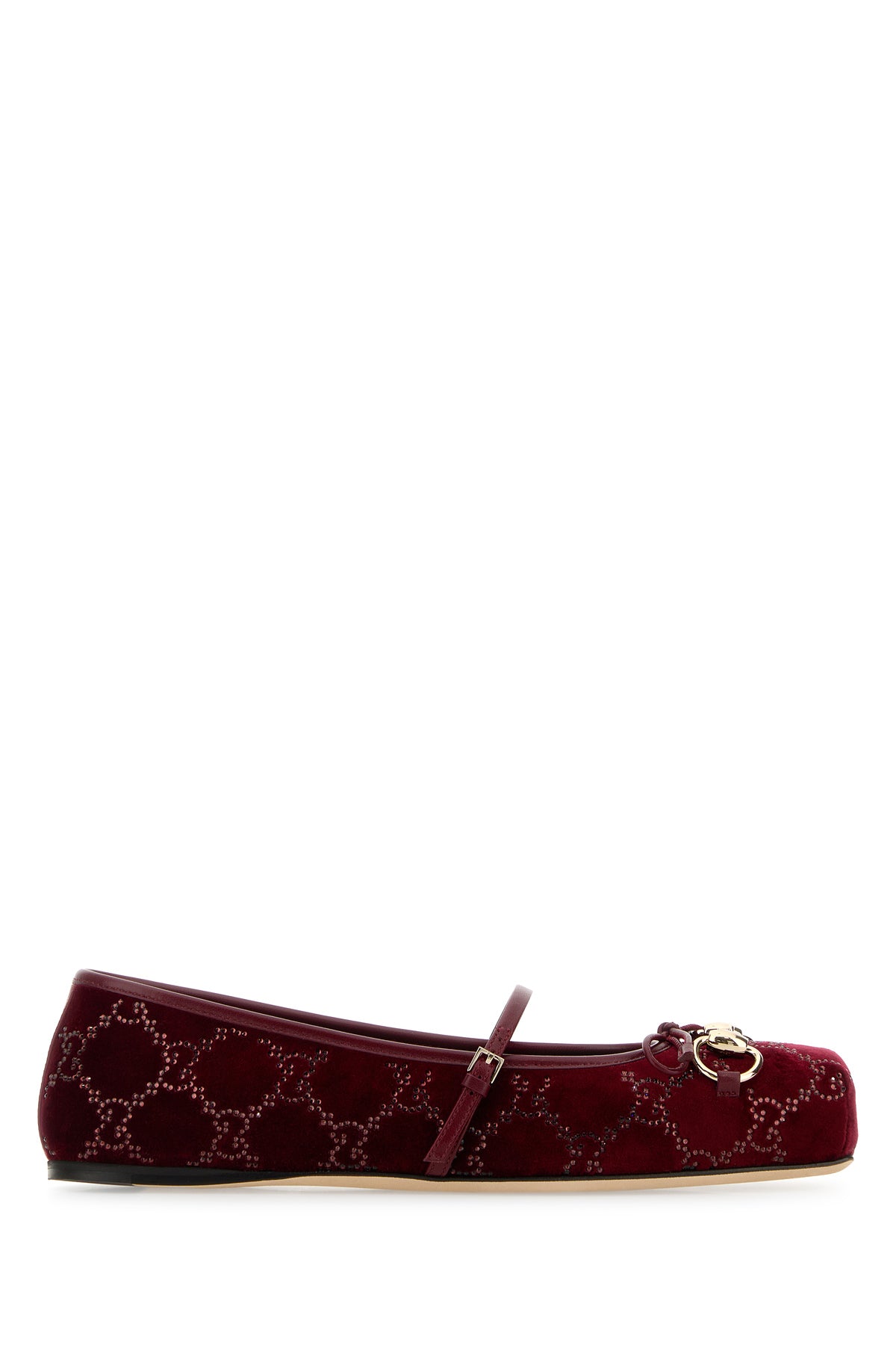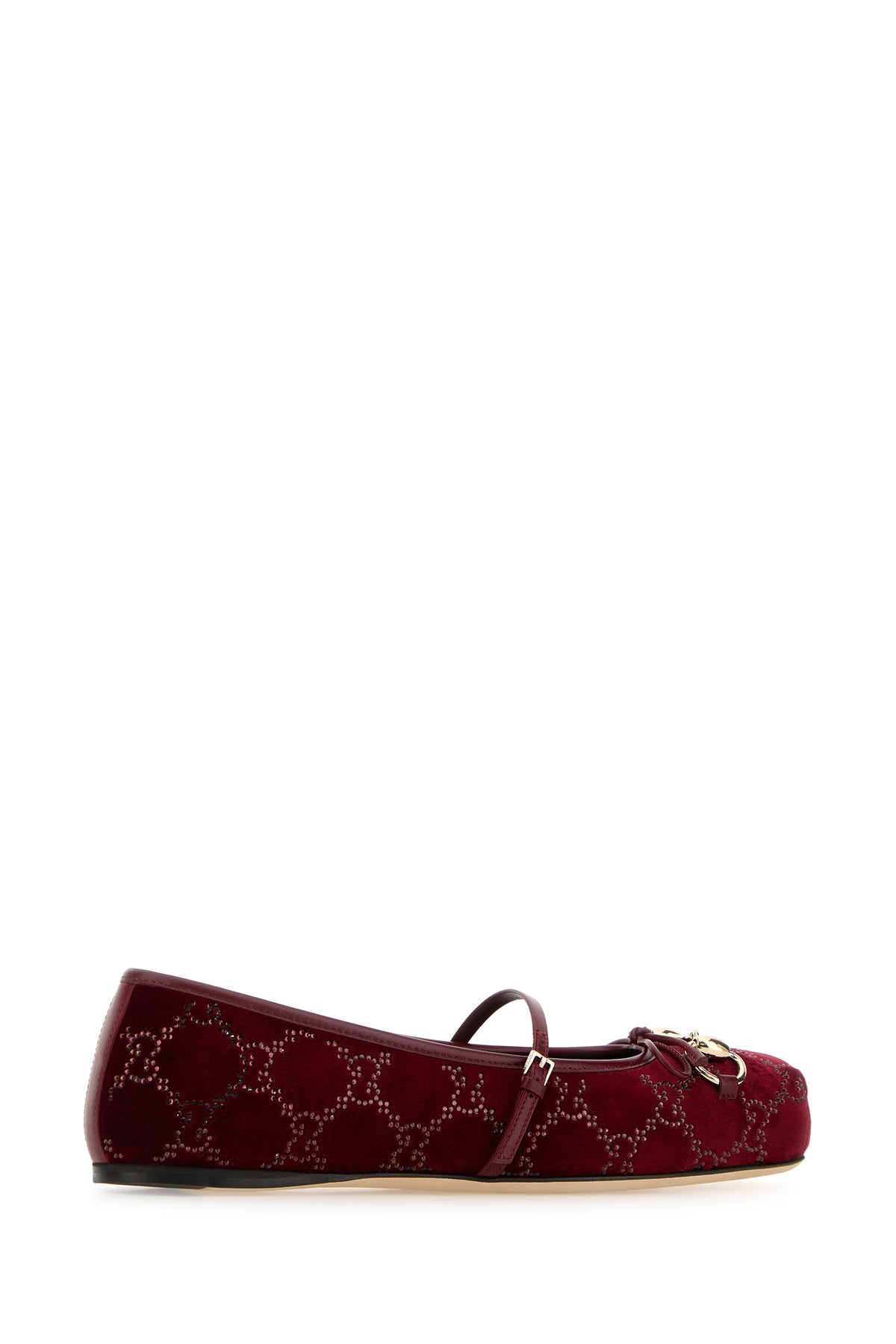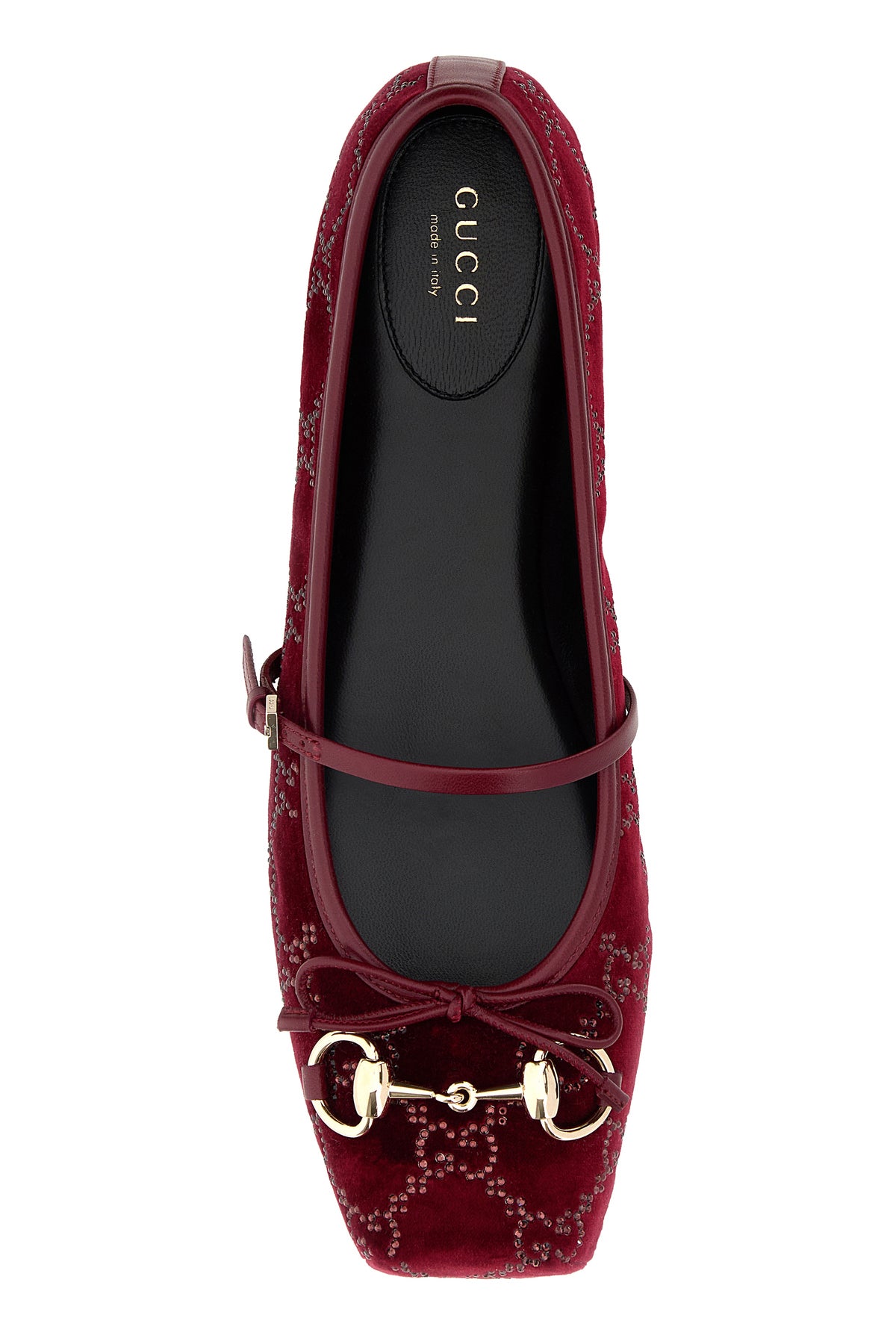 Ballerine realizzate in velluto caratterizzate da motivo GG in cristalli su tutta la superficie arricchite da dettaglio metallico Morsetto sul collo del piede.