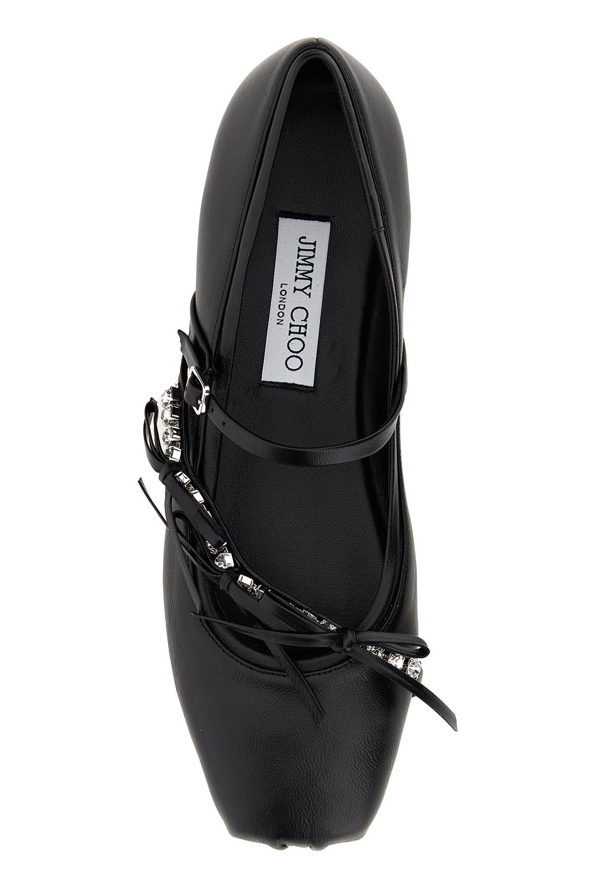 Ballerine realizzate in nappa arricchite da cinturino gioiello con fiocchetti decorativi sul collo del piede.