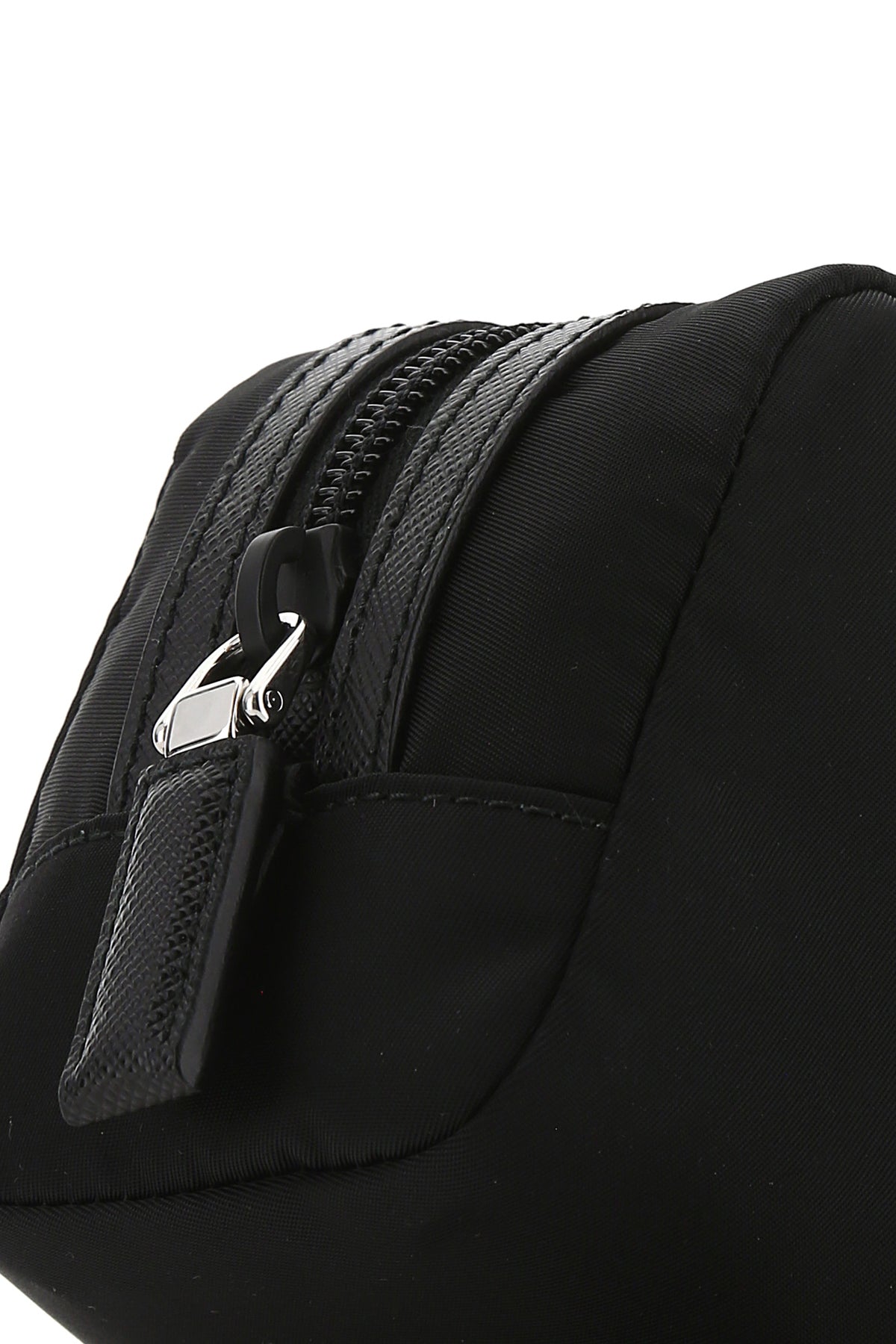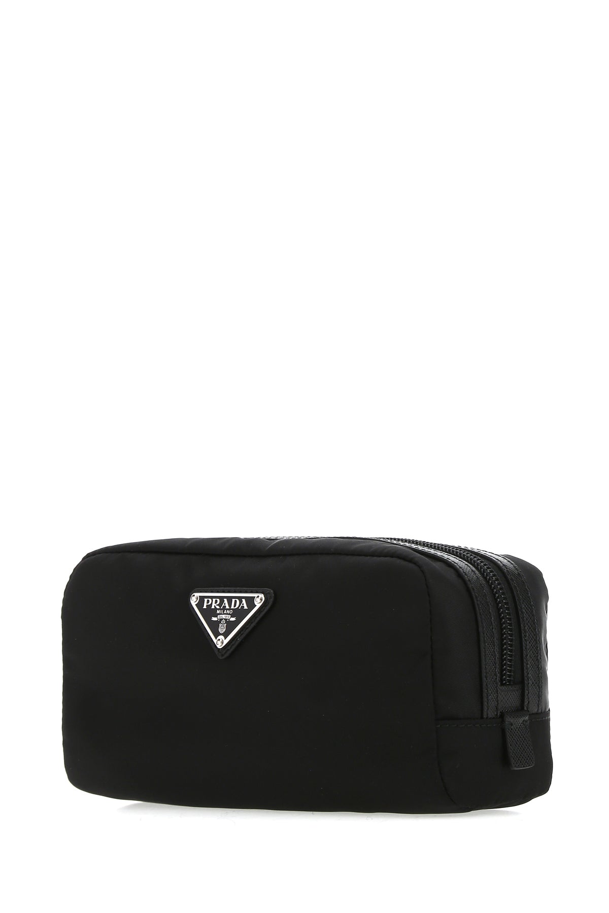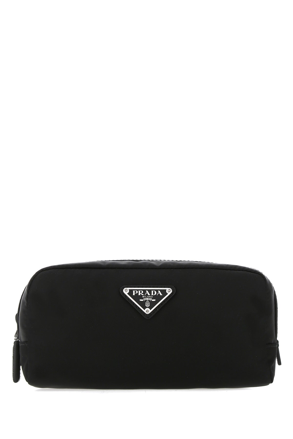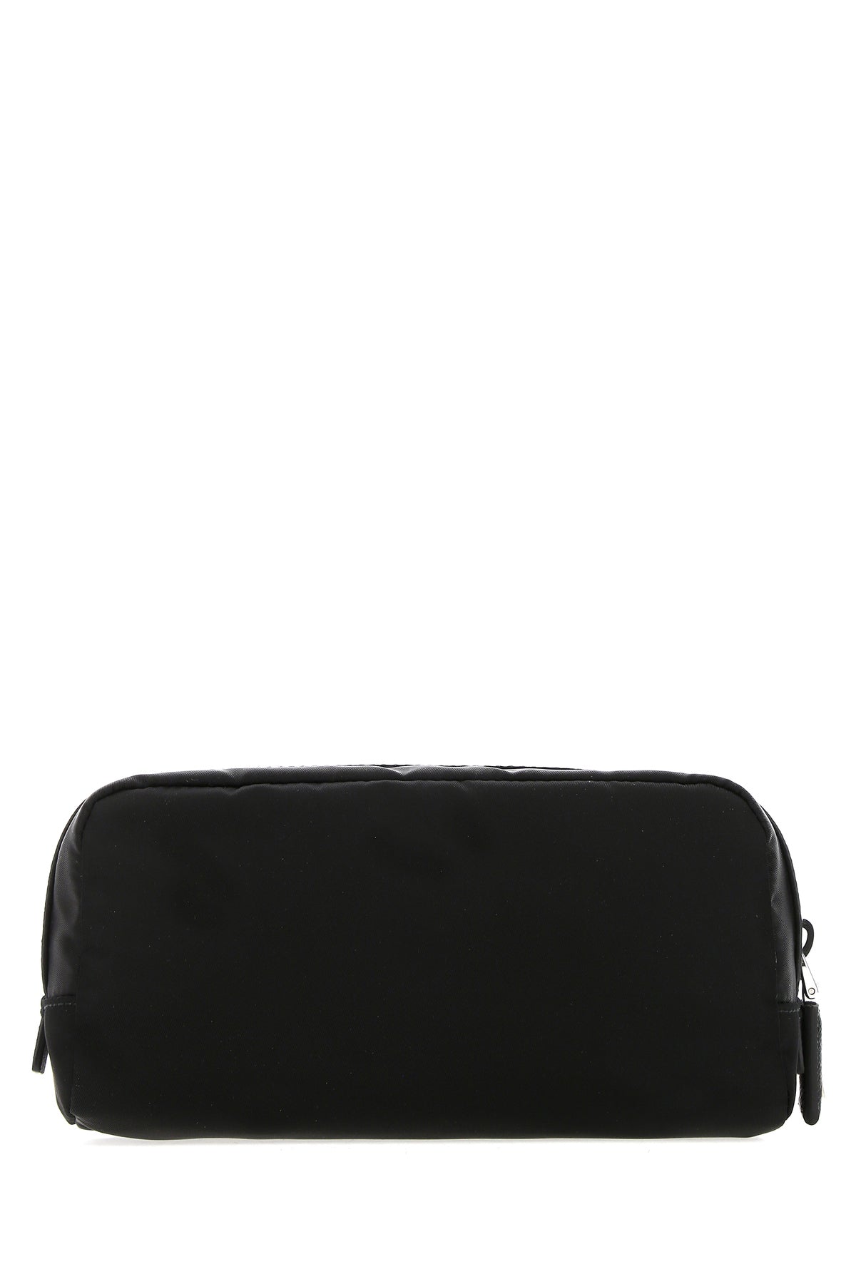 Beauty case realizzato in Re-nylon con inserti tonali in pelle Saffiano arricchito da iconico triangolo logato sulla parte frontale.