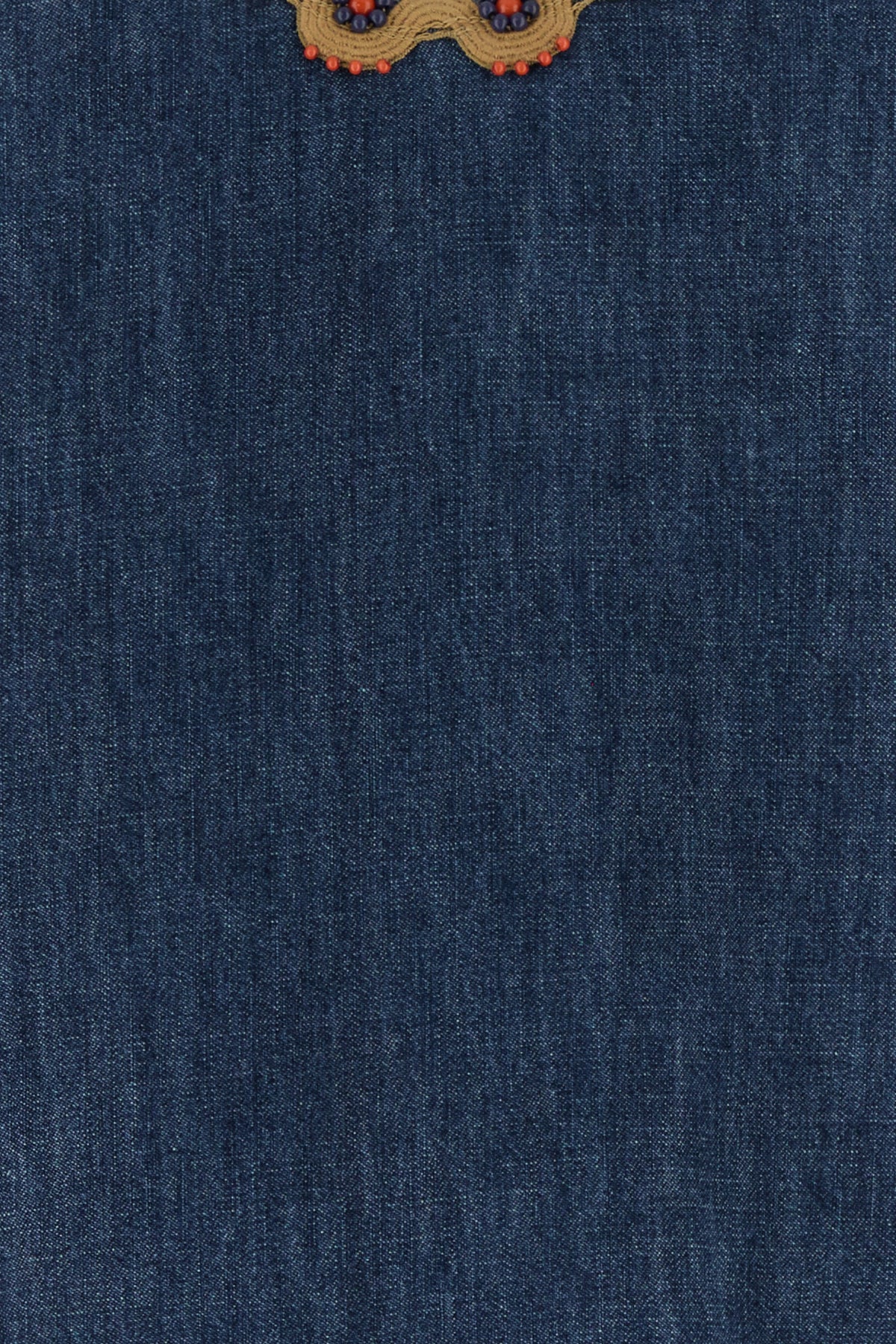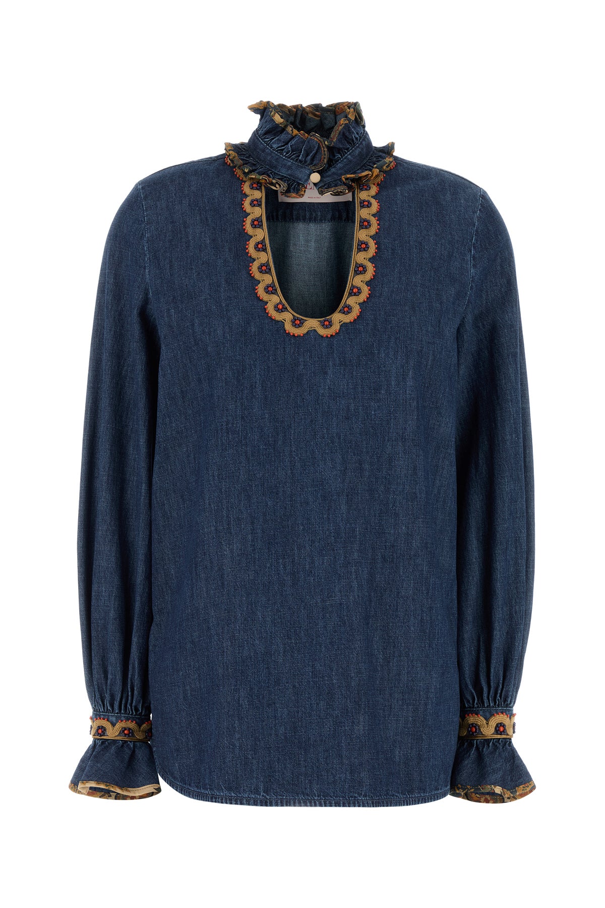 Blusa realizzata in chambray denim di puro cotone arricchita da inserti in tessuto stampato con perline sulla parte superiore e sui polsini.