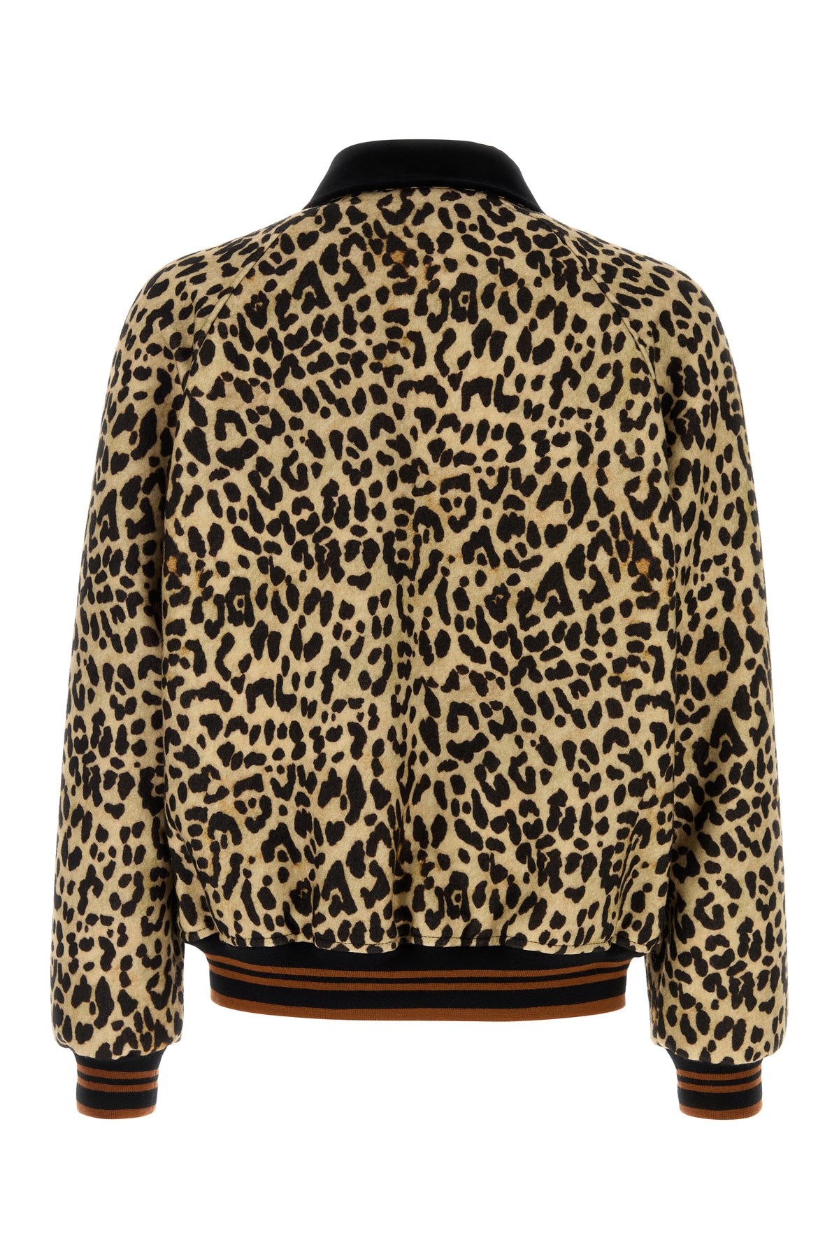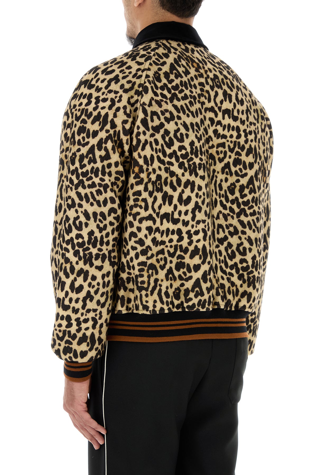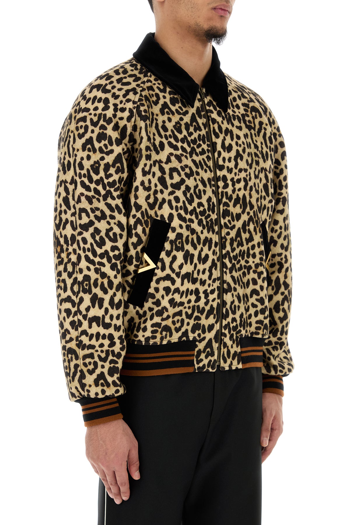 Bomber realizzato in pura lana caratterizzato da stampa animalier su tutta la superficie arricchito da dettaglio metallico V sulle due tasche a fessura sulla parte frontale.