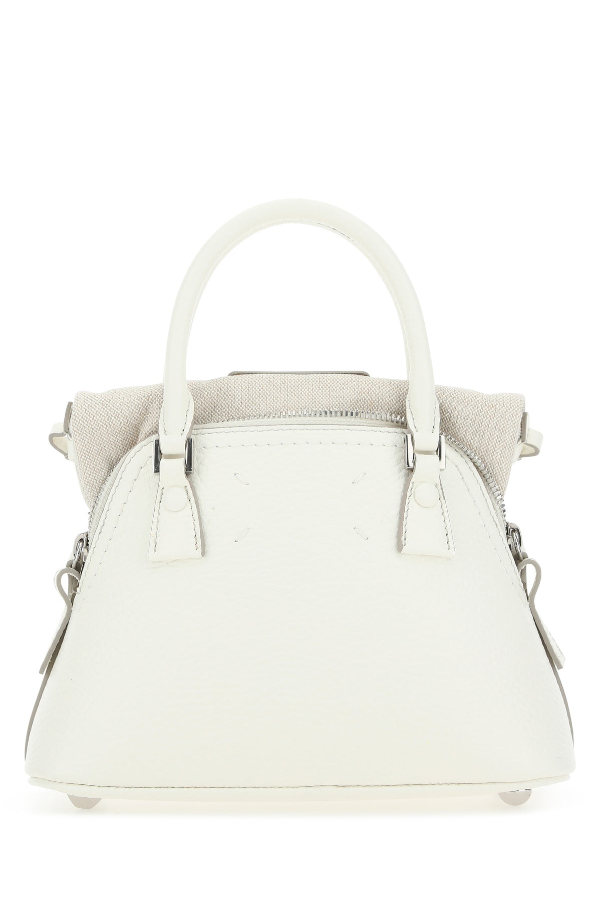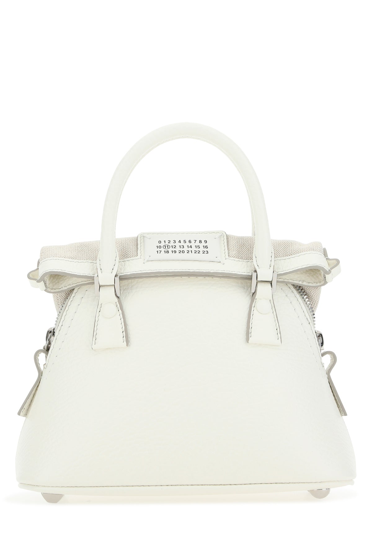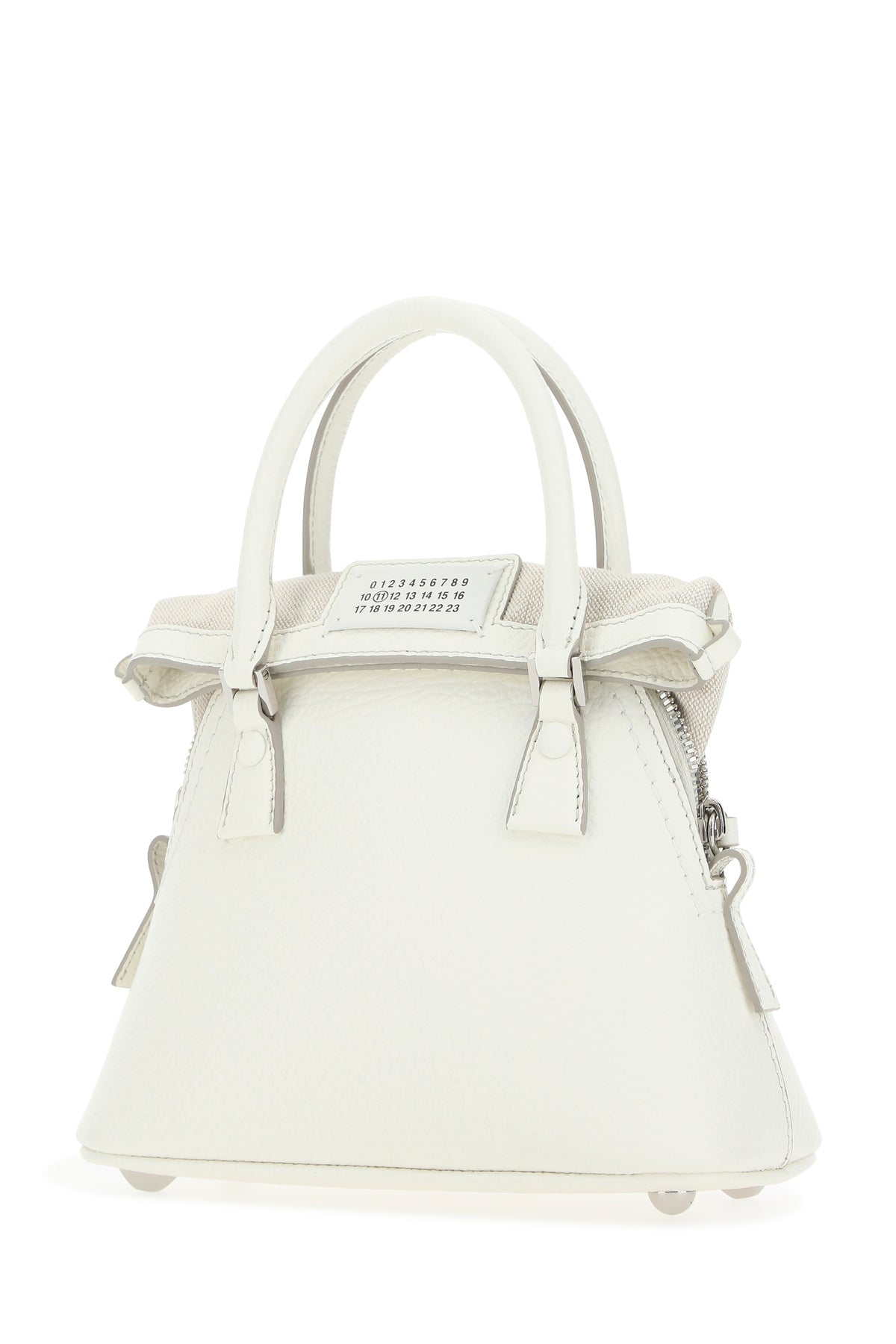Borsa a mano realizzata in pelle bovina zigrinata con inserto in tessuto tonale arricchita da etichetta logata in pelle a contrasto sulla parte frontale.