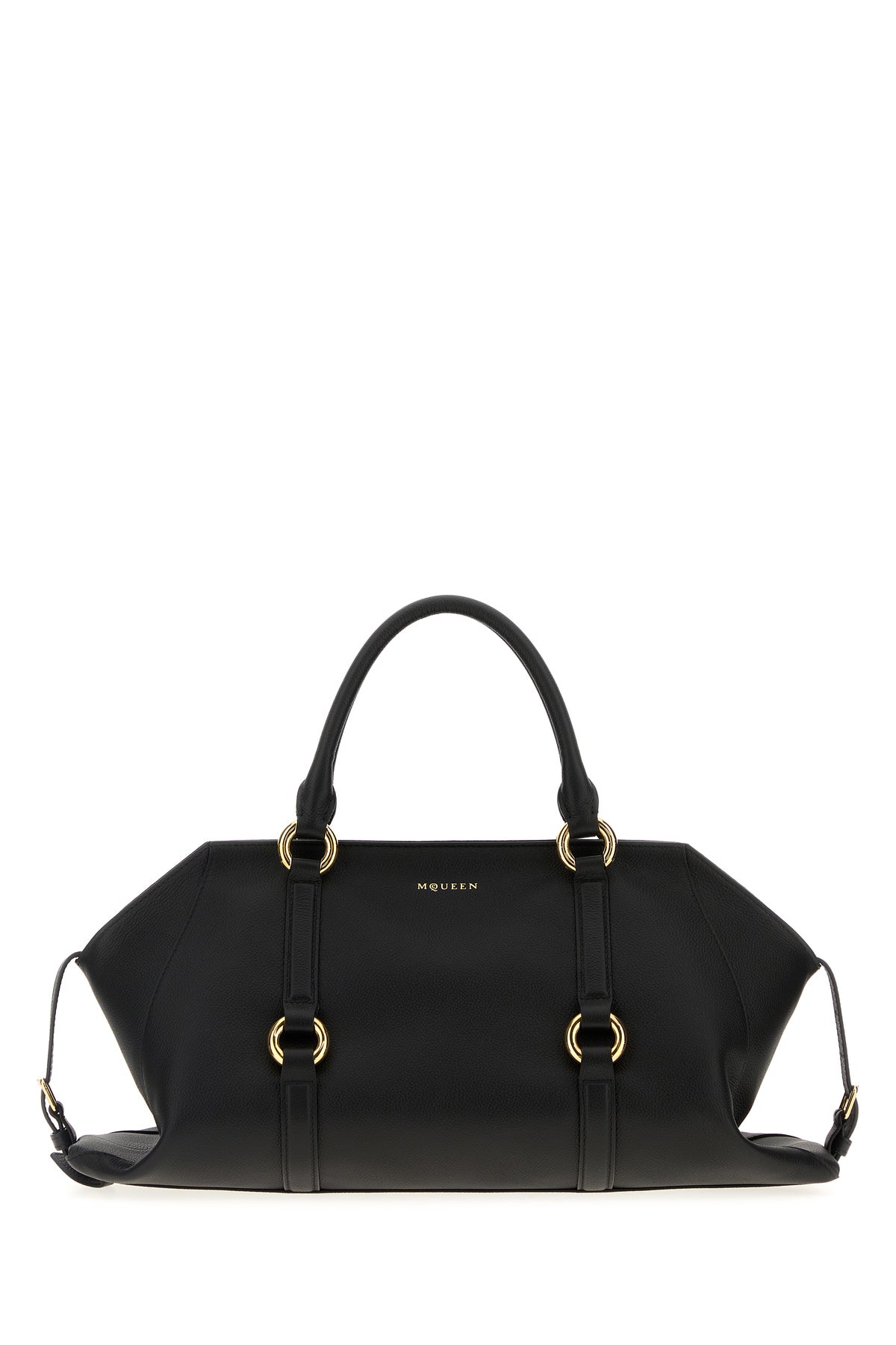 Borsa a mano realizzata in pelle di vitello martellata caratterizzata da stampa McQueen laminata sulla parte frontale arricchita da cinturini Harness.
