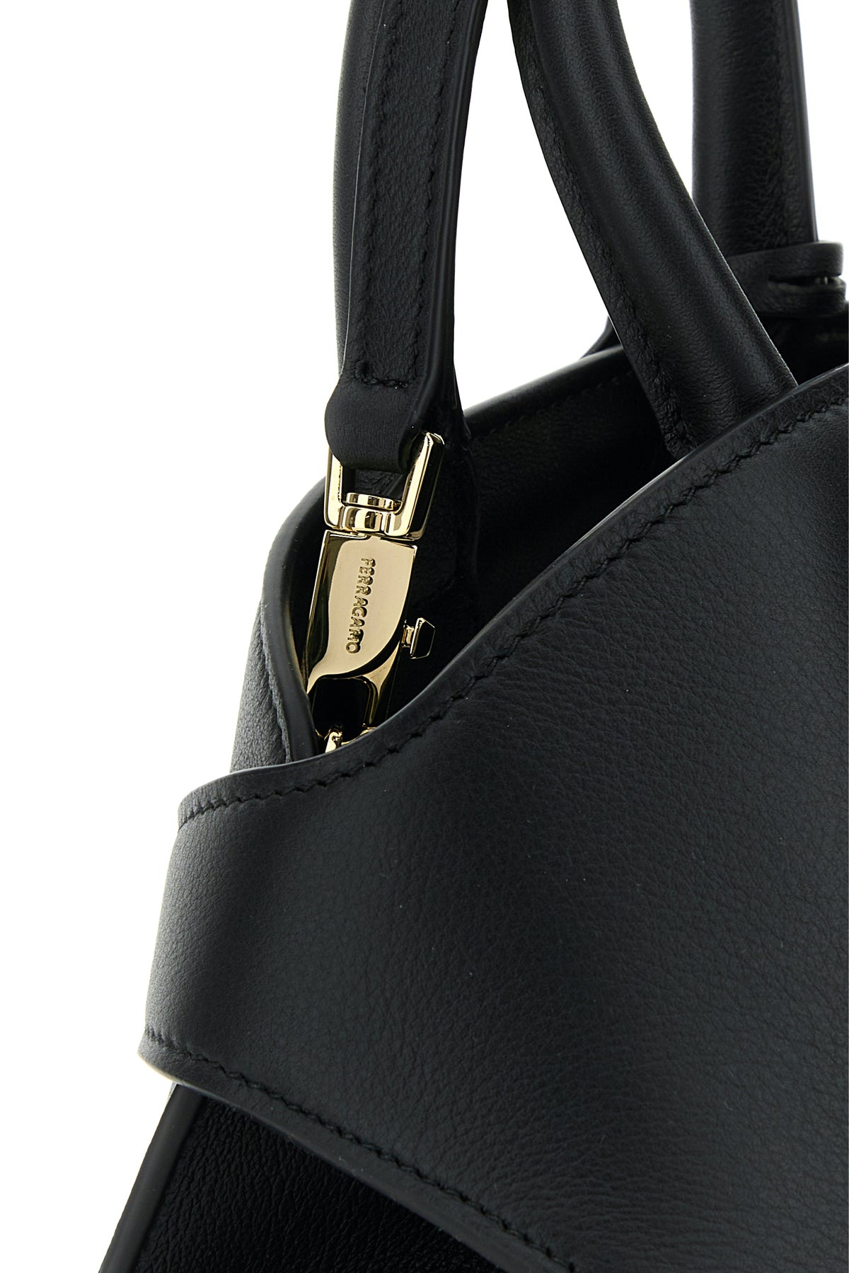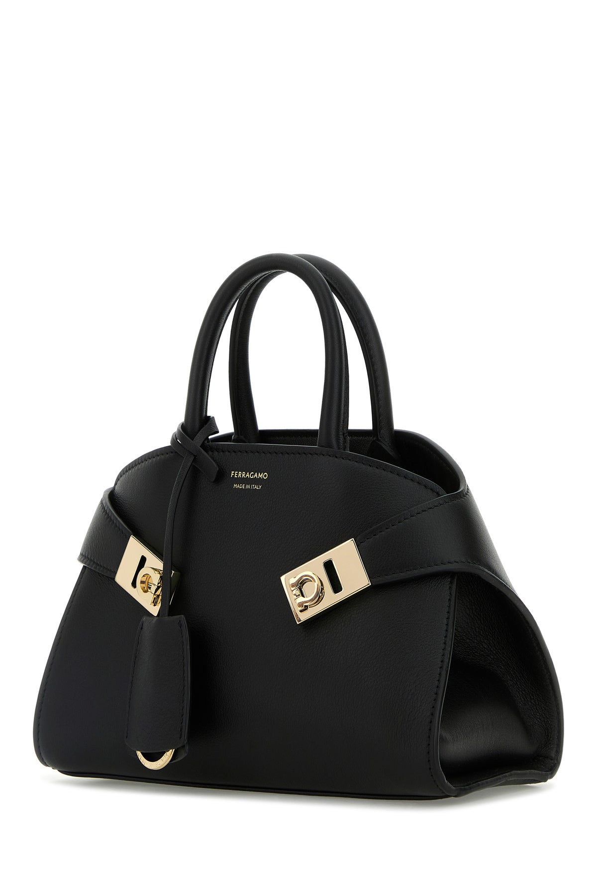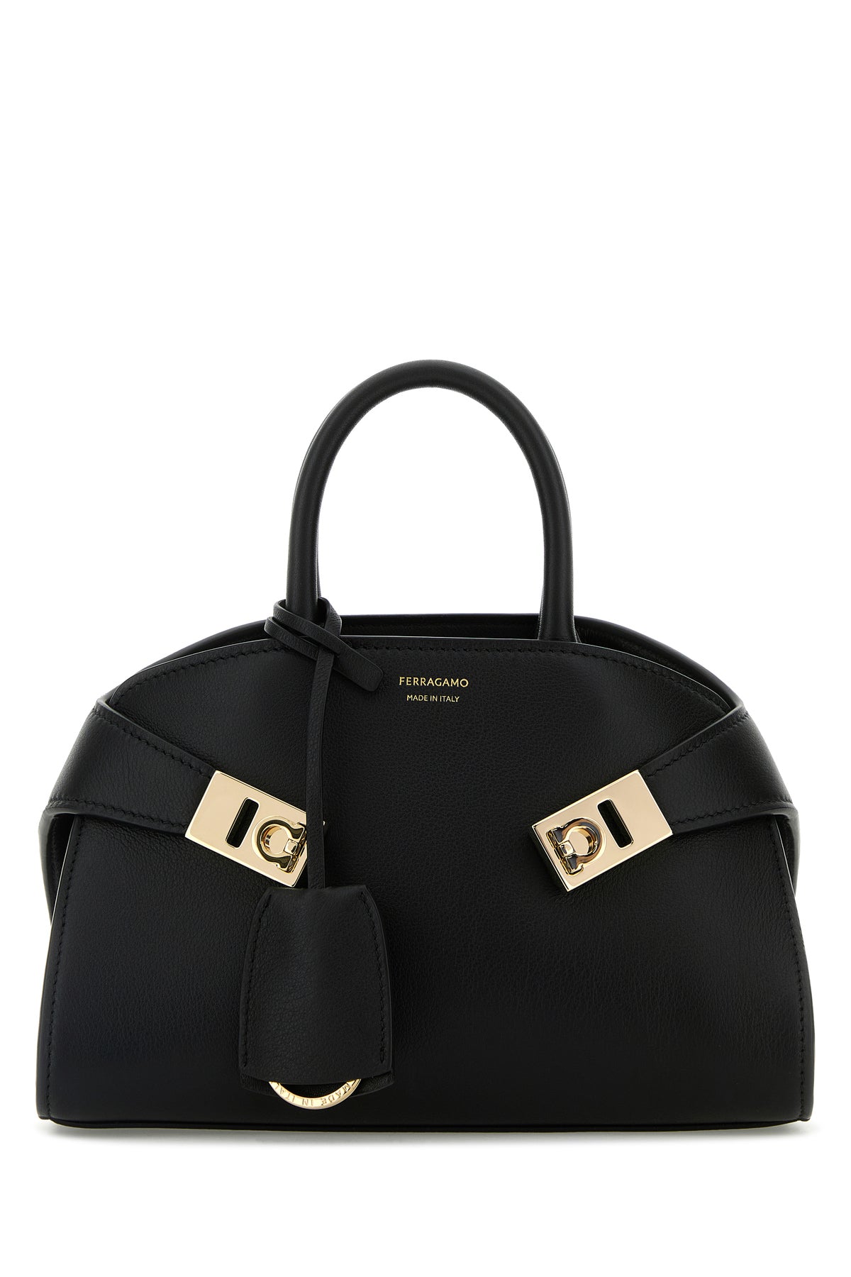 Borsa a mano realizzata in pelle di vitello leggermente martellata caratterizzata da logo stampato laminato sulla parte frontale arricchita da cinturini in pelle tonale con dettagli Gancini in metallo sulla parte frontale e accessorio portachiavi amovibile.