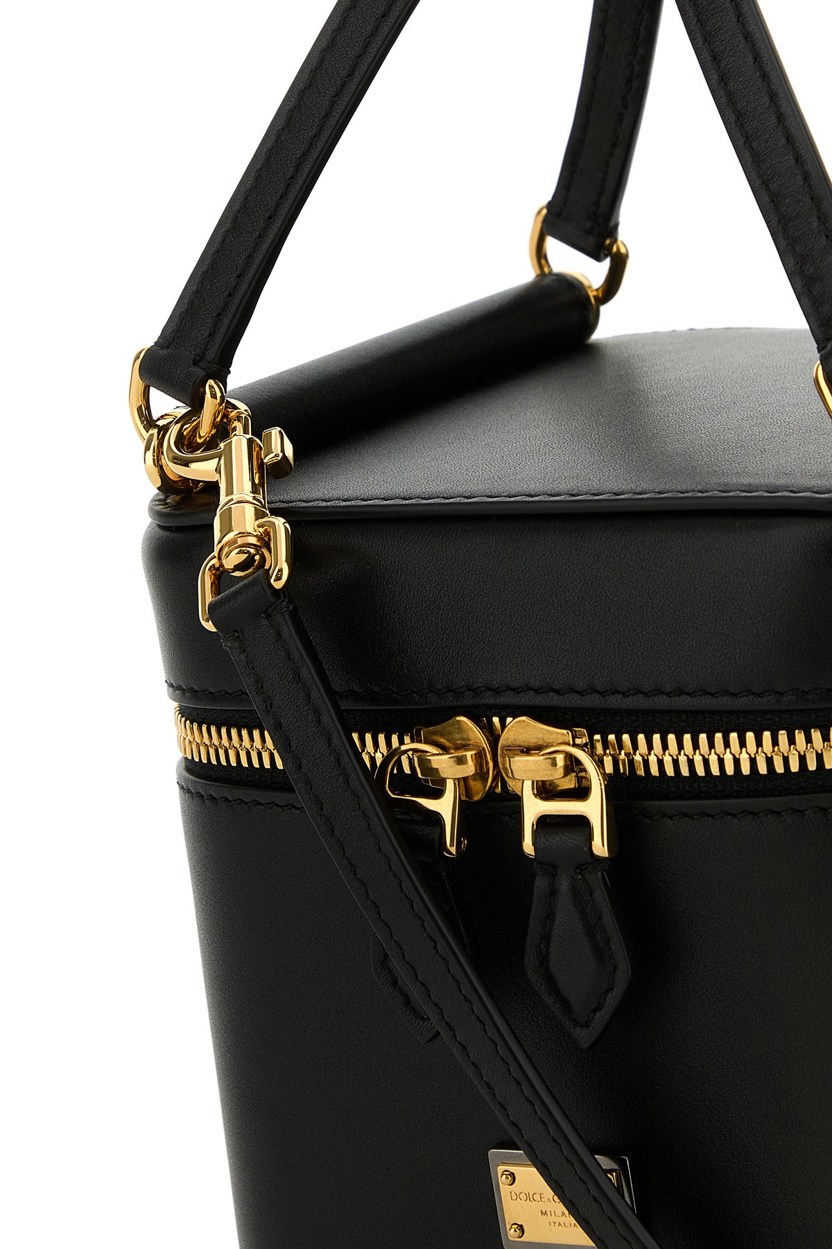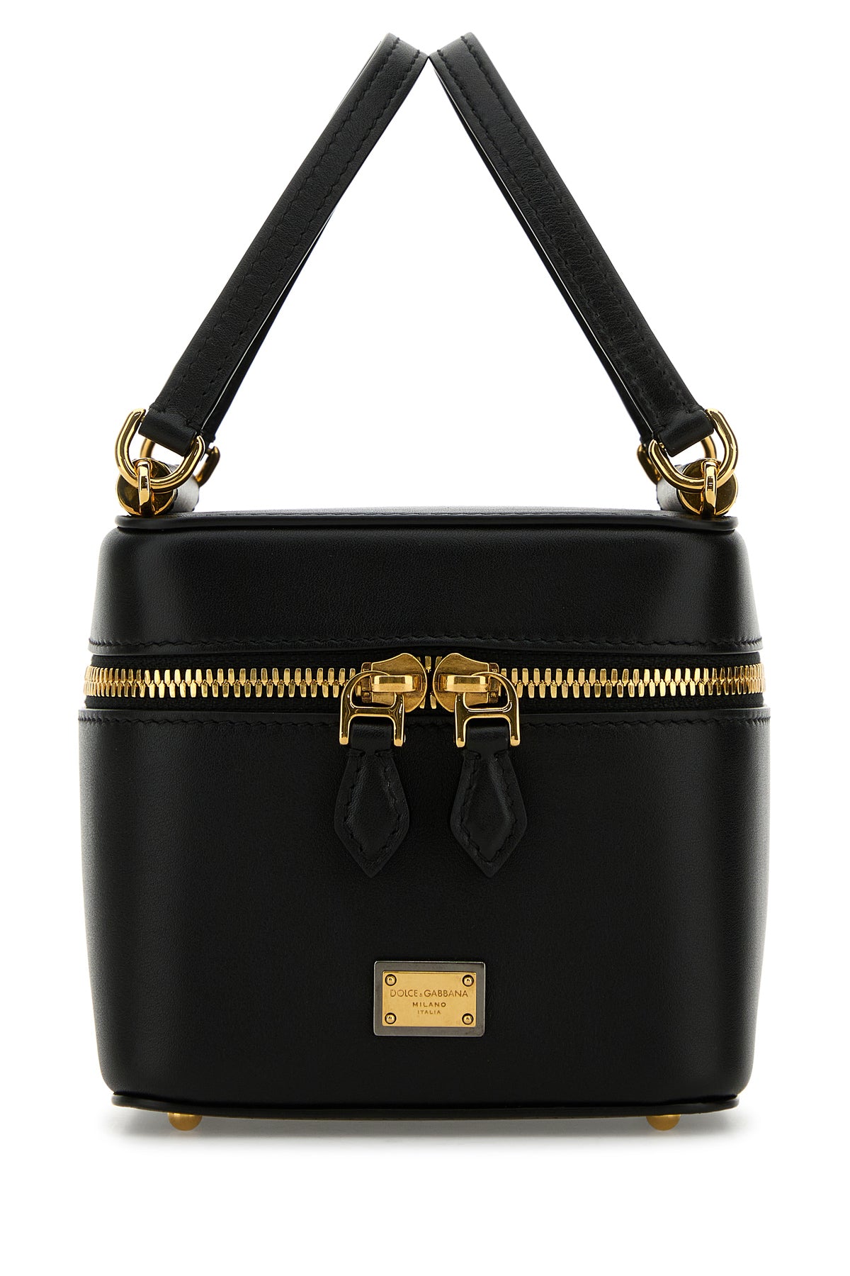 Borsa a mano realizzata in pelle di vitello liscia arricchita da targhetta metallica logata sulla parte frontale.