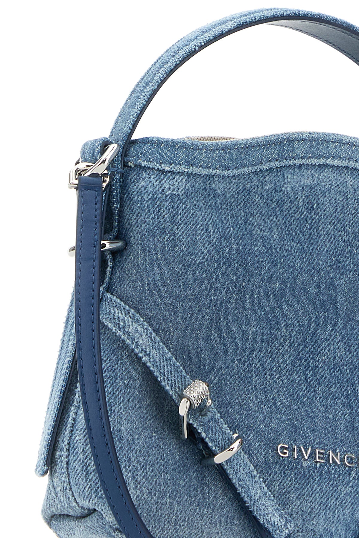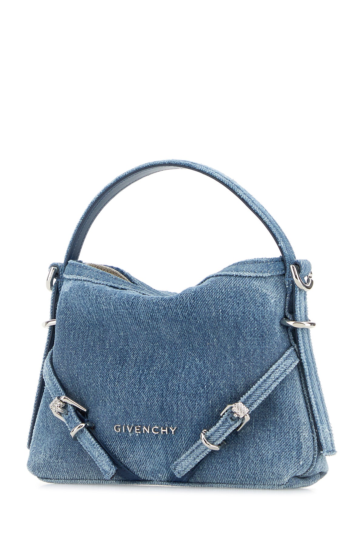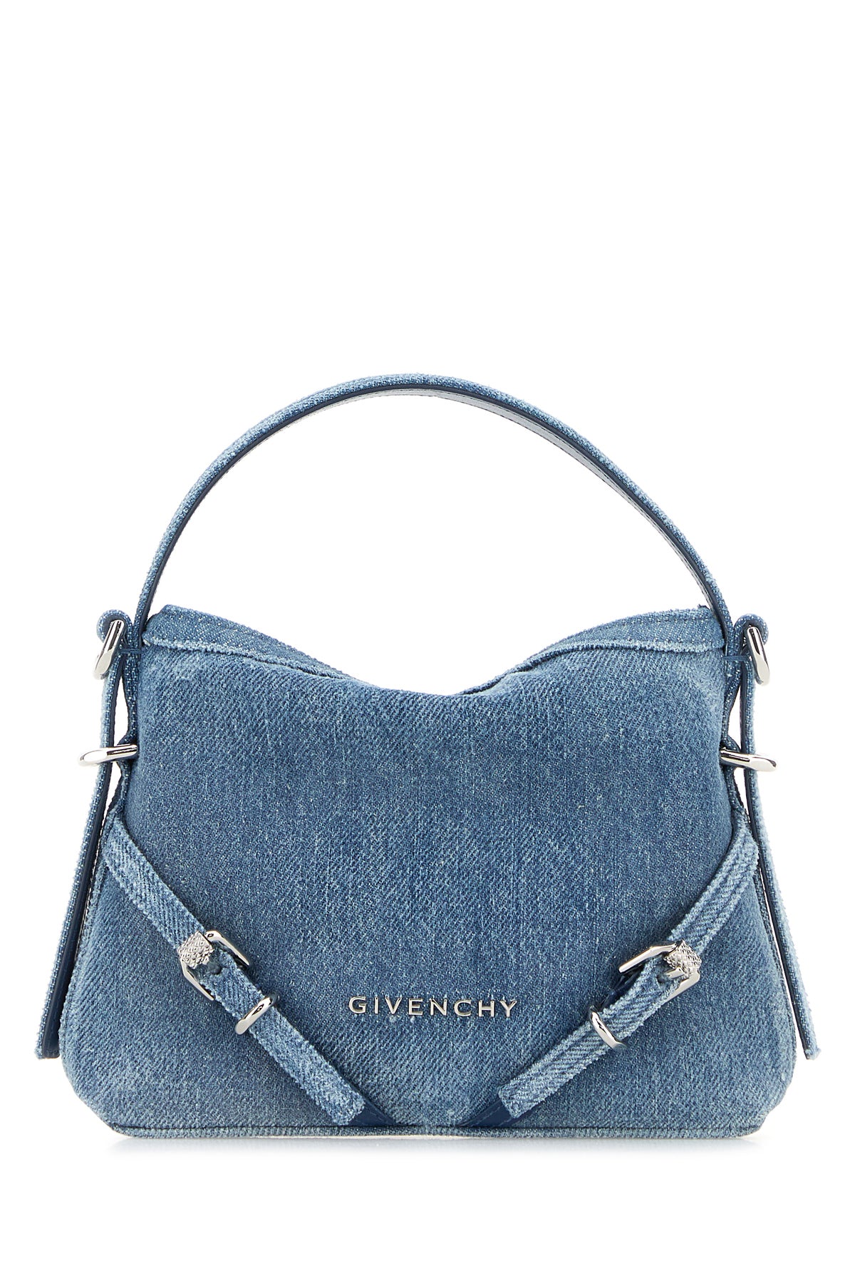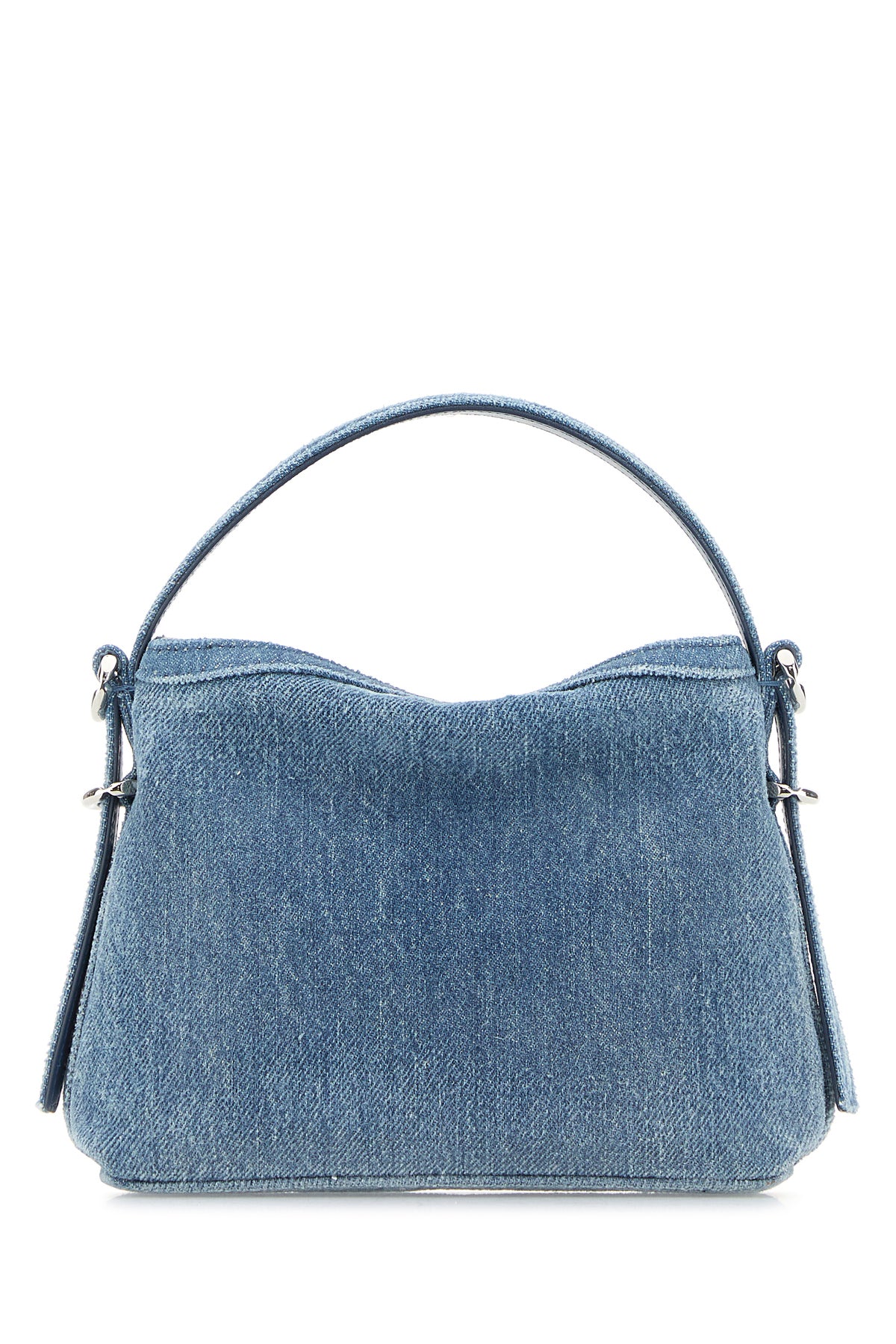 Borsa a mano realizzata in denim di puro cotone leggermente slavato arricchita da logo in lettere metalliche e cinturini decorativi sulla parte frontale.