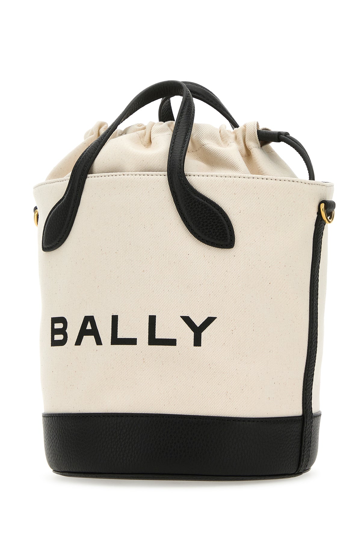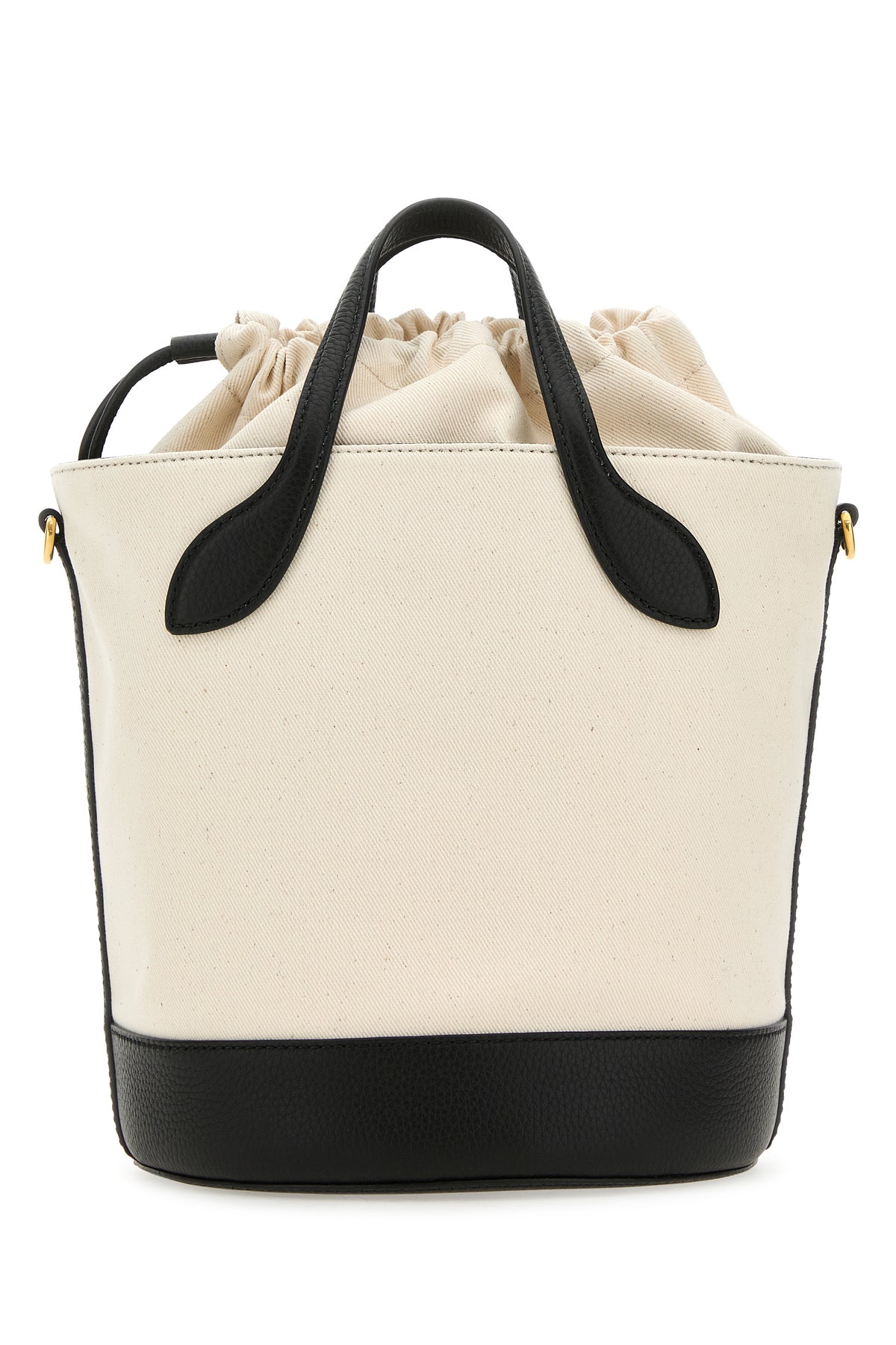 Borsa a secchiello realizzata in tela con inserti in pelle a contrasto caratterizzata da stampa logata a contrasto sulla parte frontale.