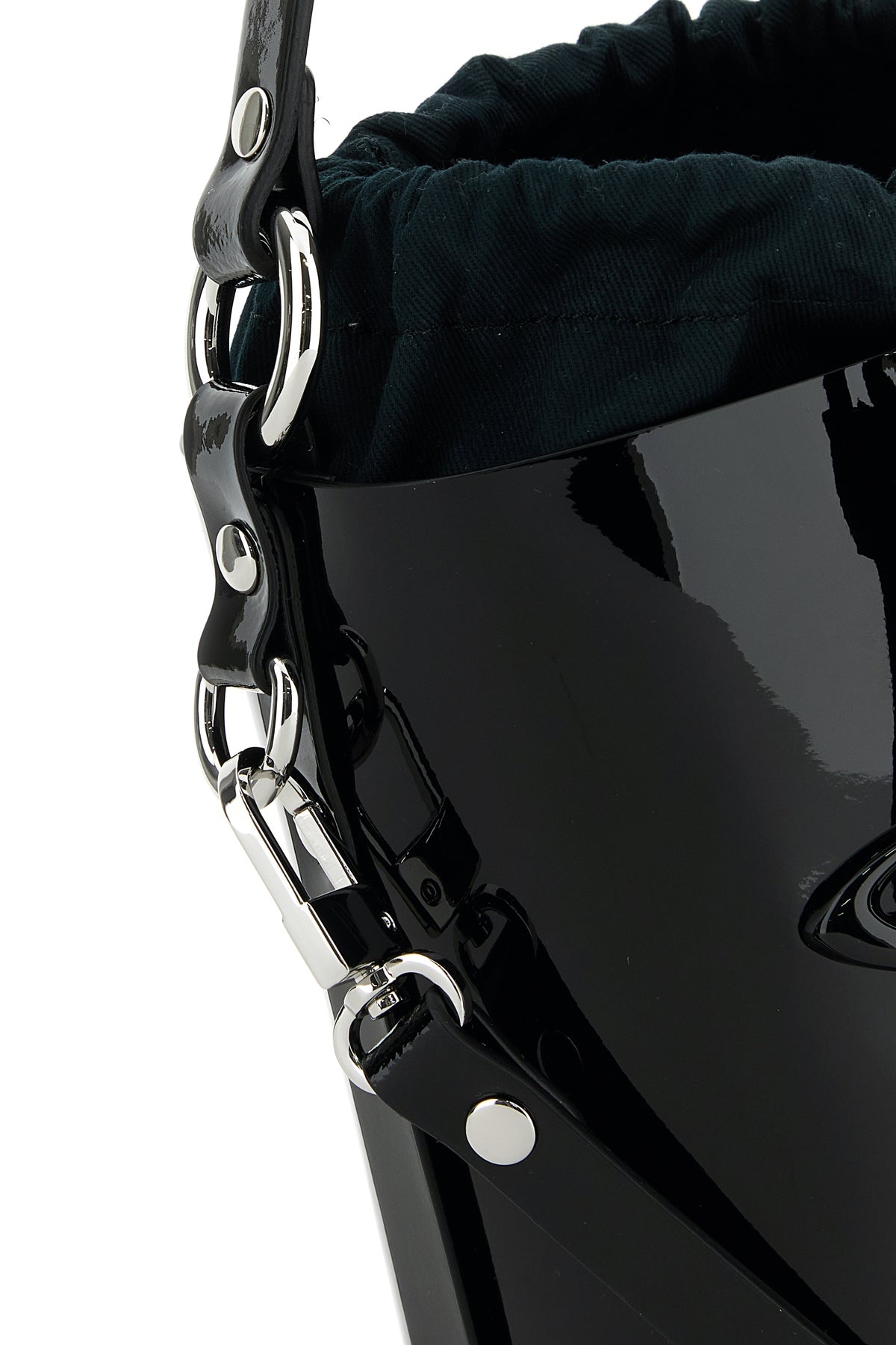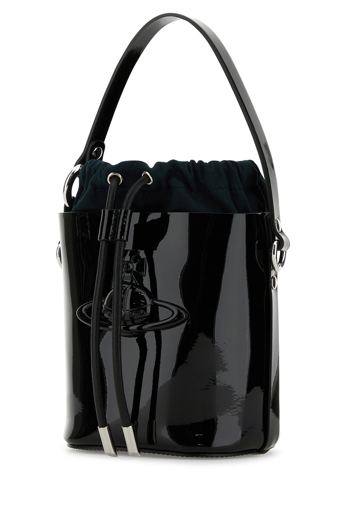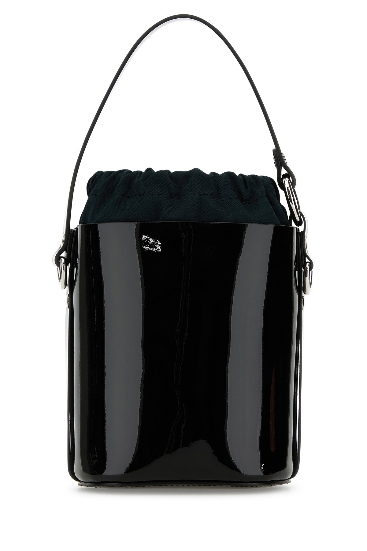 Borsa a secchiello realizzata in pelle verniciata arricchita da dettaglio metallico Orb sulla parte frontale.