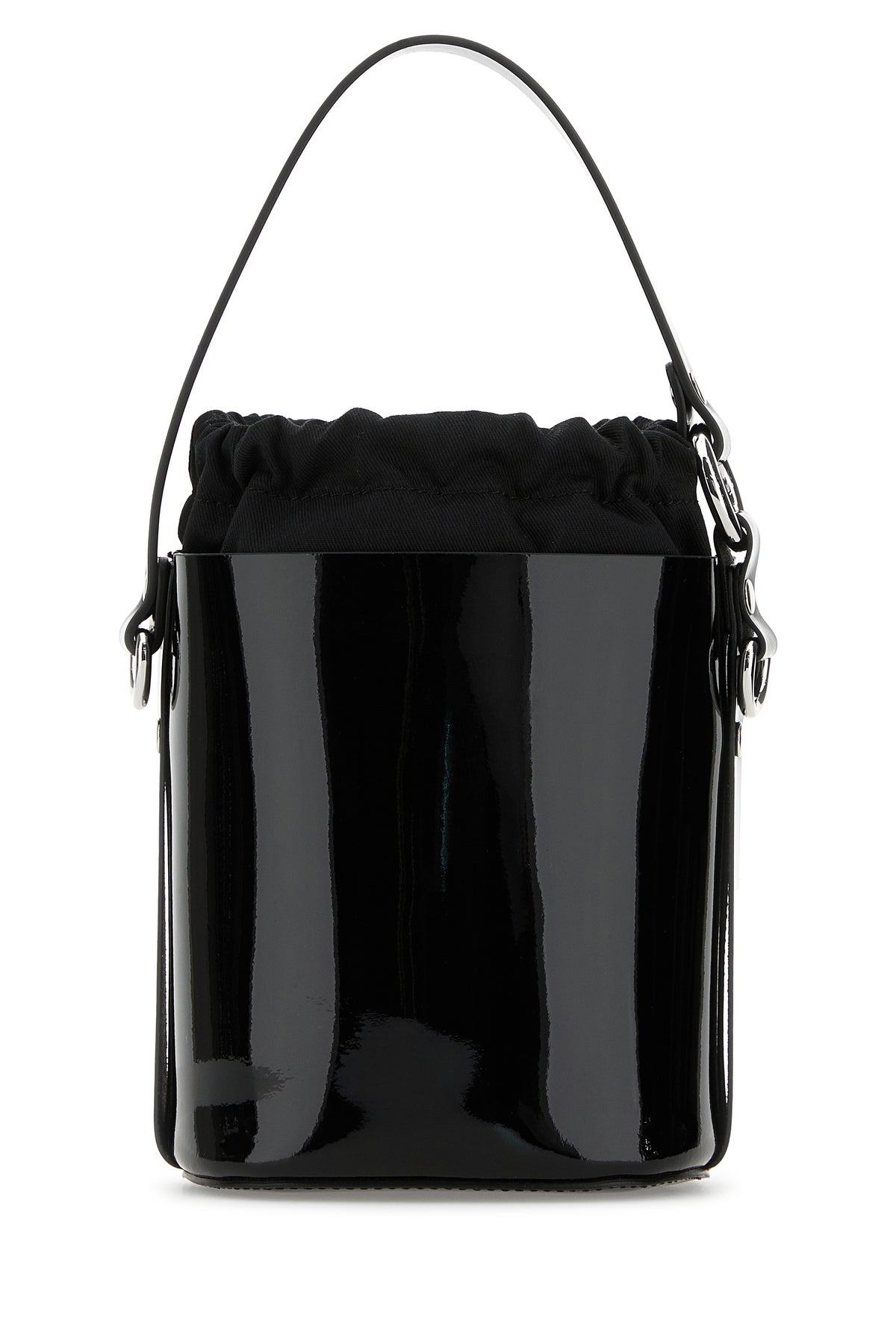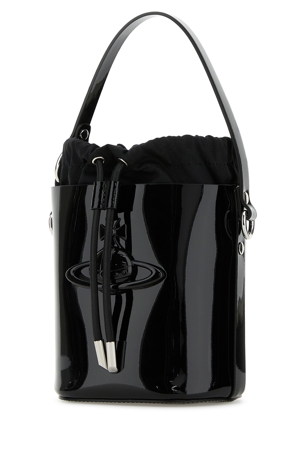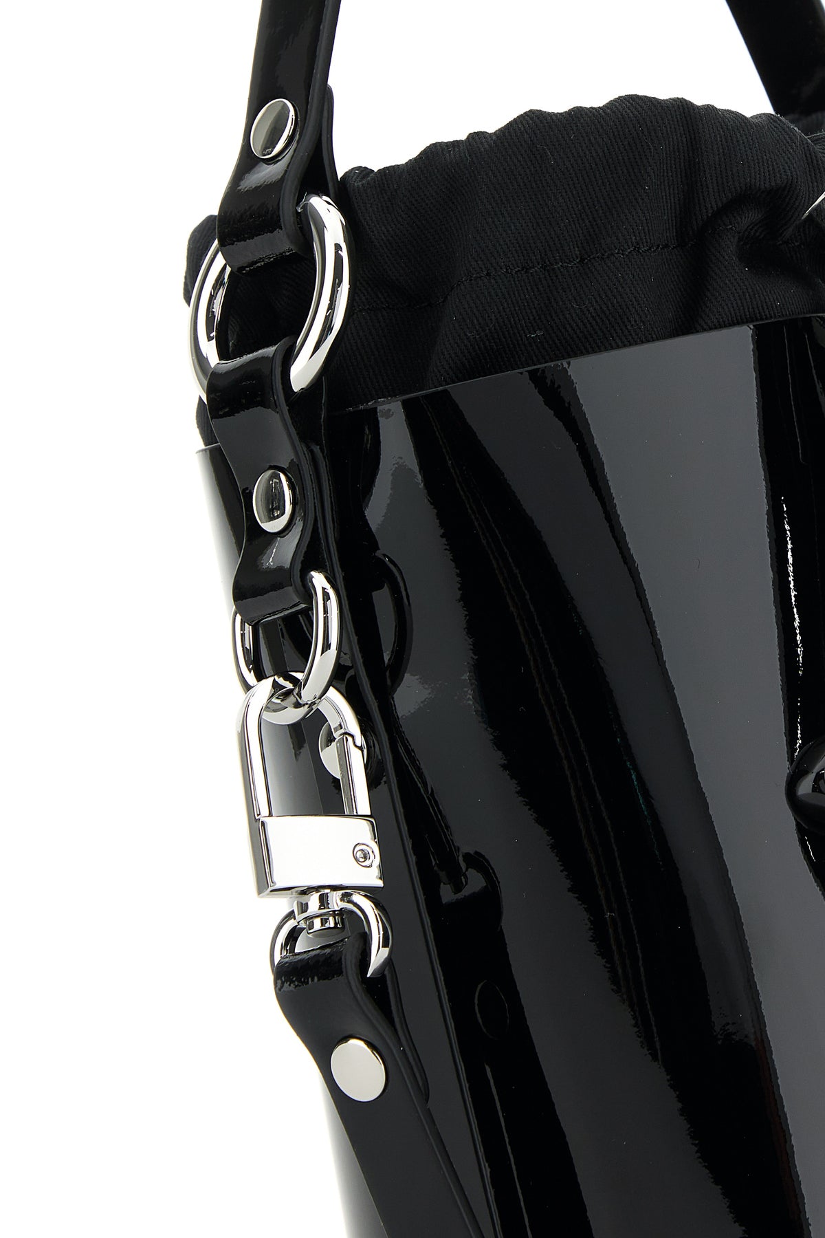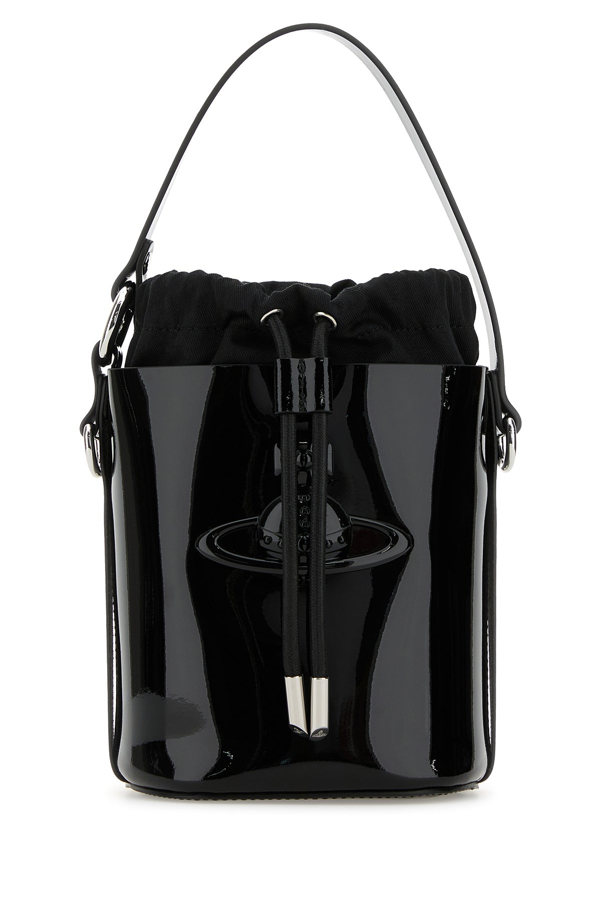 Borsa a secchiello realizzata in pelle verniciata arricchita da dettaglio metallico Orb sulla parte frontale.