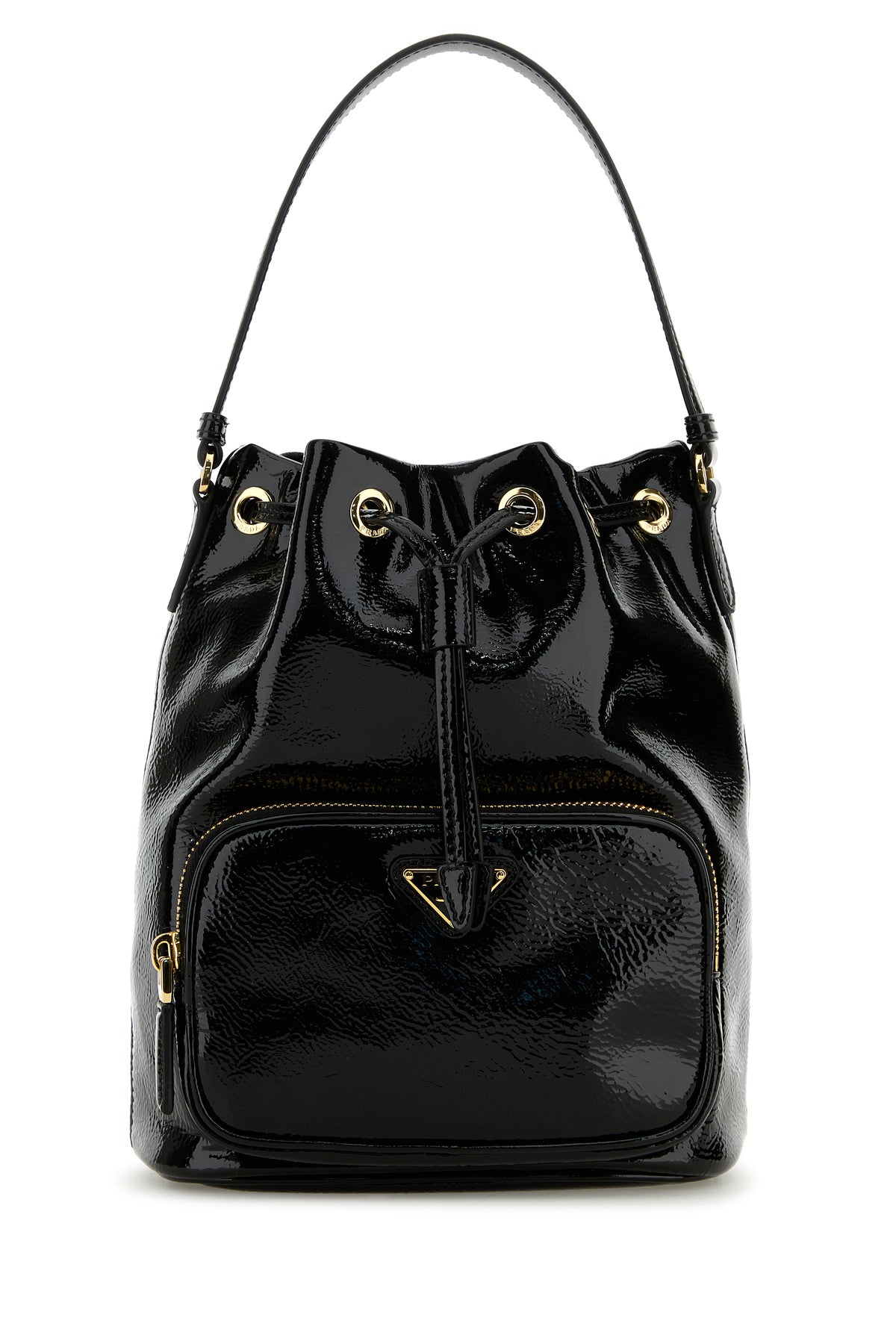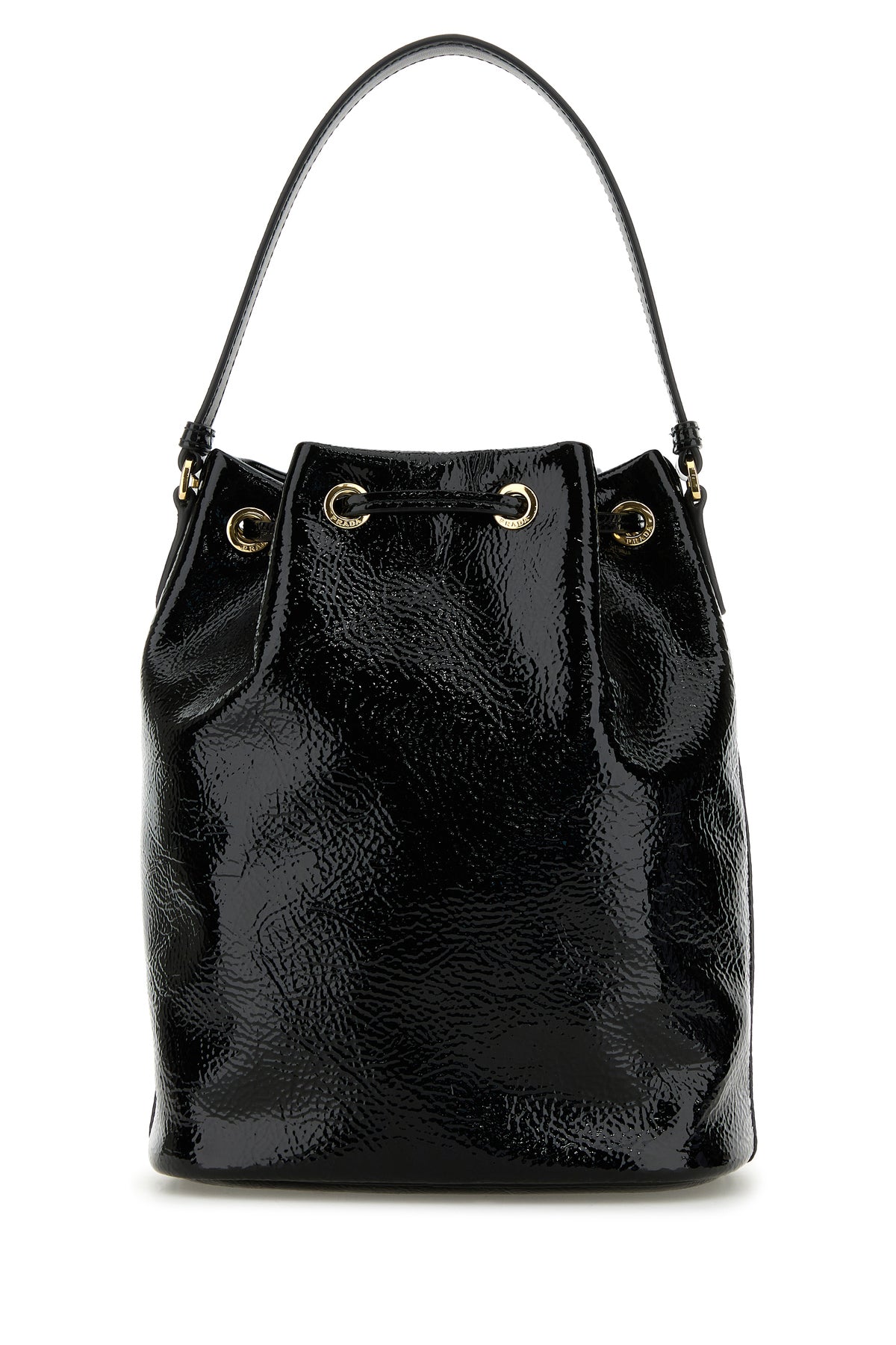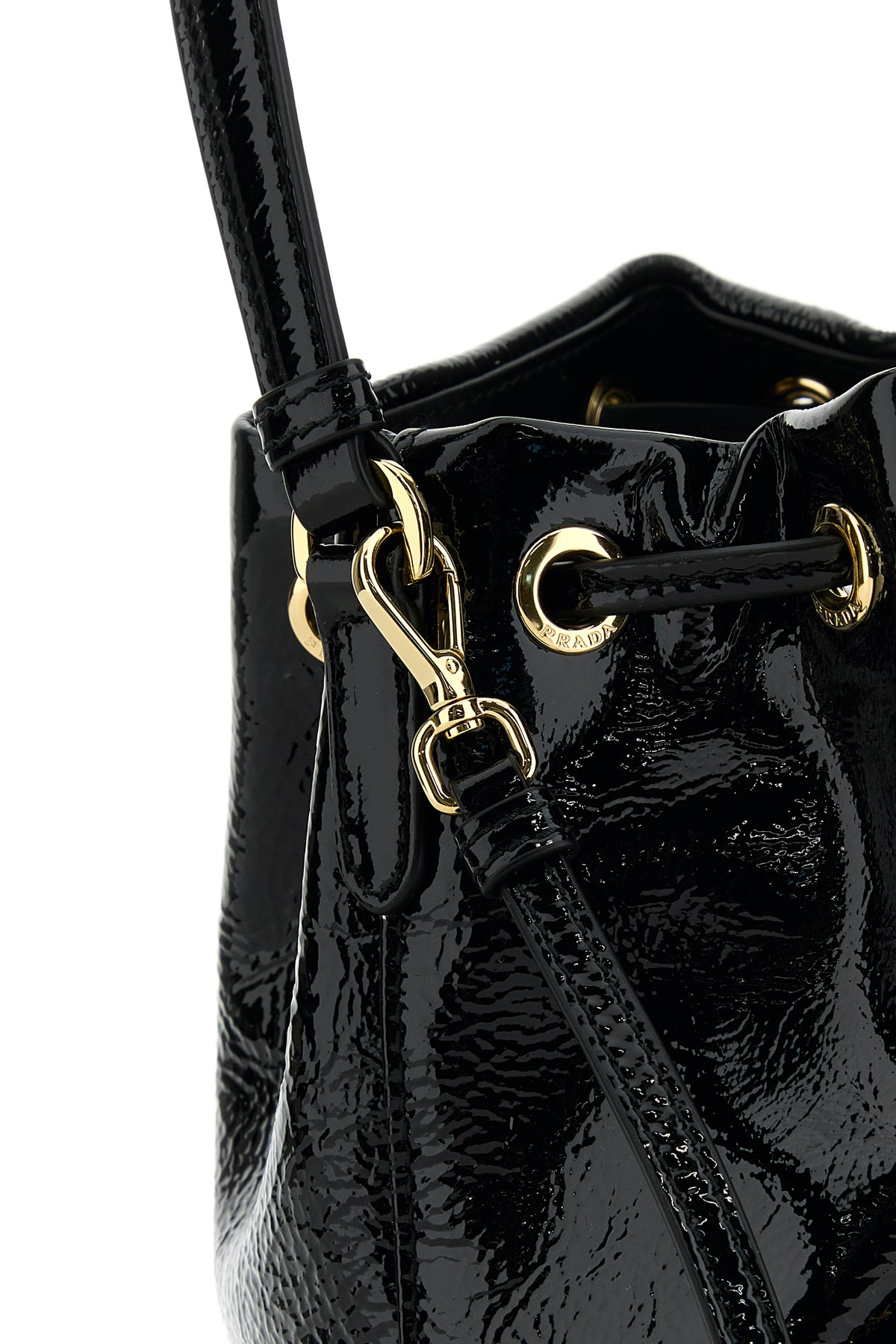 Borsa a secchiello realizzata in naplak martellato verniciato arricchita da iconico triangolo logato in metallo e pelle sulla parte frontale.